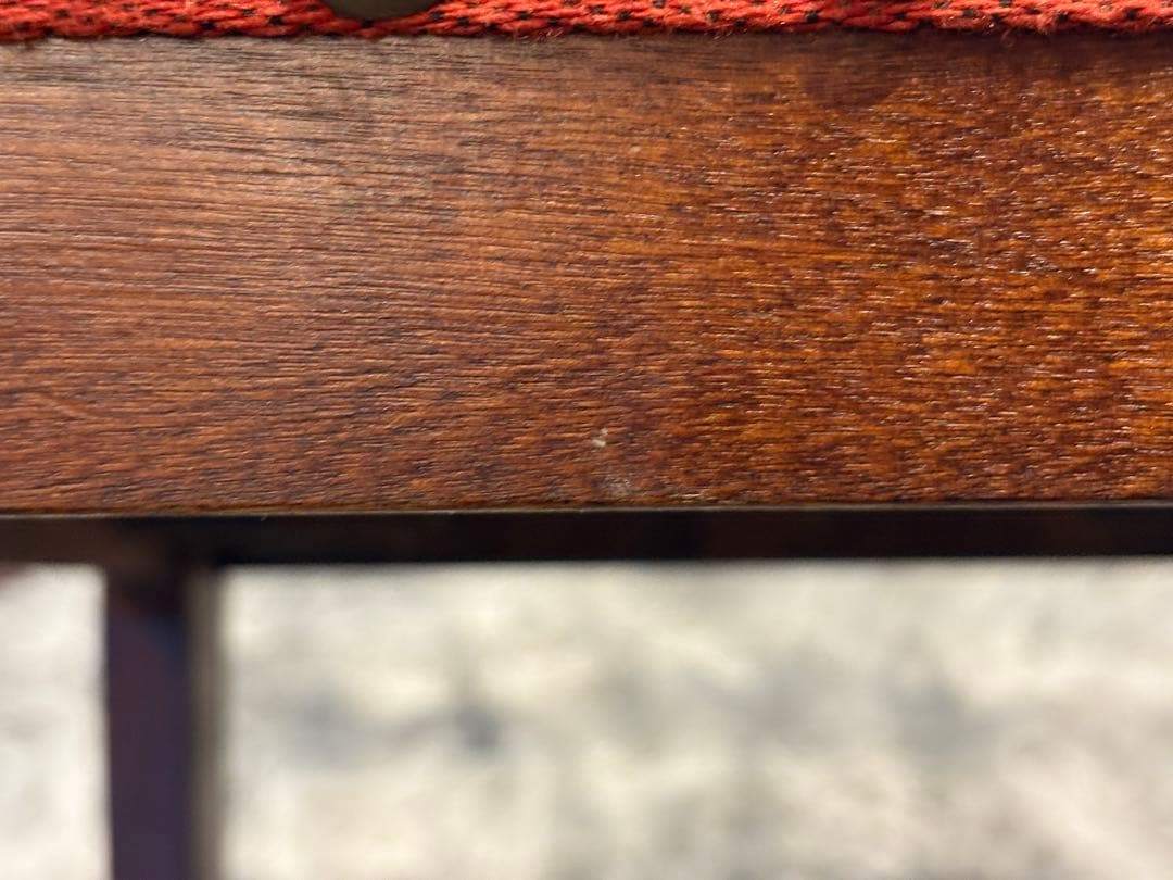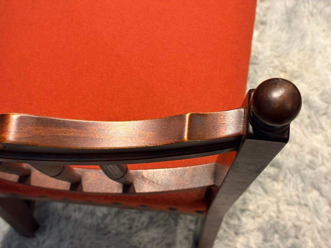 落ち着いた木肌のフレームに、赤みのあるファブリック座面を組み合わせ、