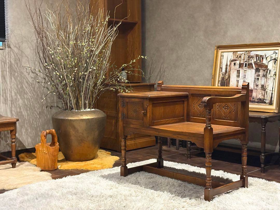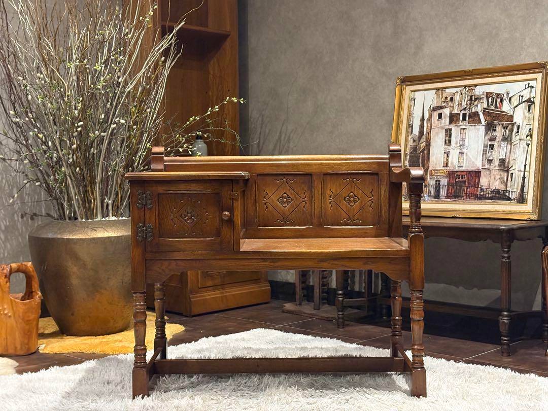イギリスのクラシックな暮らしを彷彿とさせる、彫刻装飾が美しいテレフォンベンチ。