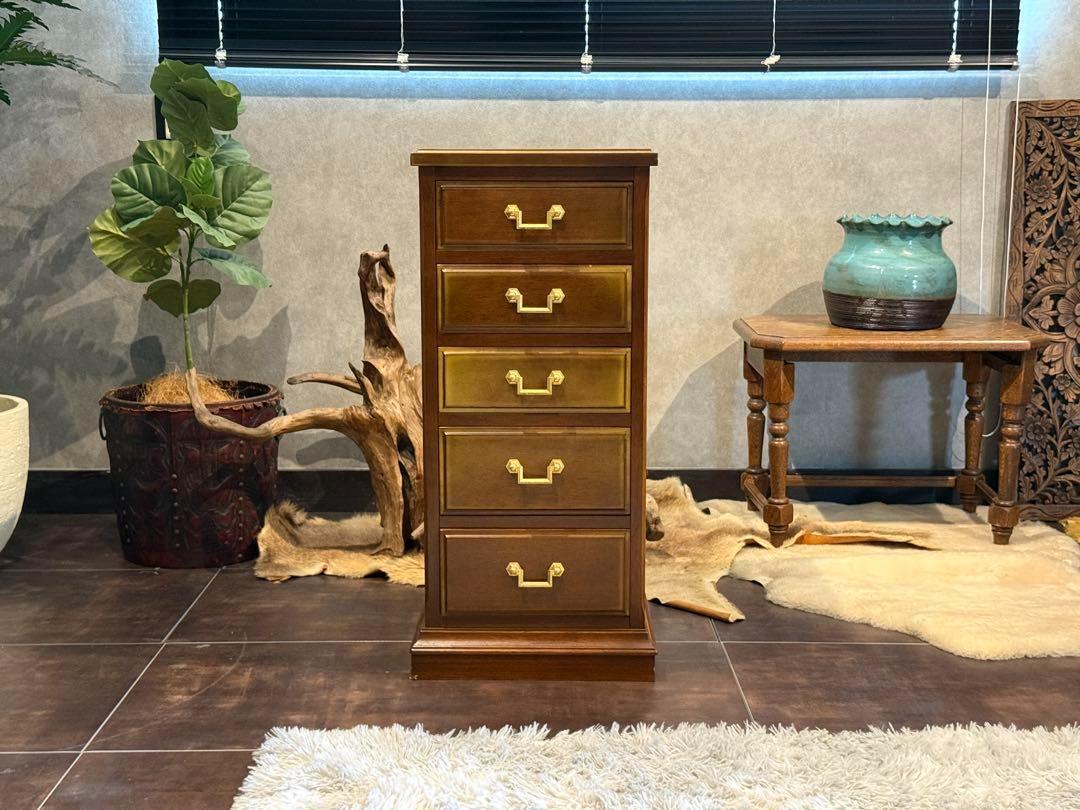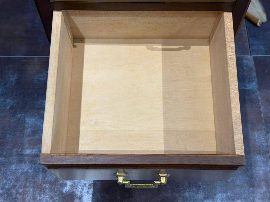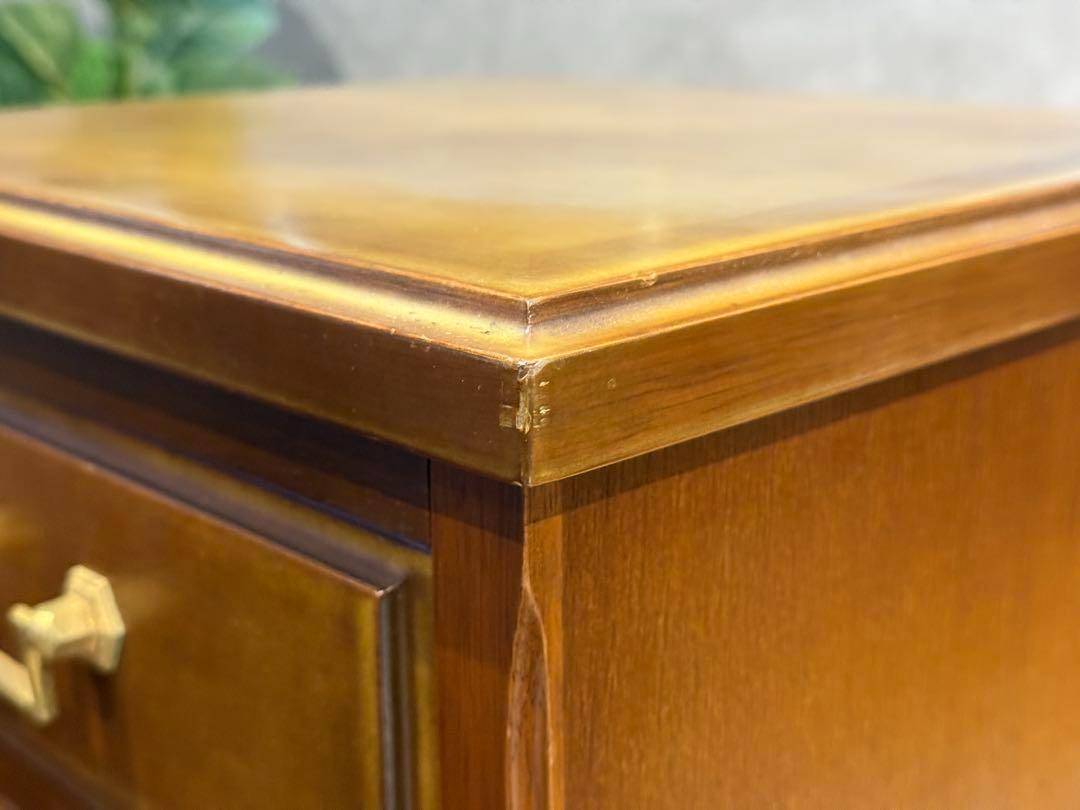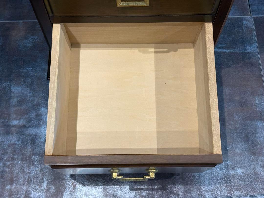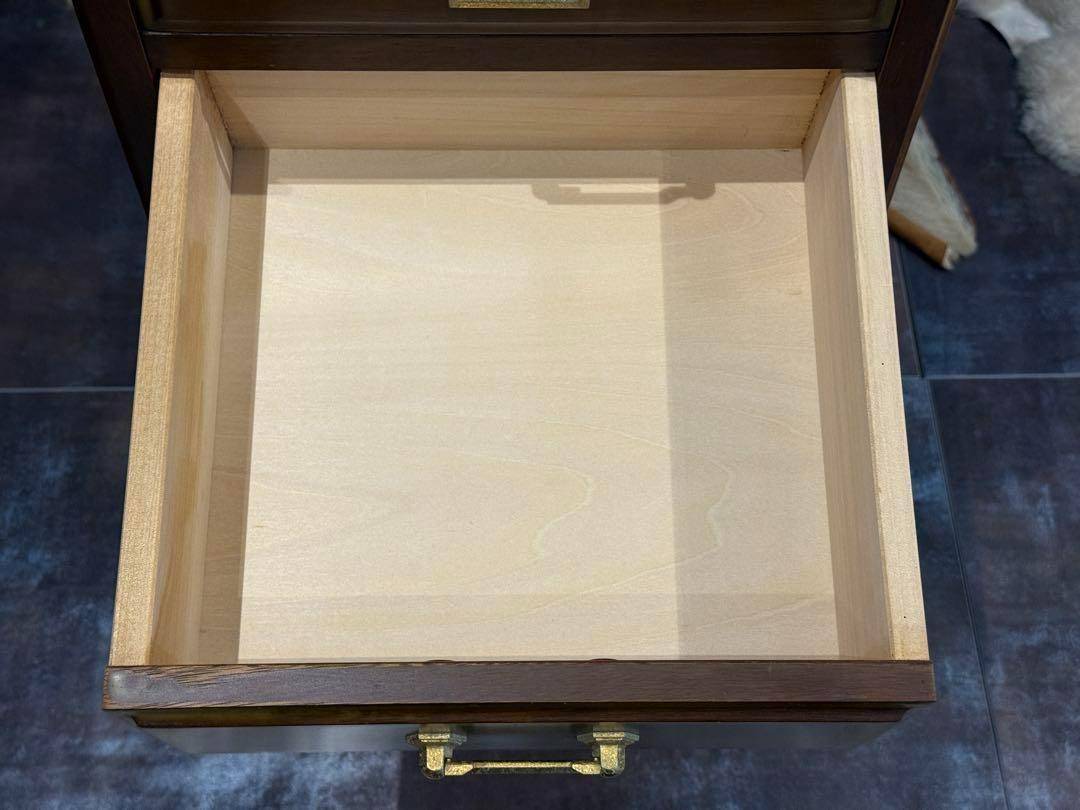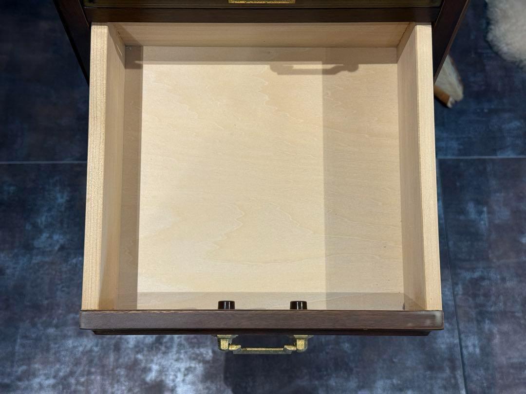 クラシックな真鍮取手と上質な木肌が特徴で、重厚感と気品を備えた逸品です。