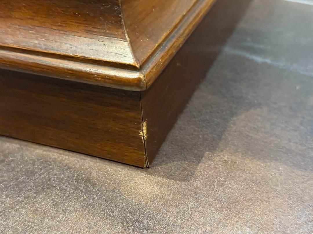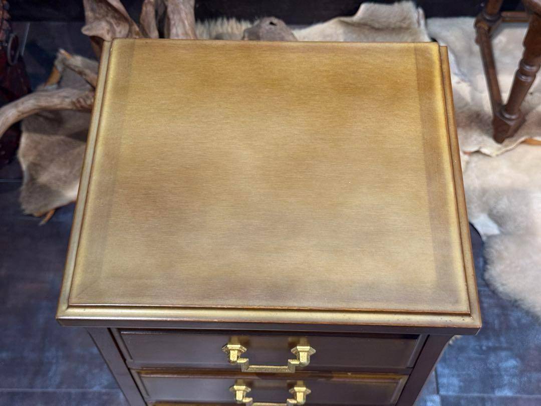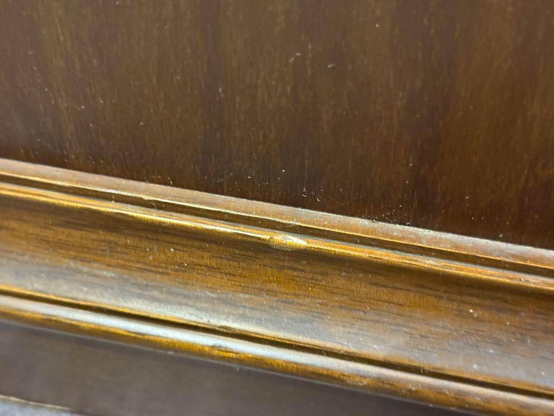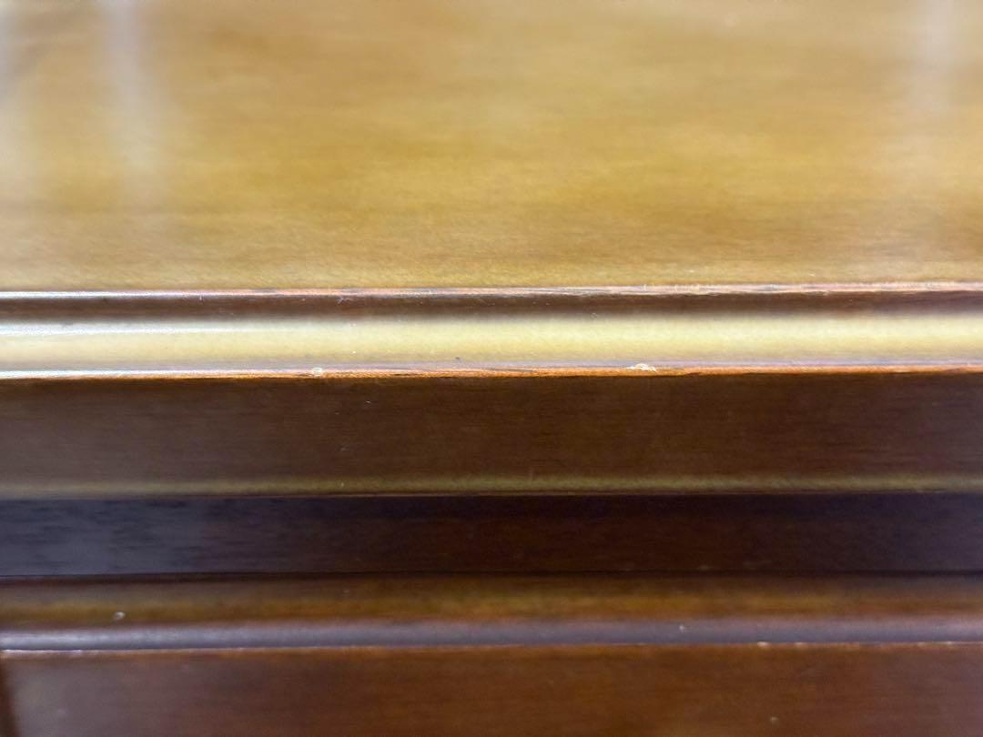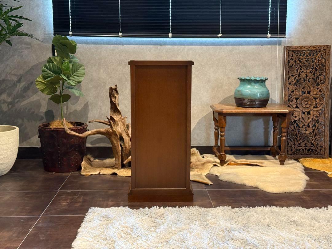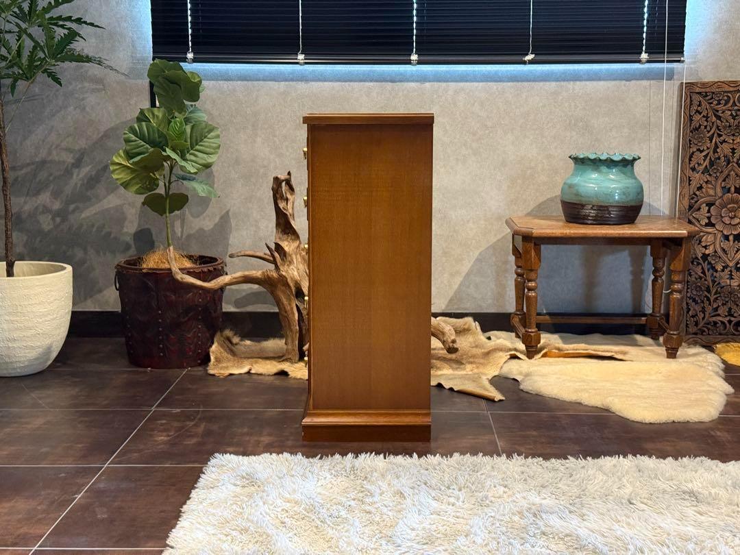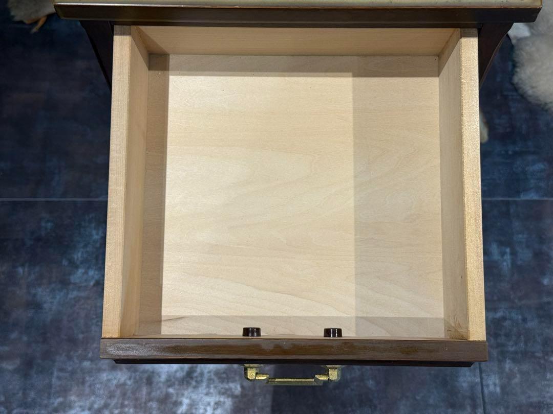 クラシックな真鍮取手と上質な木肌が特徴で、重厚感と気品を備えた逸品です。