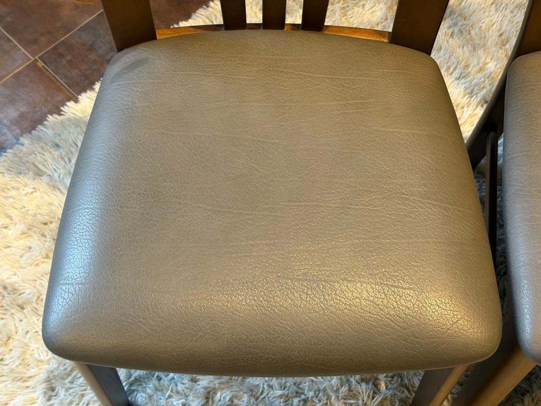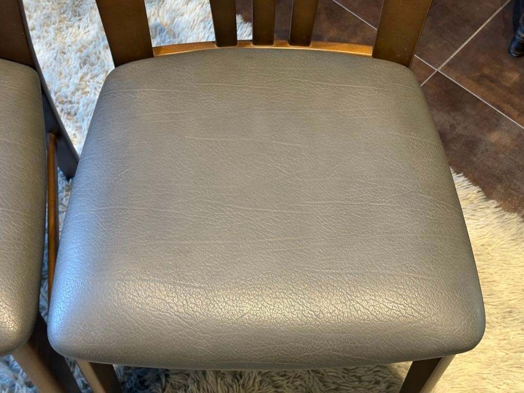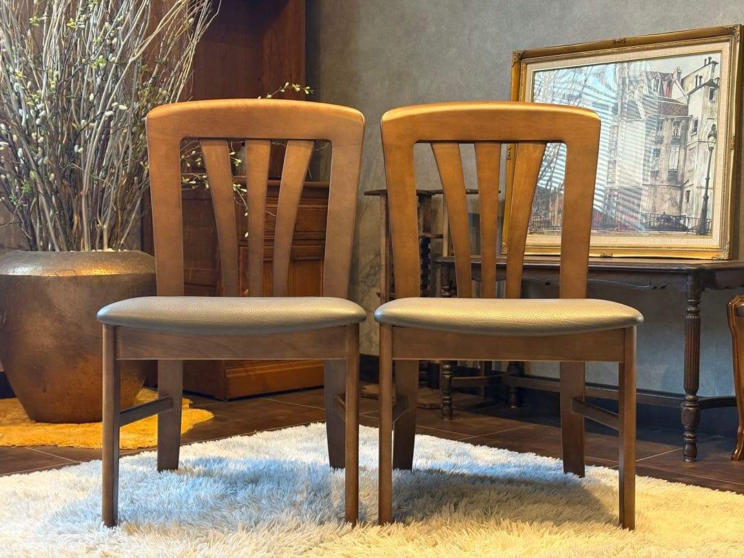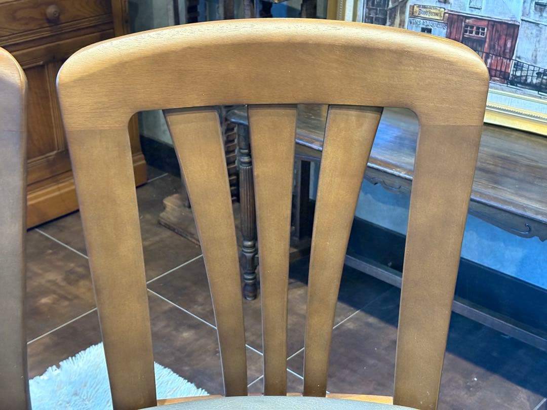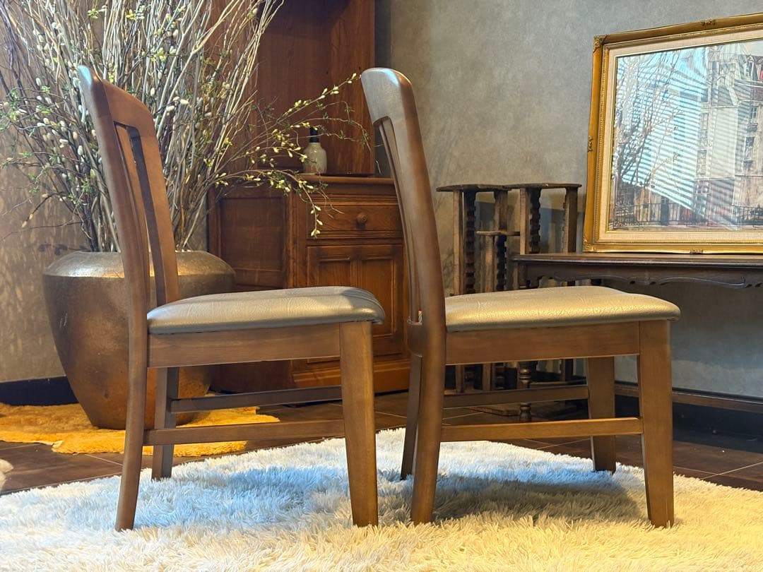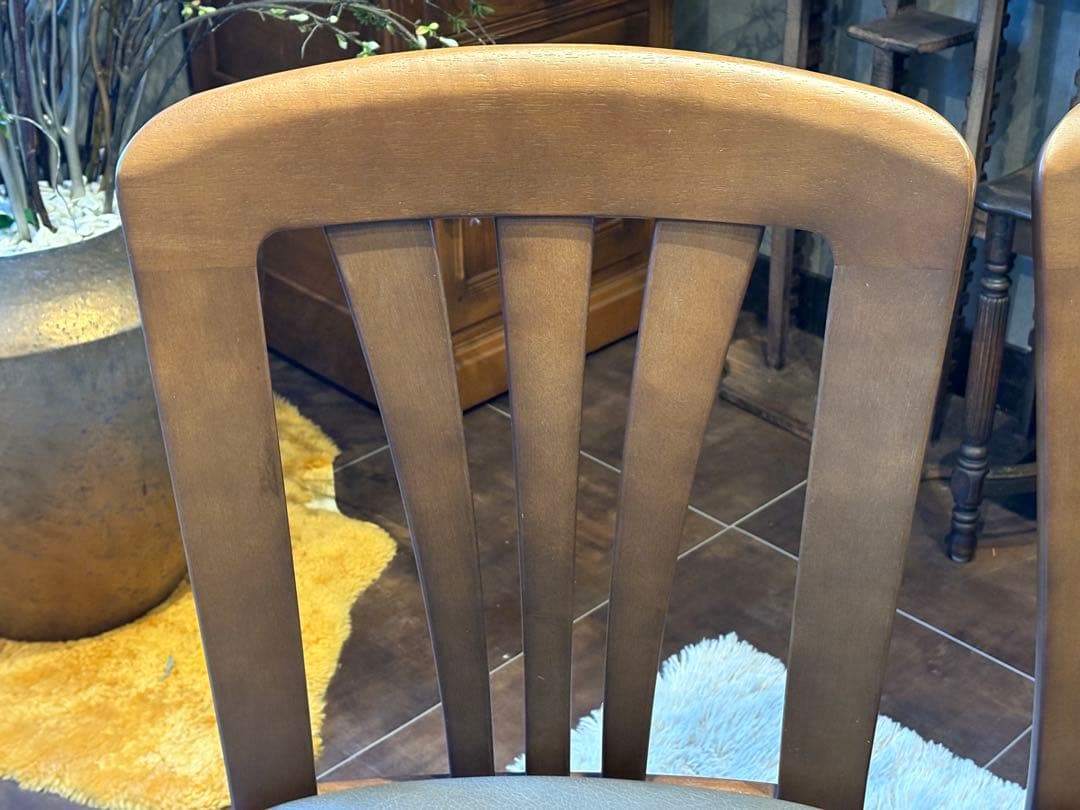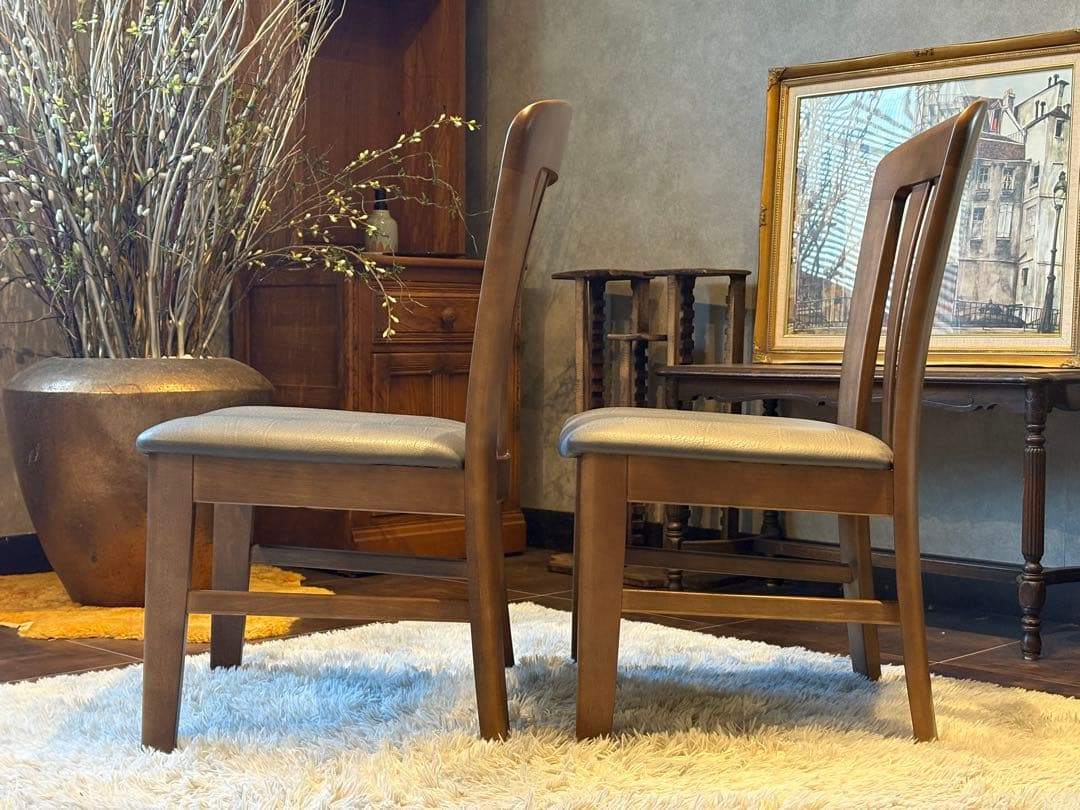 木製フレームの温もりと、合皮レザー座面の上品な光沢が美しく調和しています。