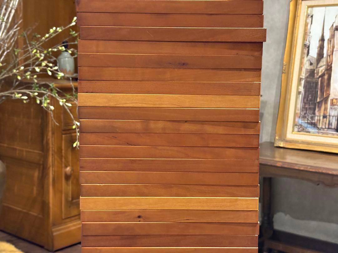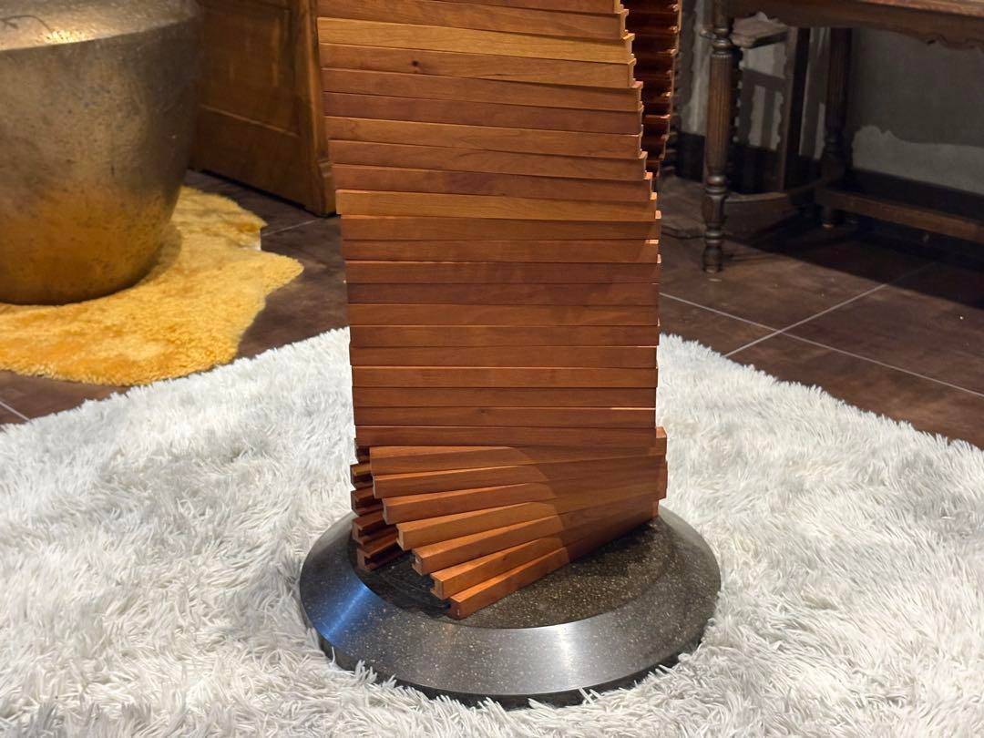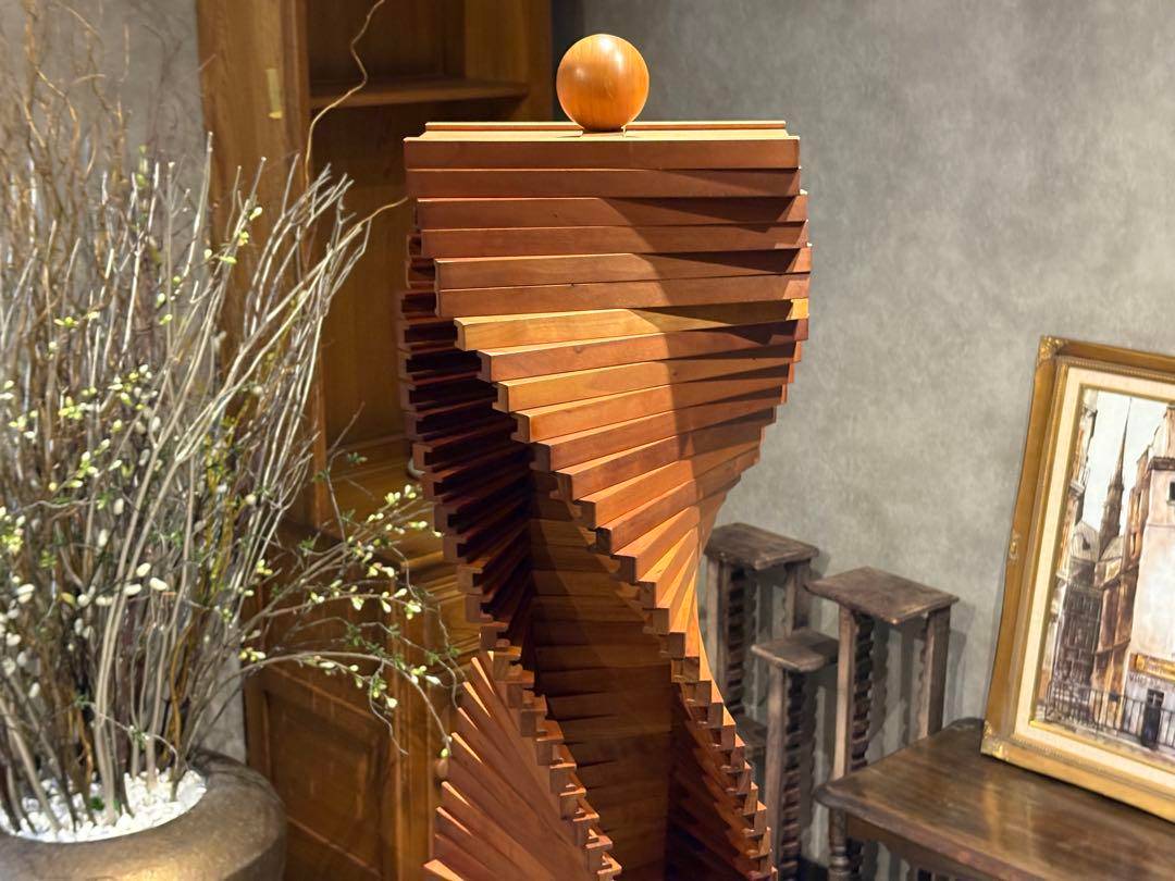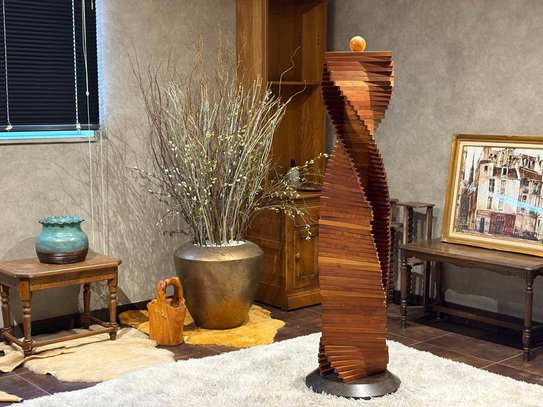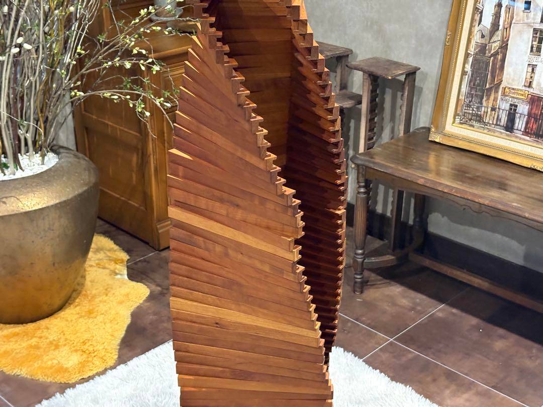 らせん状に組み上げられた立体構造は、単なる収納家具の枠を超えた、まさに“機能するアートピース”と呼ぶにふさわしい仕上がりです。