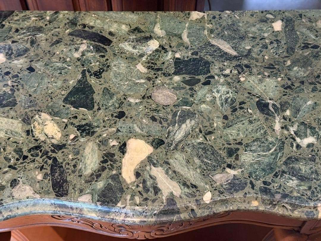 天板にはグリーン系の大理石(ビリジアン)が贅沢に使用されており、空間に深みと品格を与えてくれます。