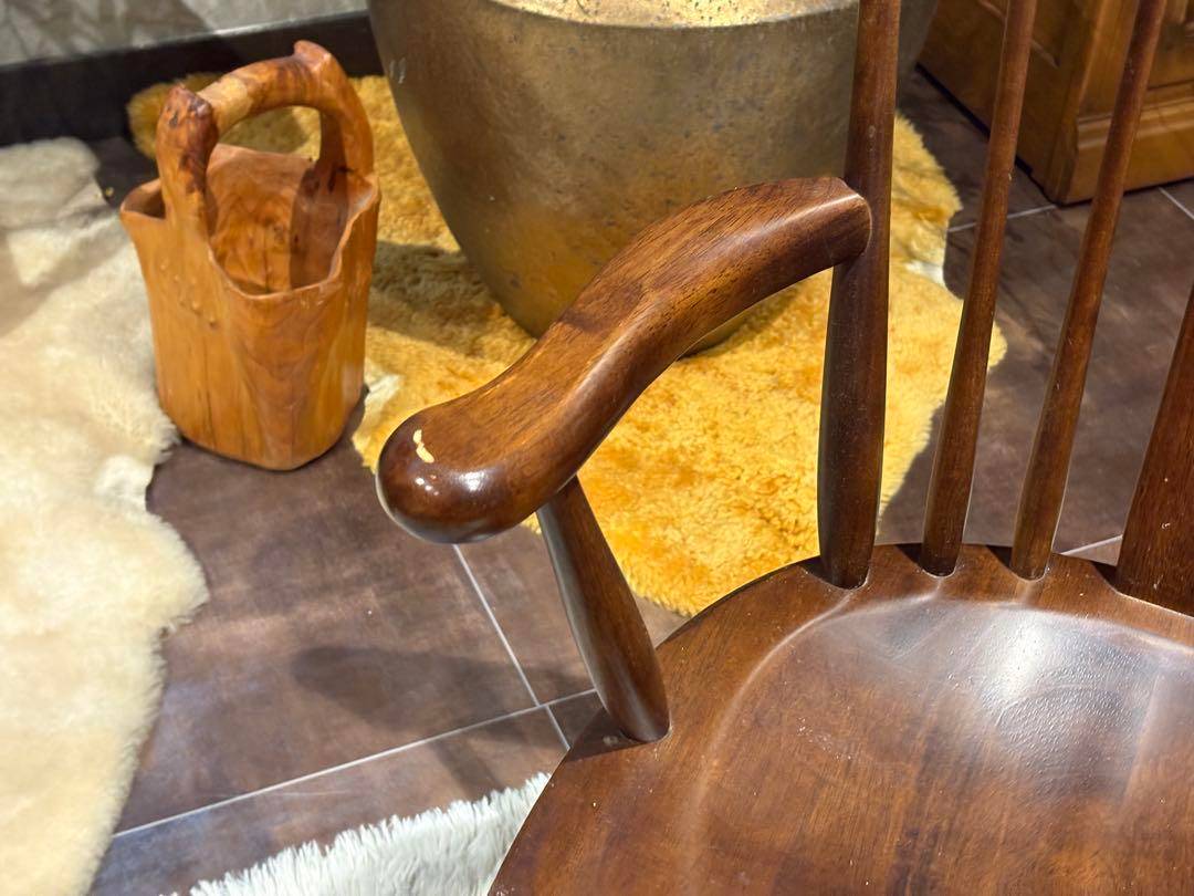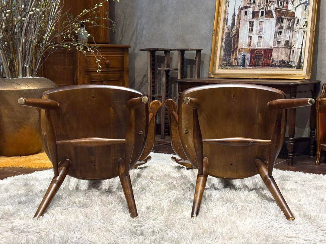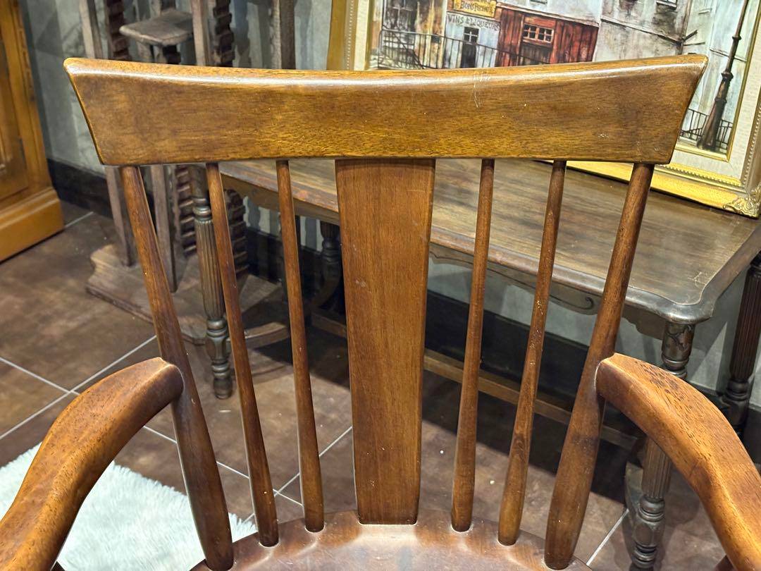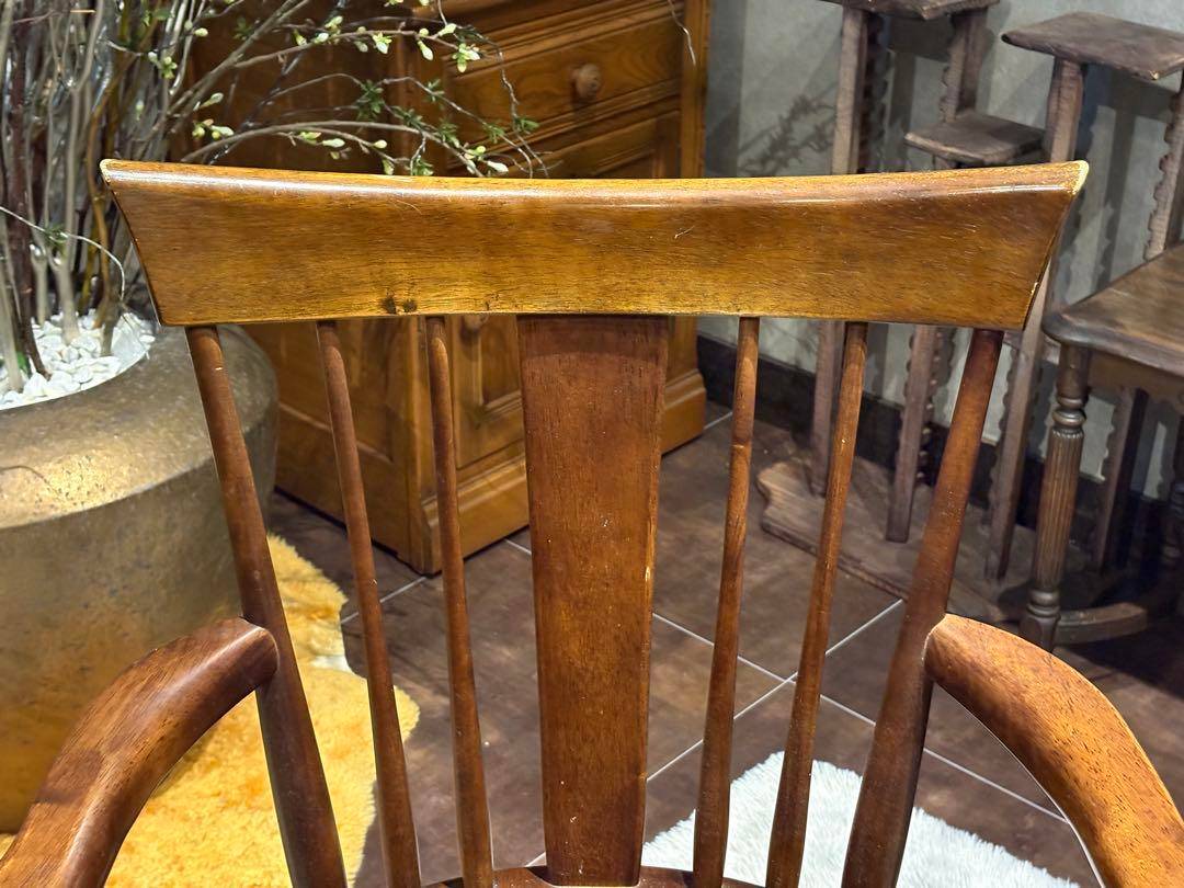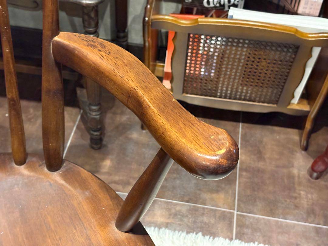 背もたれのスポークと滑らかなアームデザインが特徴的で、アンティークの趣を感じる一脚。