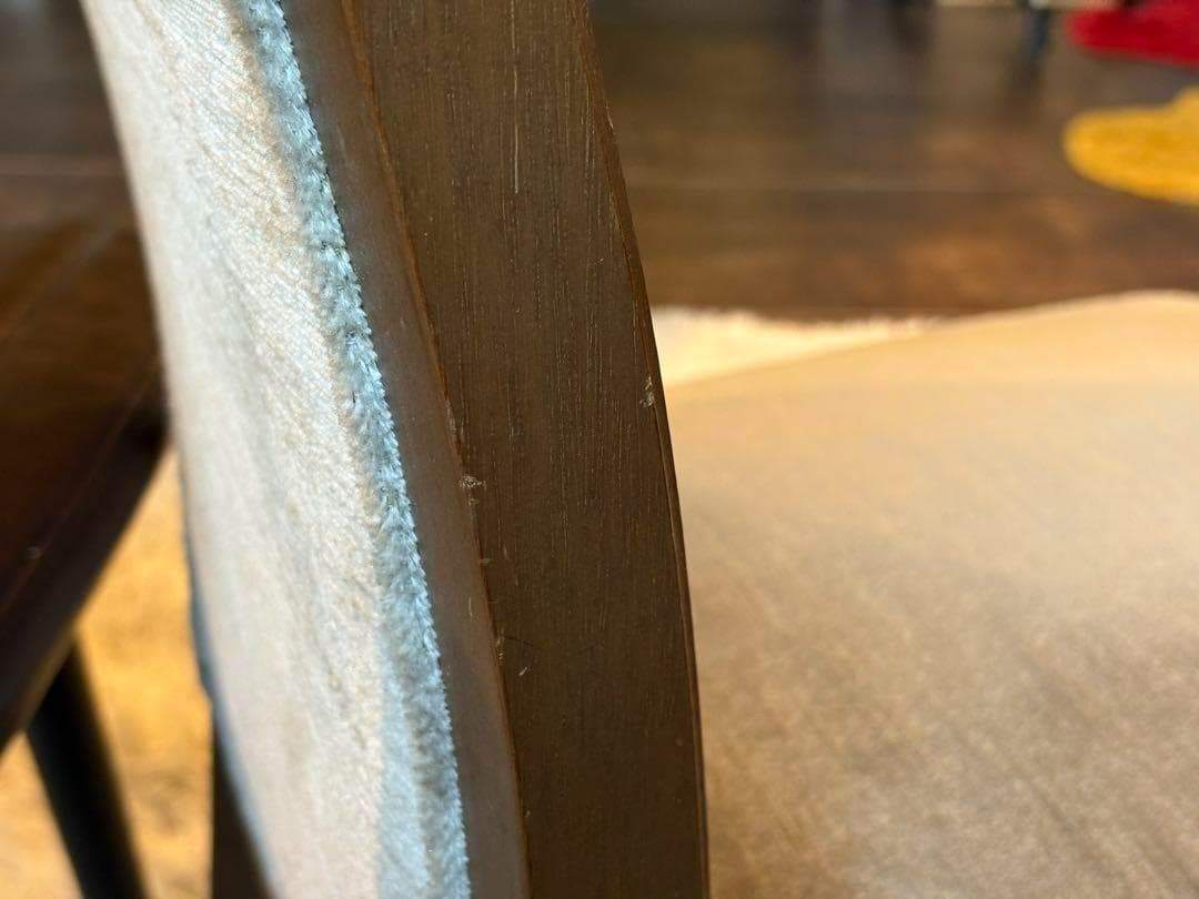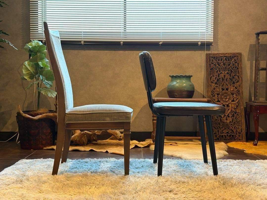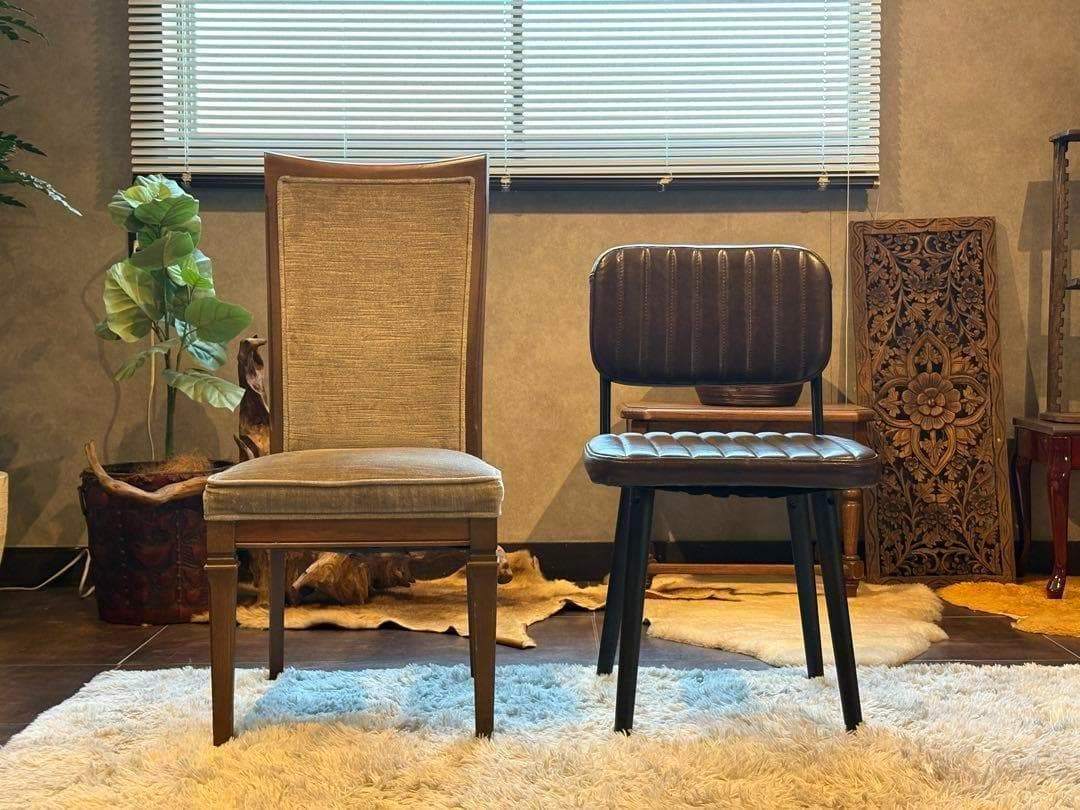 ひとつはクラシカルな布張りチェア、もうひとつはレザー調の合皮チェア。