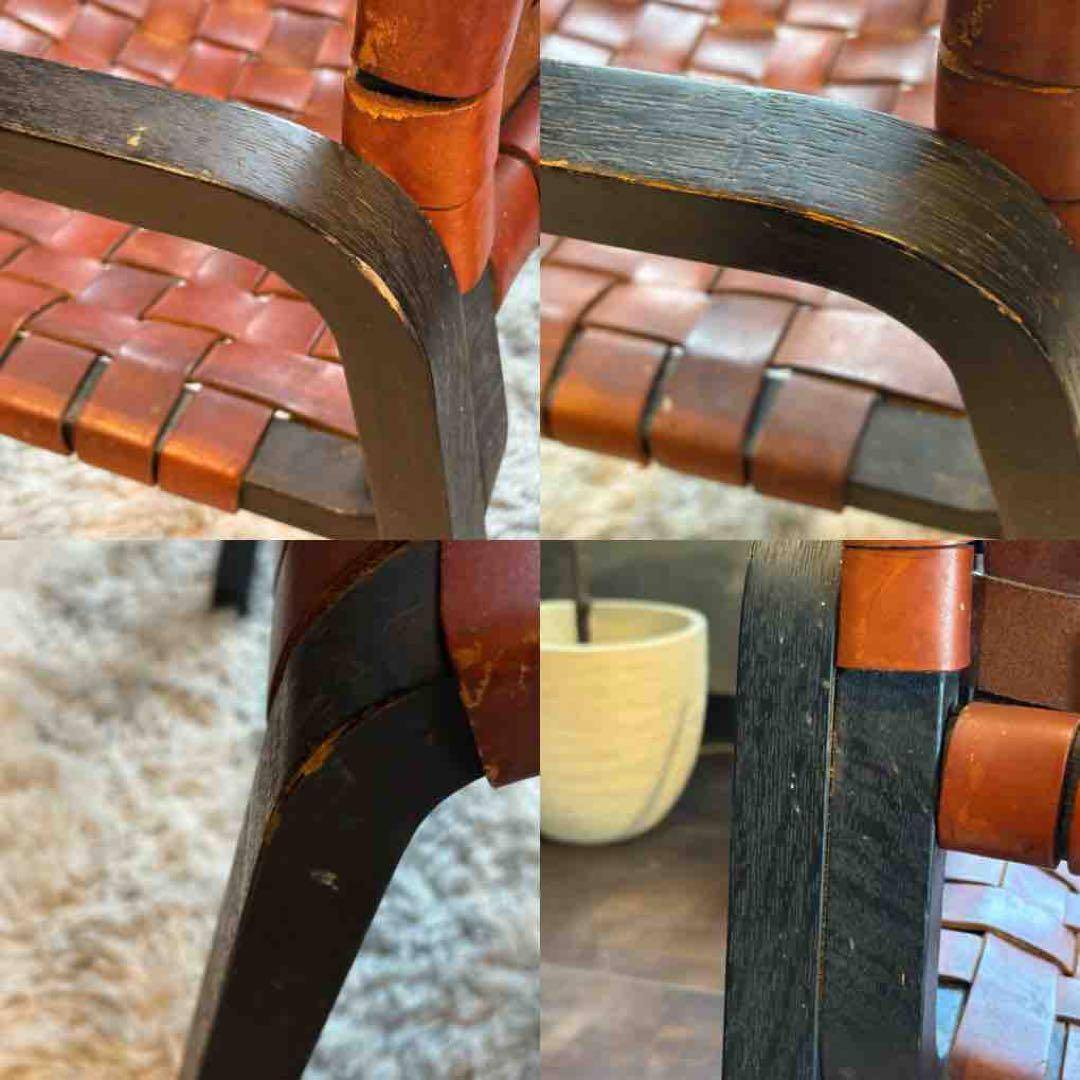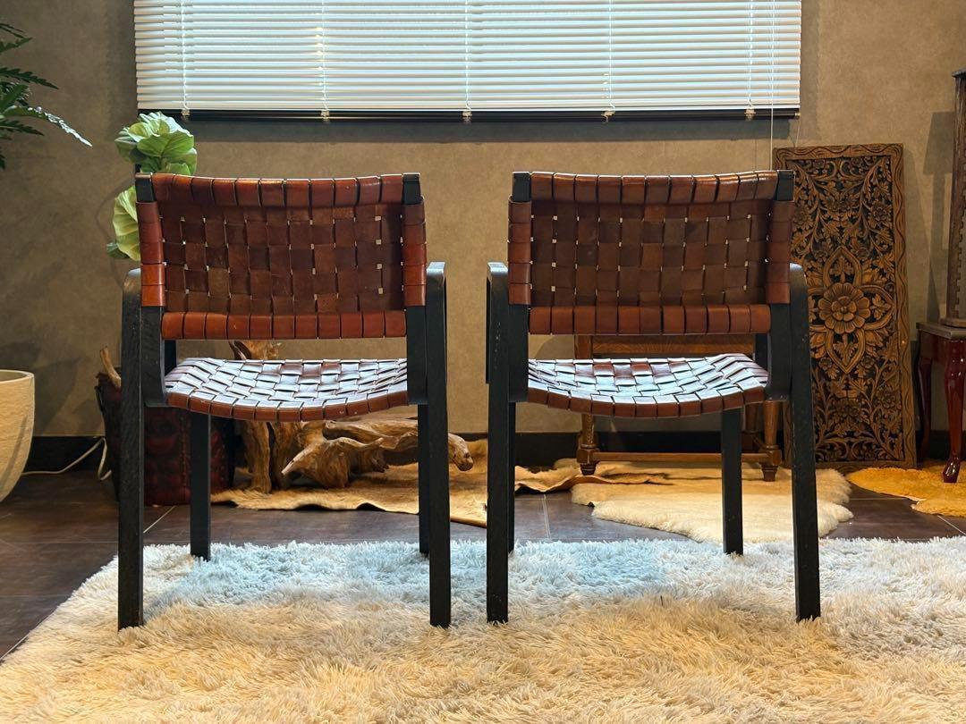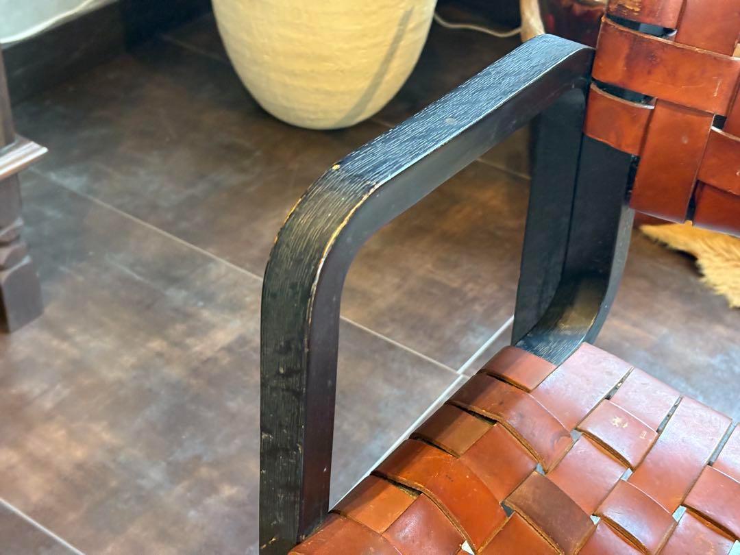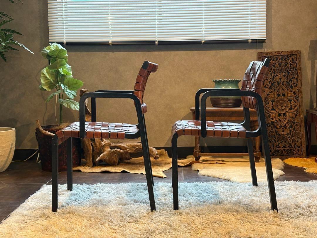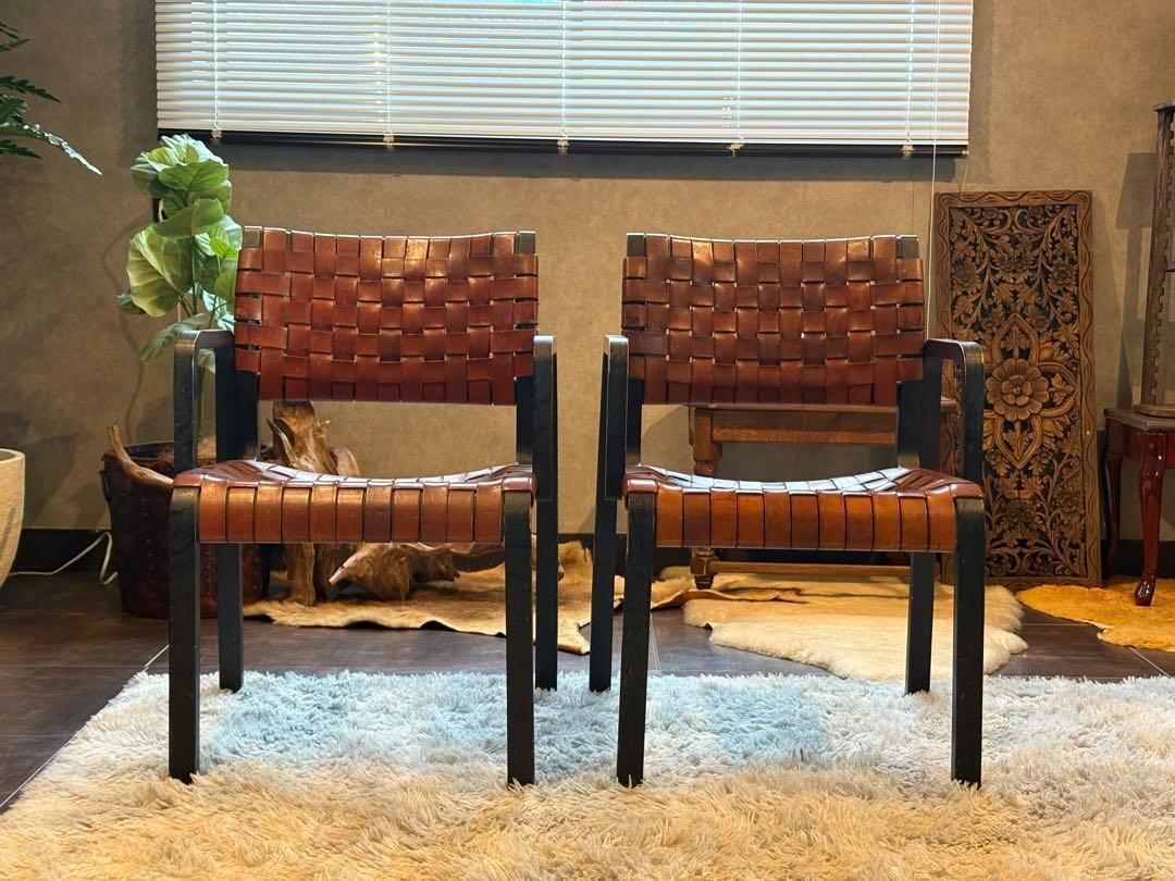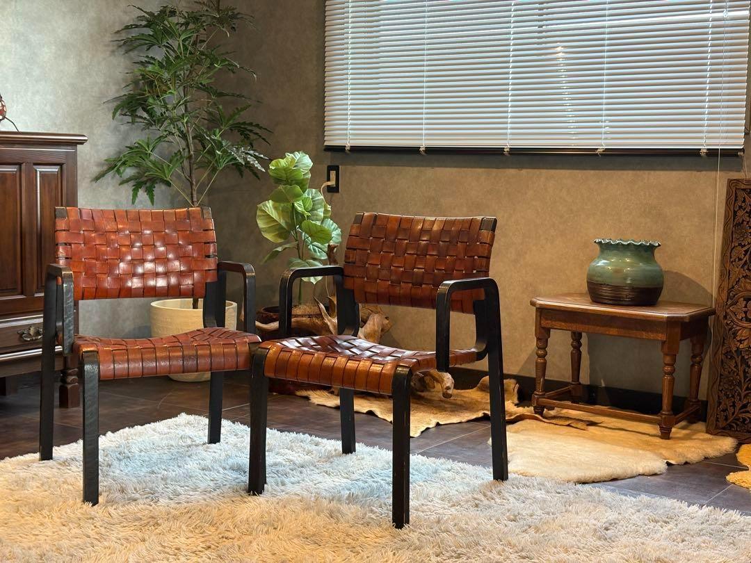 高品質なレザーを丁寧に編み込んだ座面と背もたれが特徴で、ミッドセンチュリーのデザインエッセンスを感じさせます。