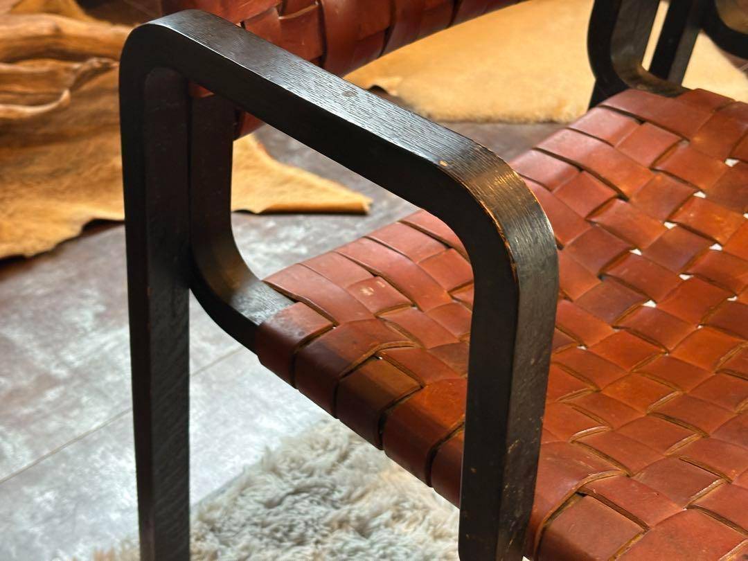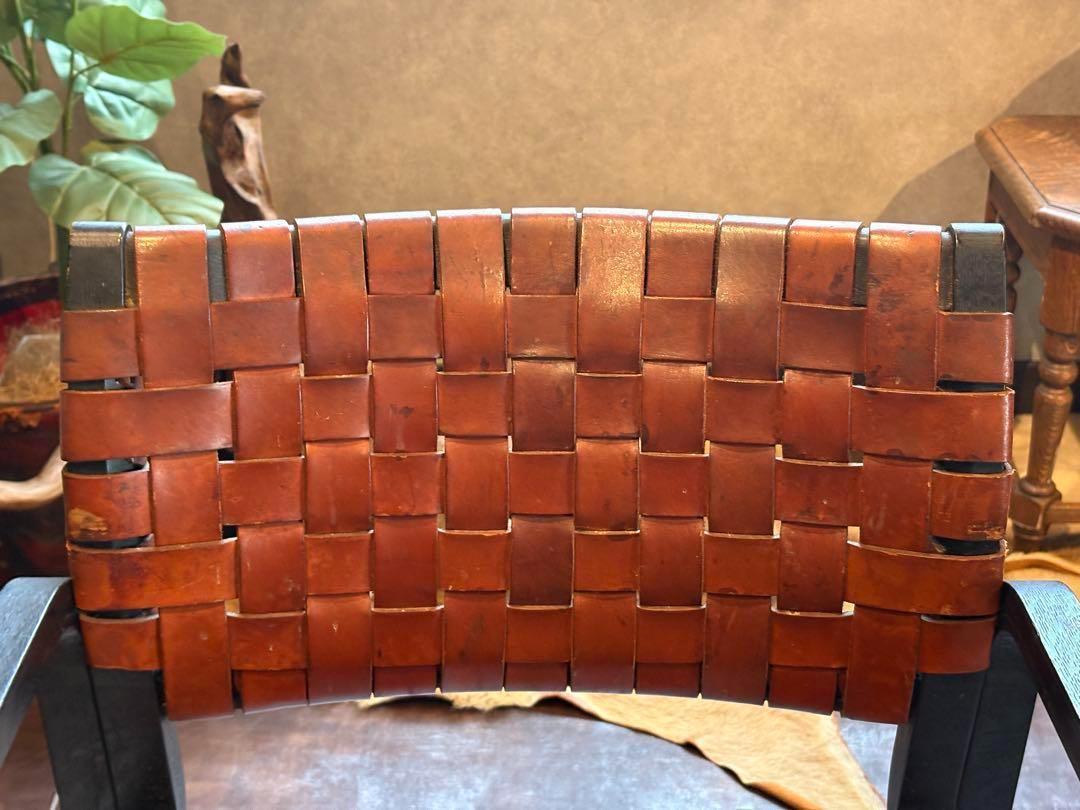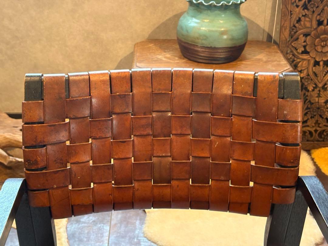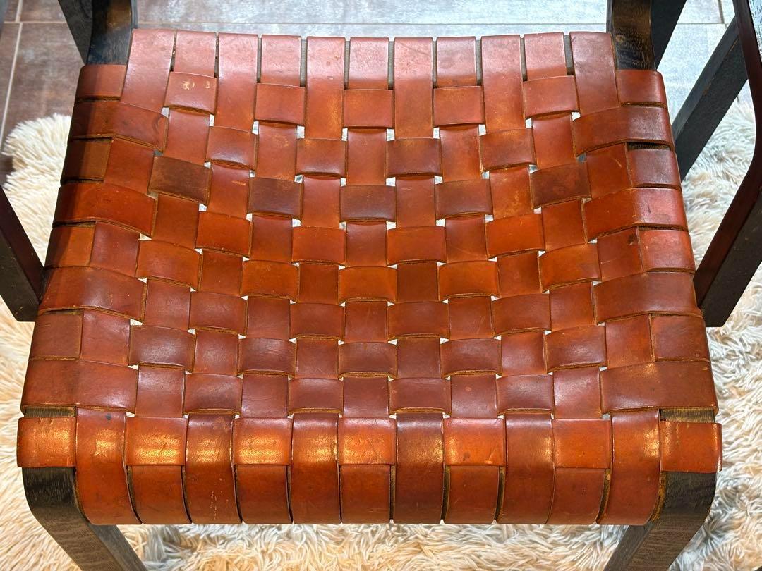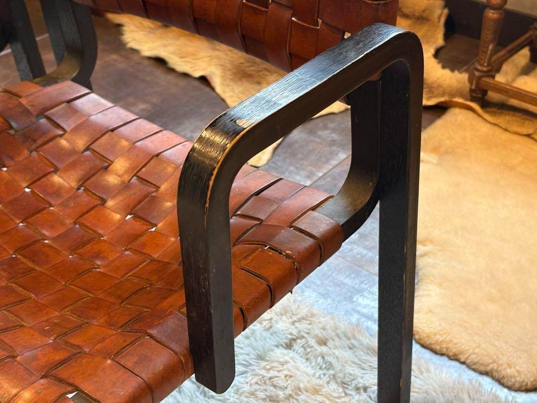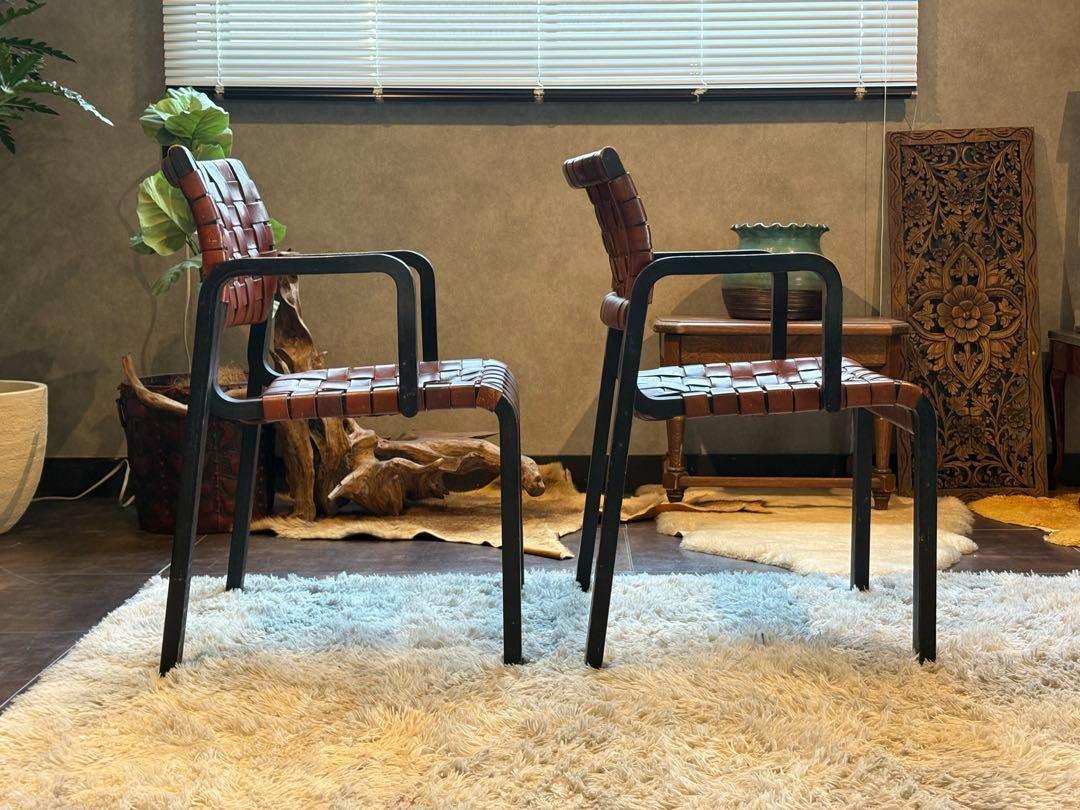 高品質なレザーを丁寧に編み込んだ座面と背もたれが特徴で、ミッドセンチュリーのデザインエッセンスを感じさせます。