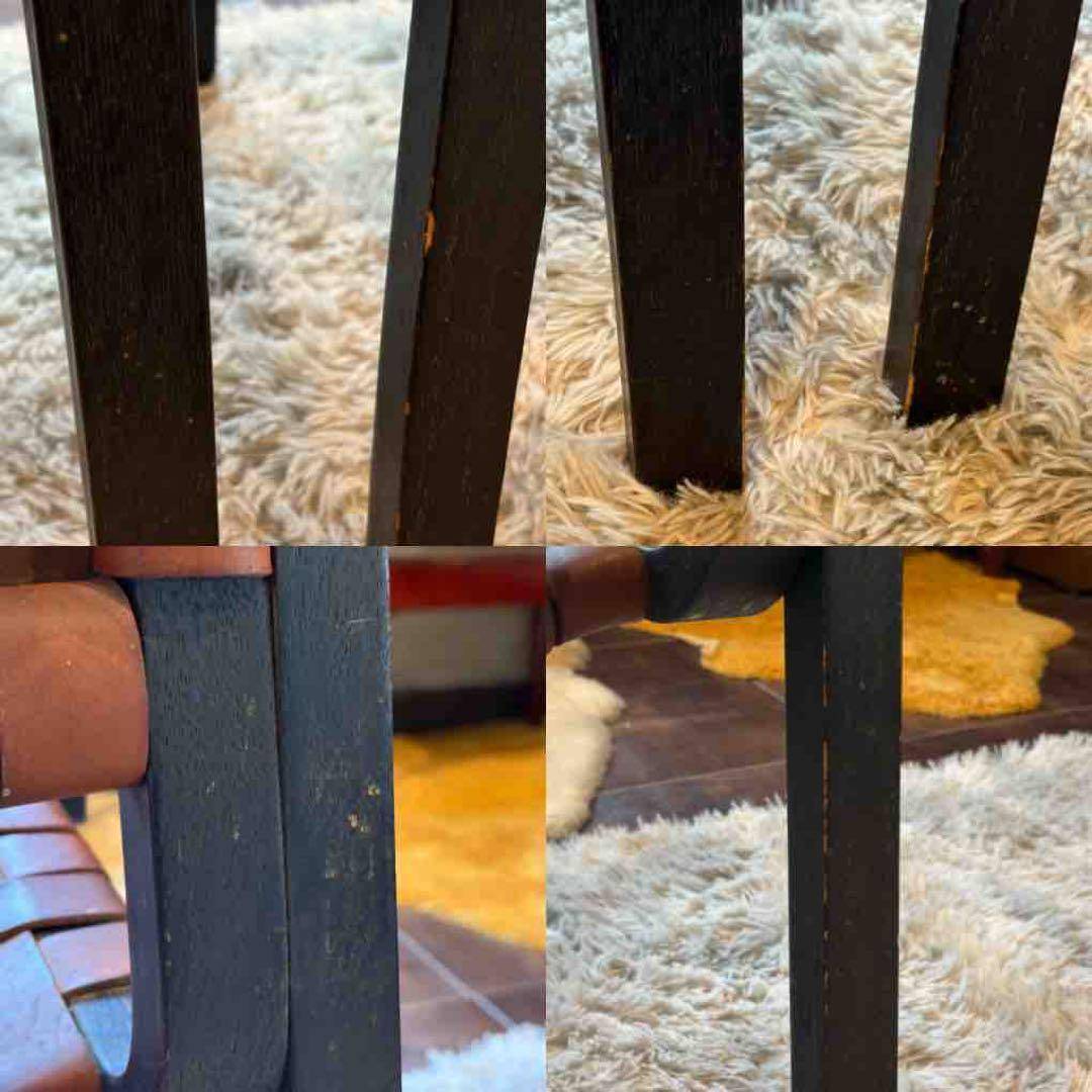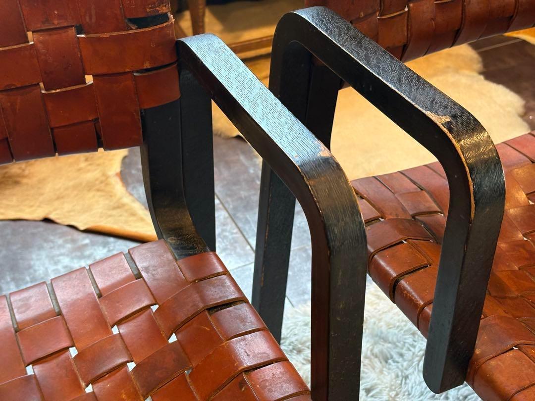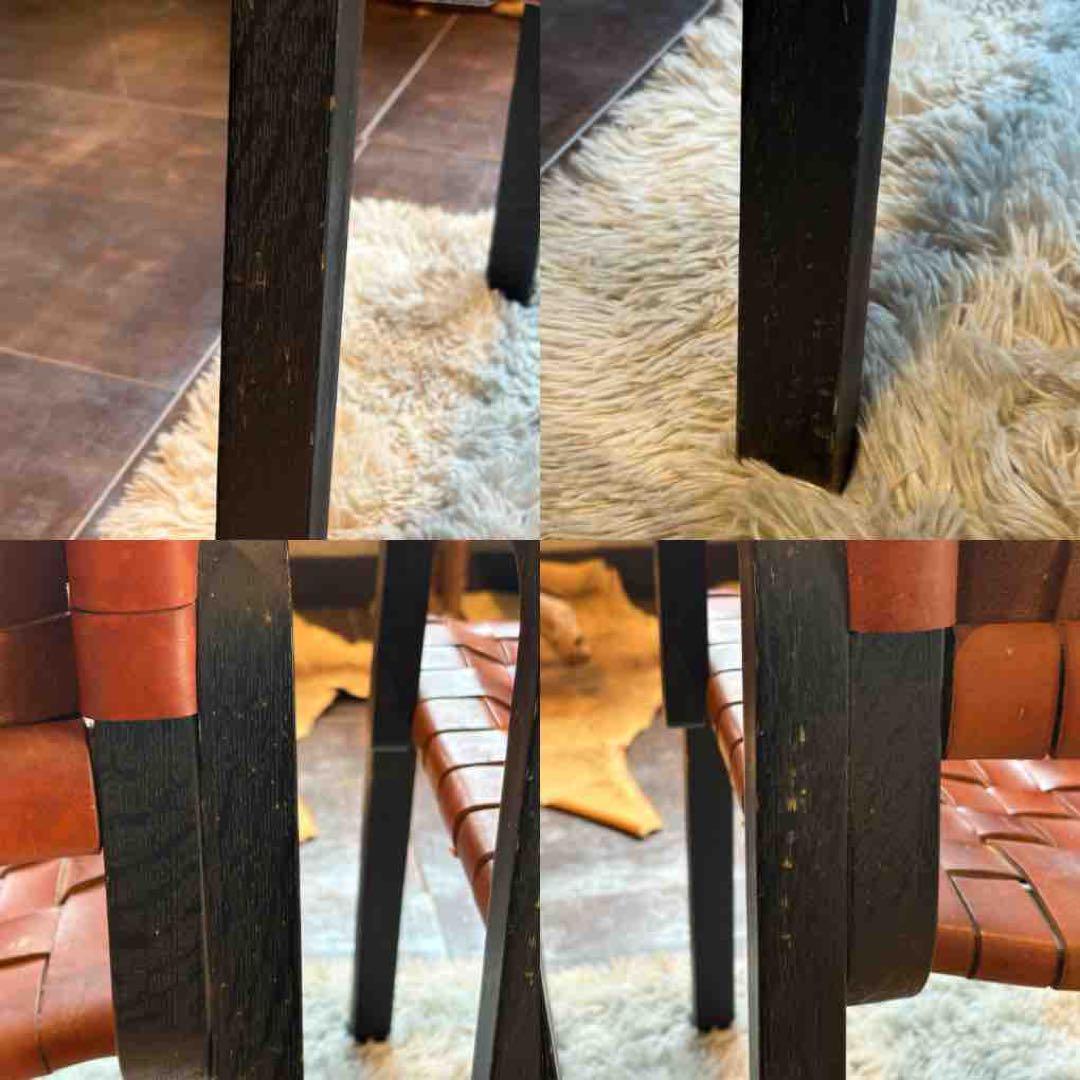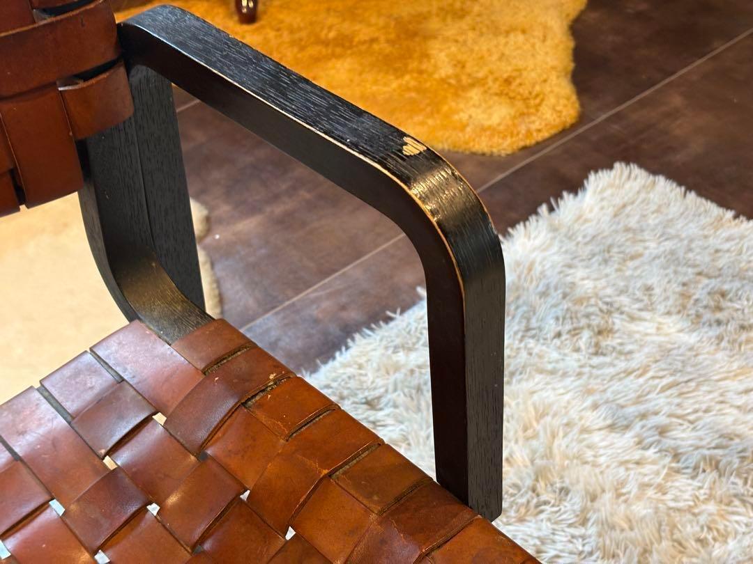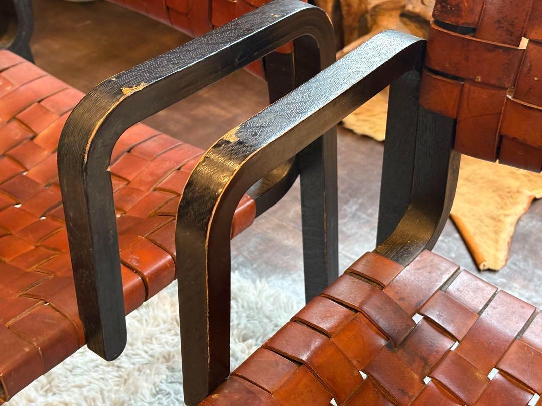 高品質なレザーを丁寧に編み込んだ座面と背もたれが特徴で、ミッドセンチュリーのデザインエッセンスを感じさせます。