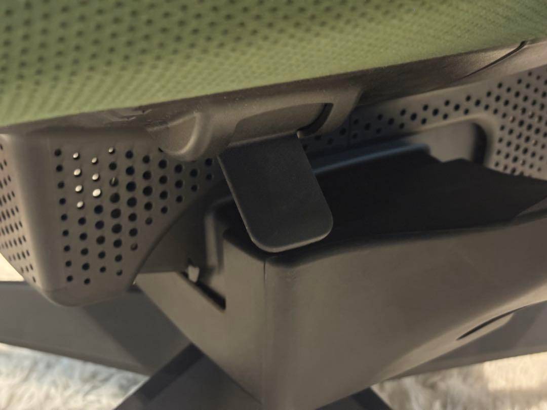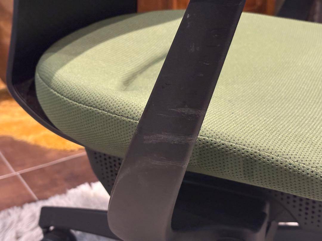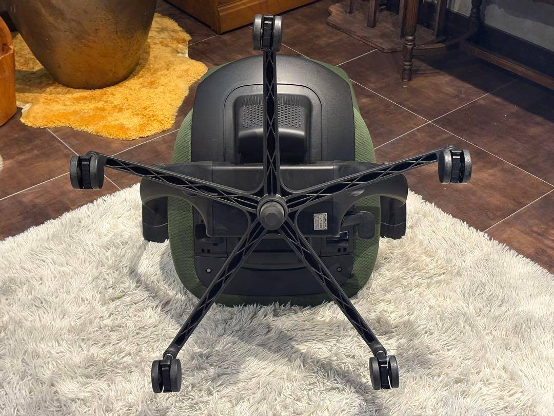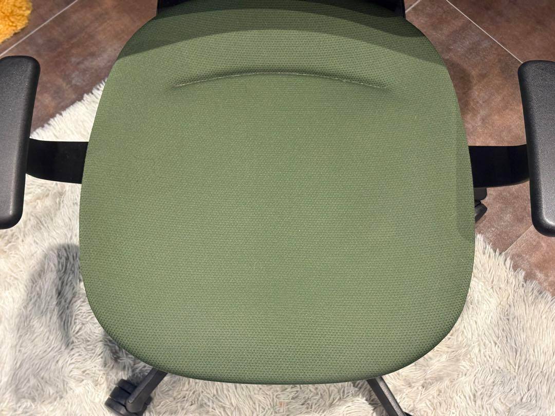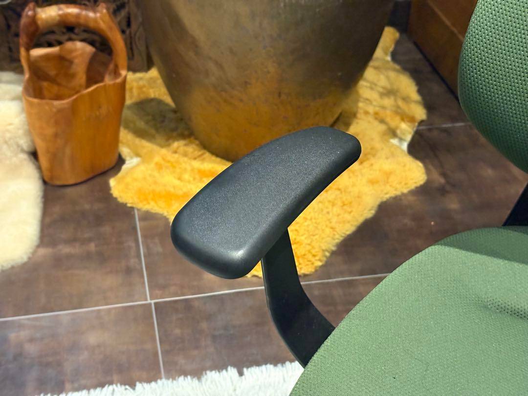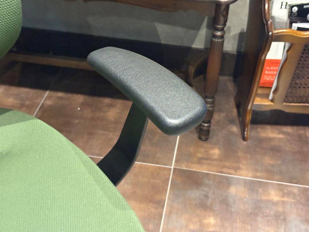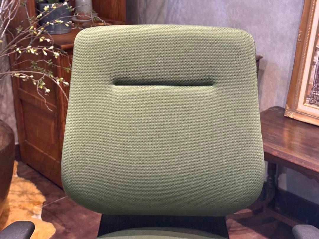 シンプルながら機能性に優れたオフィスチェアで、背もたれと座面にはグリーンのファブリックを使用。