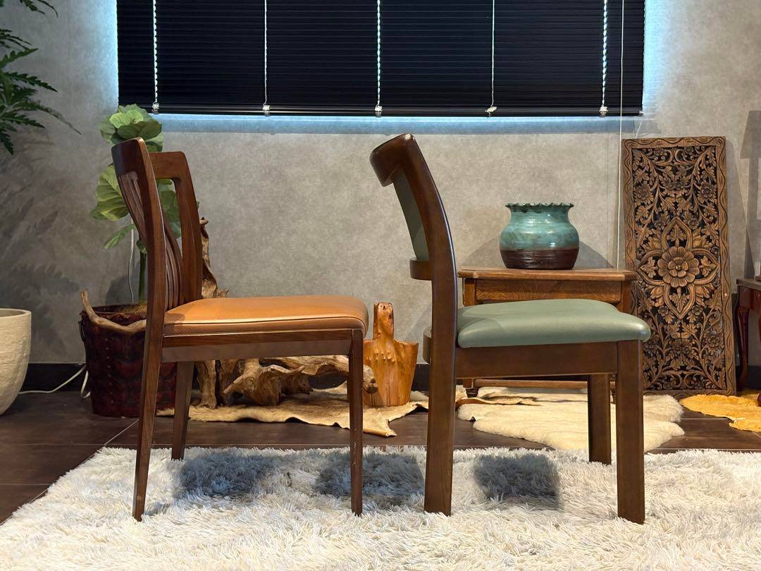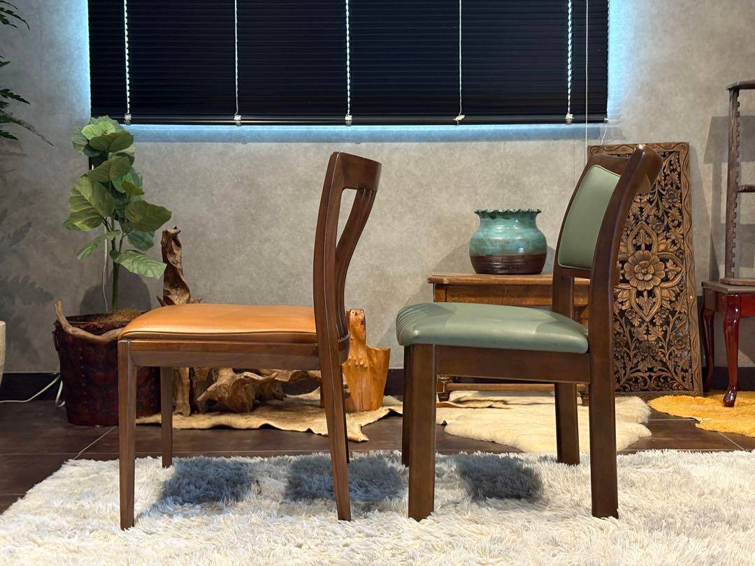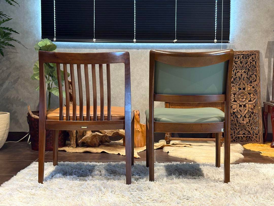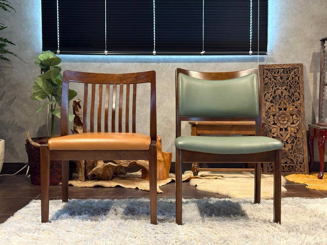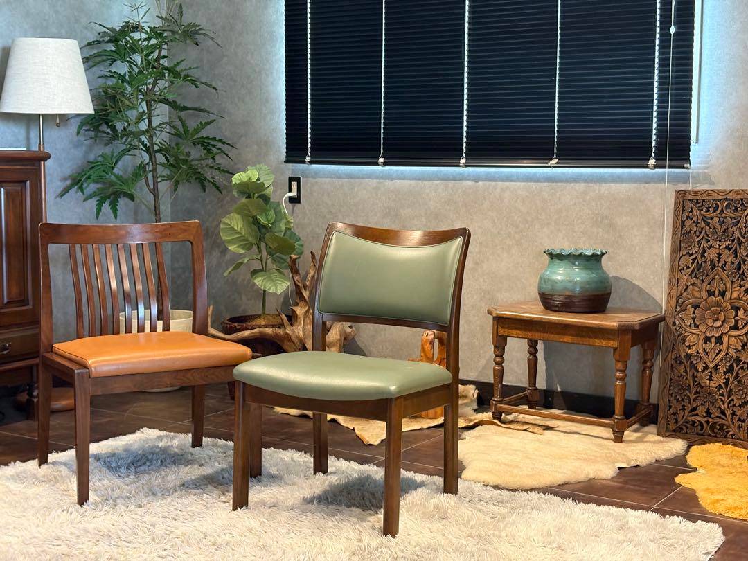 飛騨産業製のグリーンレザーチェアと、ドマーニらしいシャープなラインが美しいスポークチェアの2脚セット。