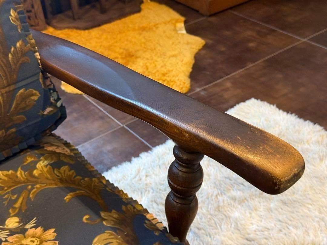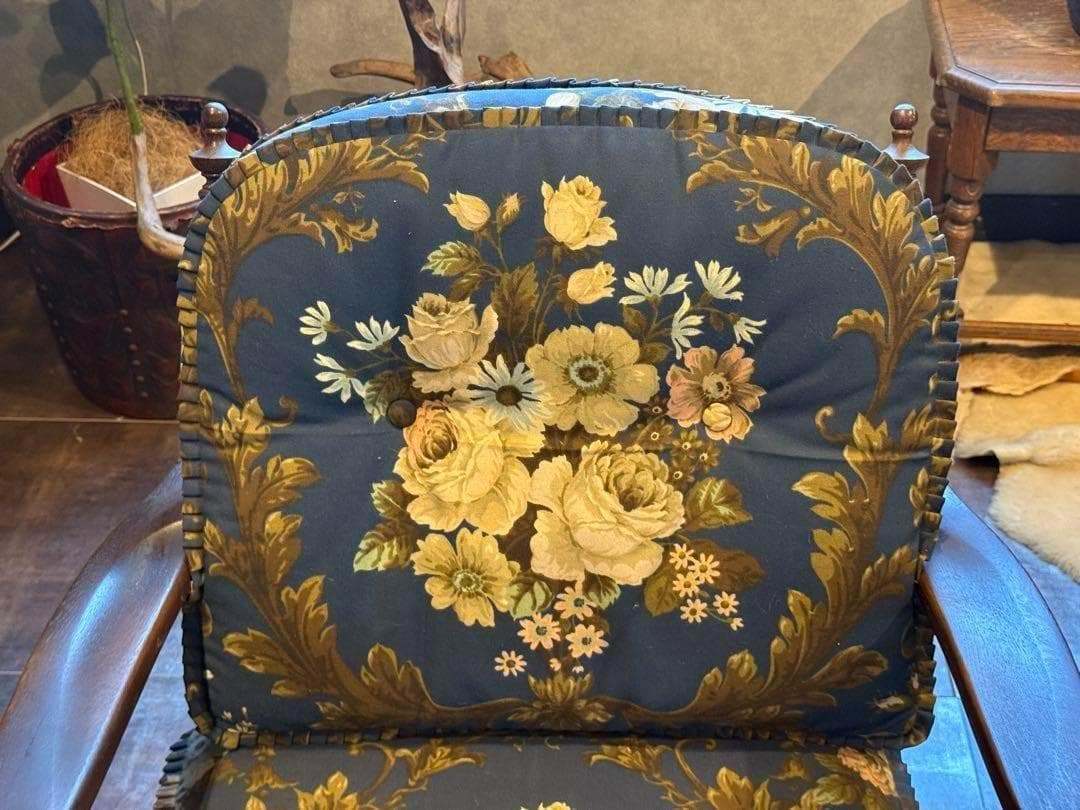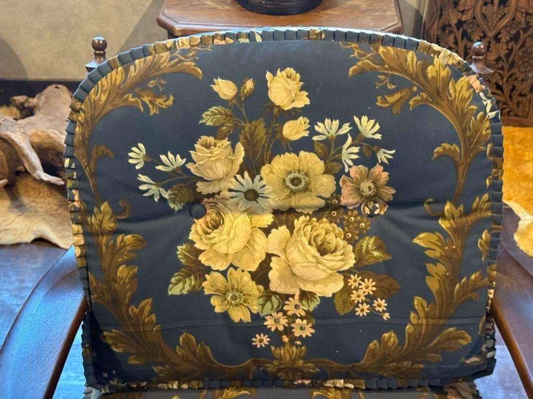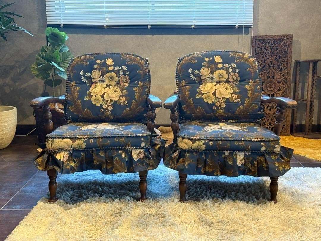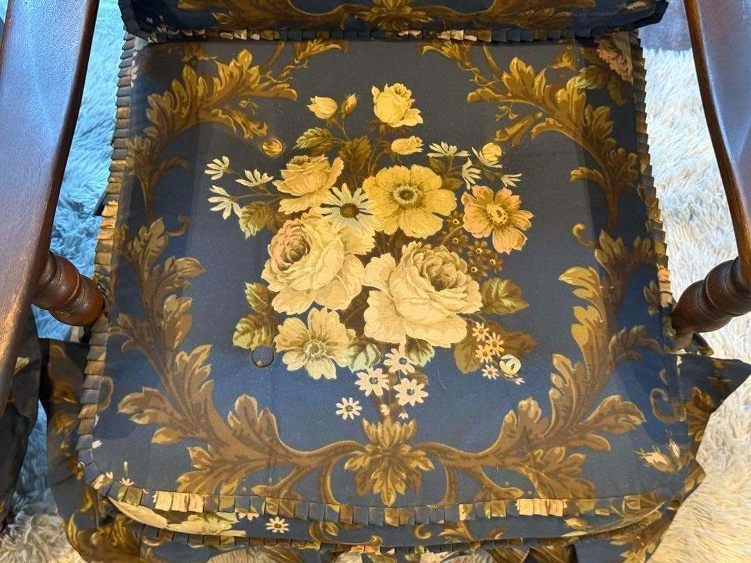 クラシックな花柄ファブリックと、重厚感ある木製フレームが魅力的な逸品です。