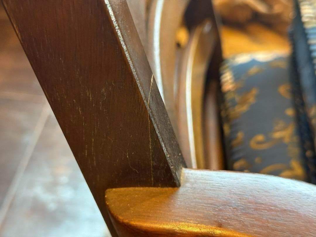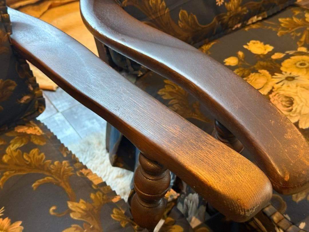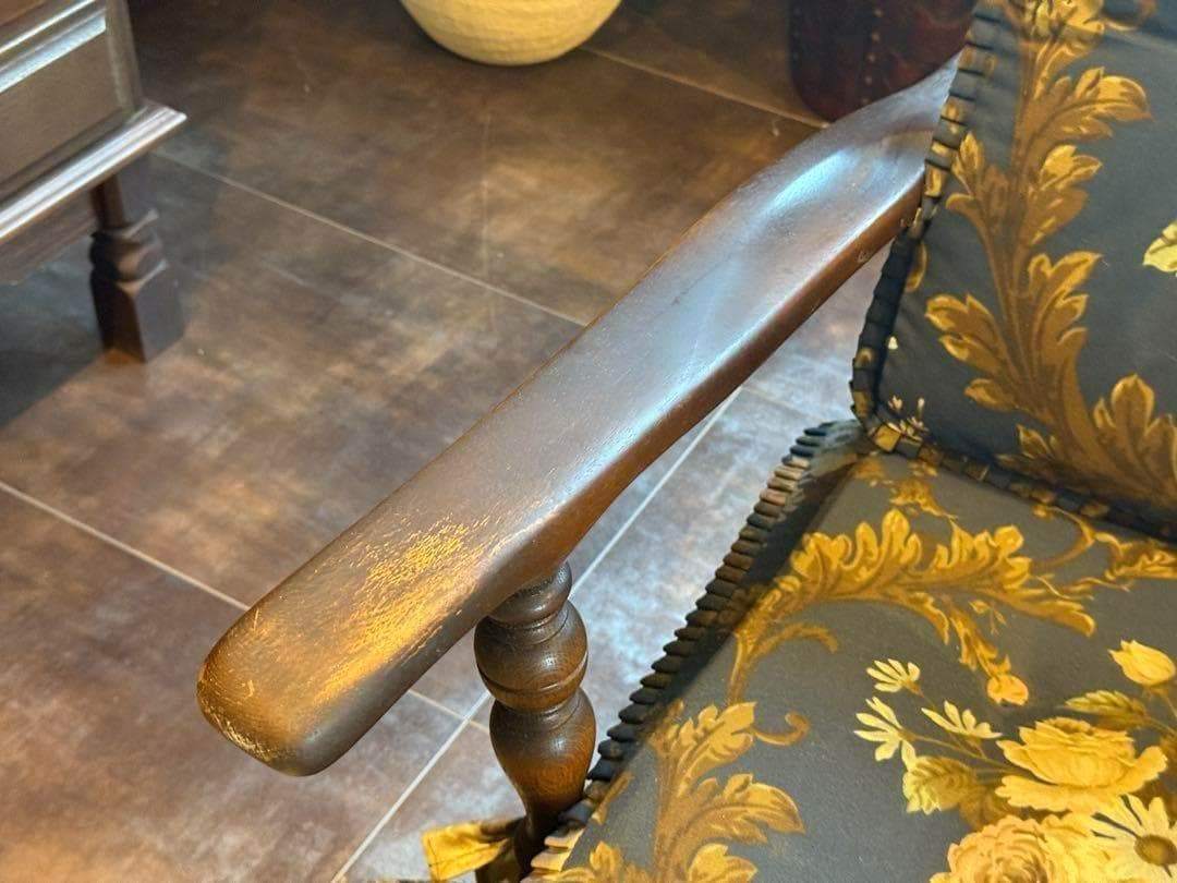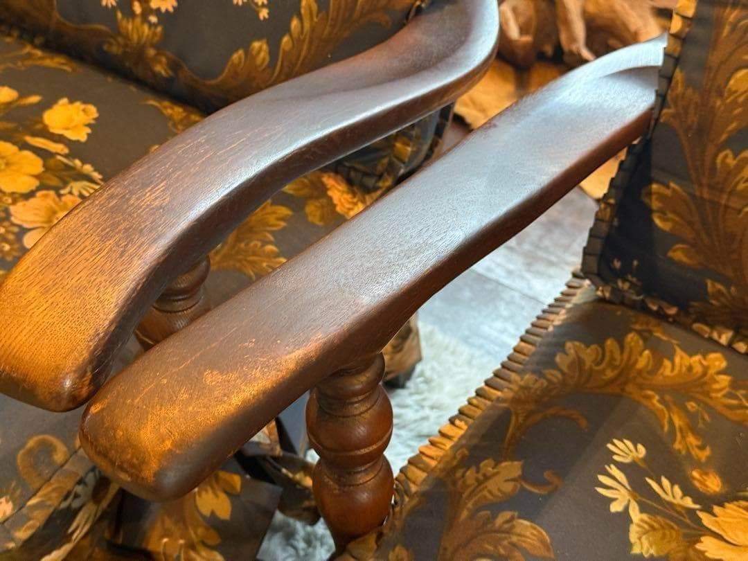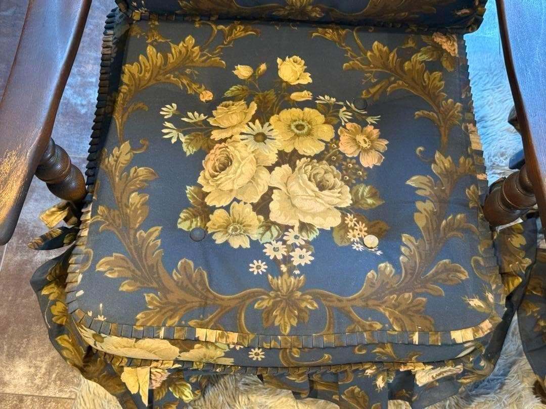 クラシックな花柄ファブリックと、重厚感ある木製フレームが魅力的な逸品です。