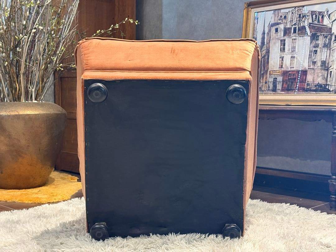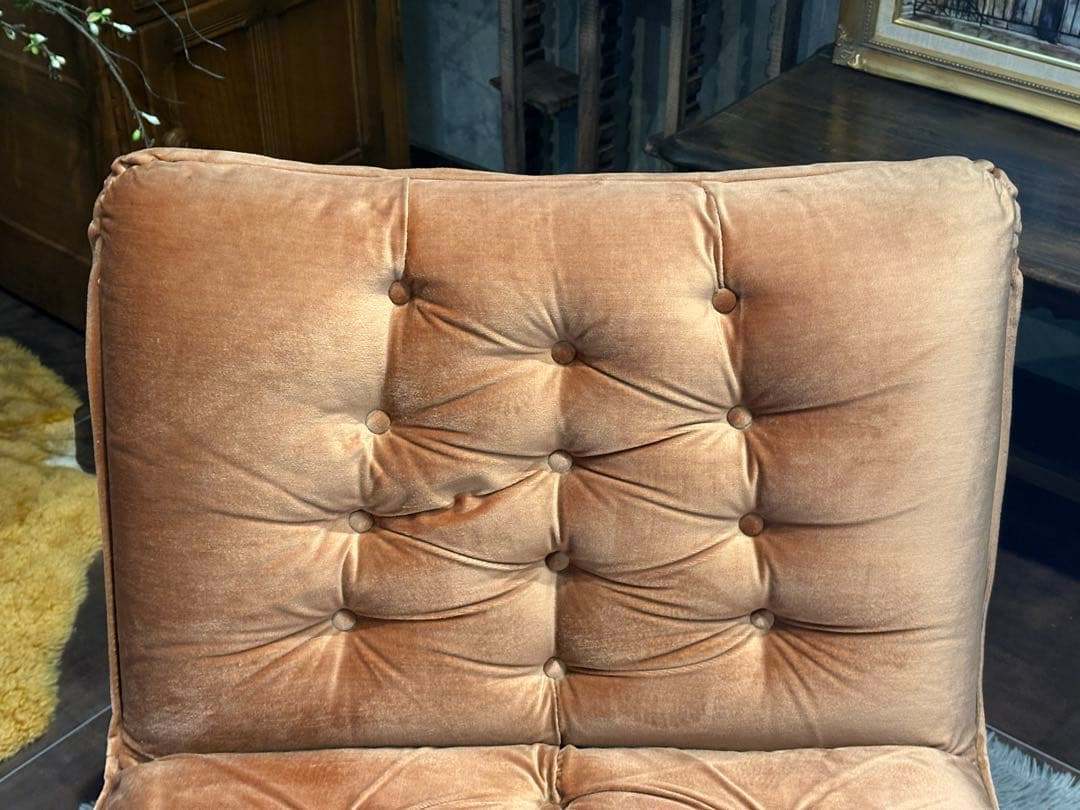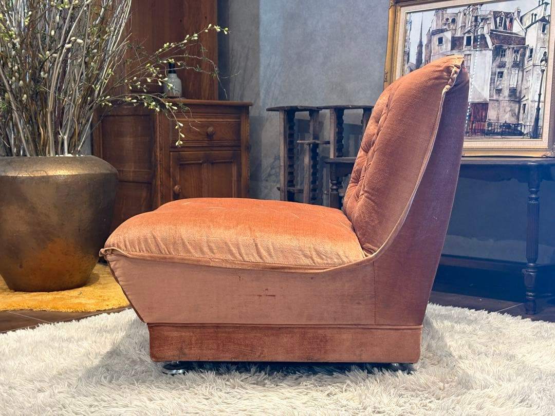 やわらかな光沢を持つファブリック生地が美しく、アンティークならではの風合いを楽しめる一脚です。