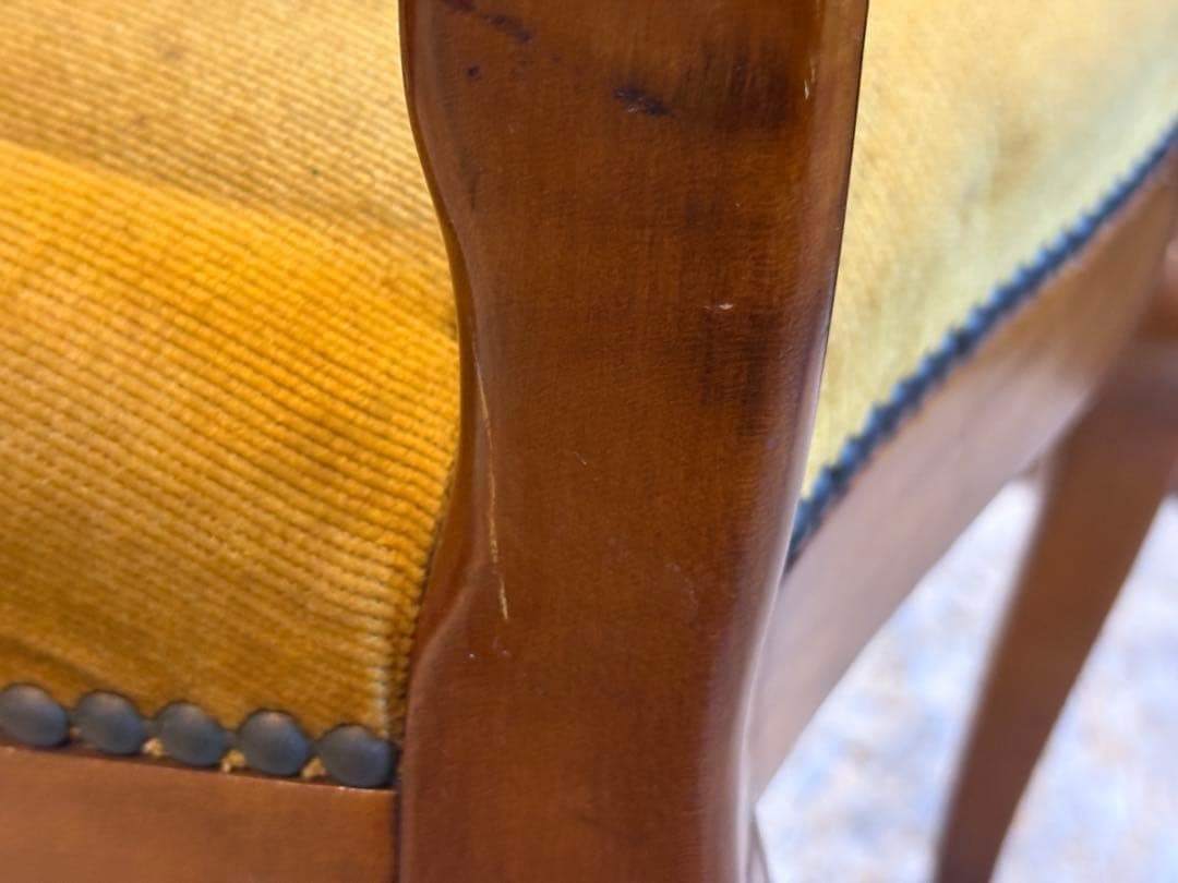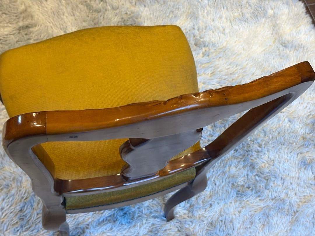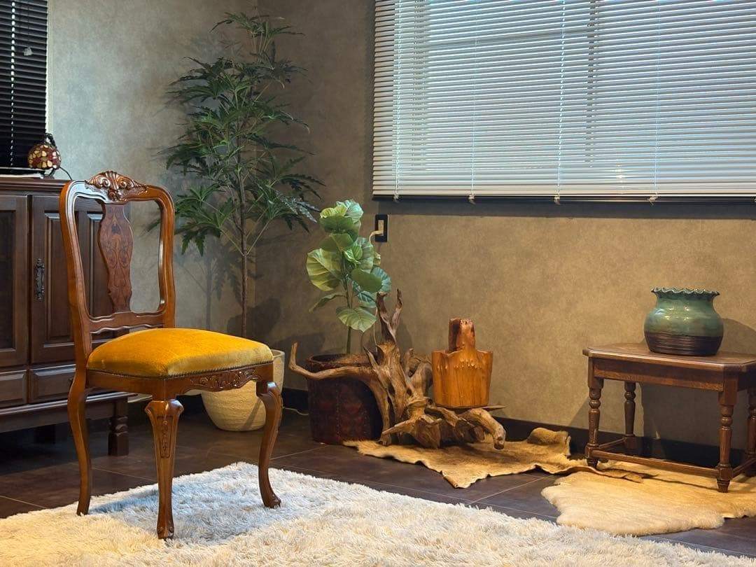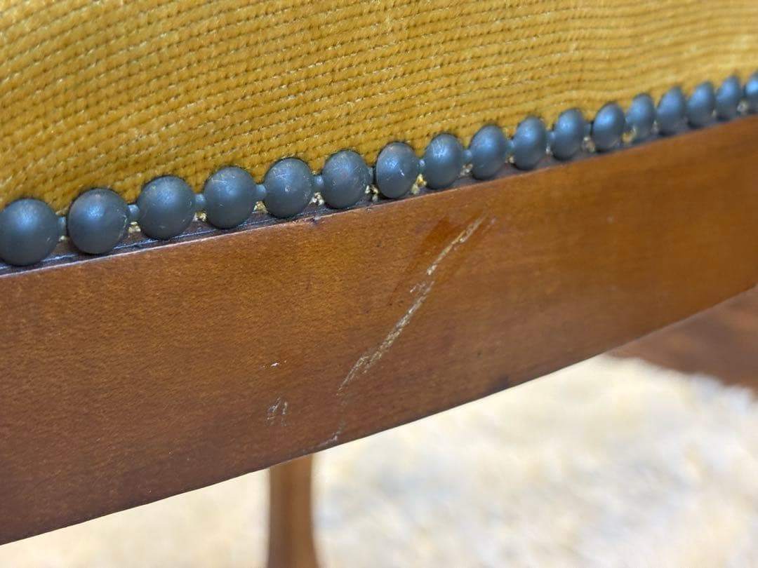 座面には深みのあるゴールド系のファブリックが張られ、落ち着いた雰囲気の中にも華やかさをプラスしています。