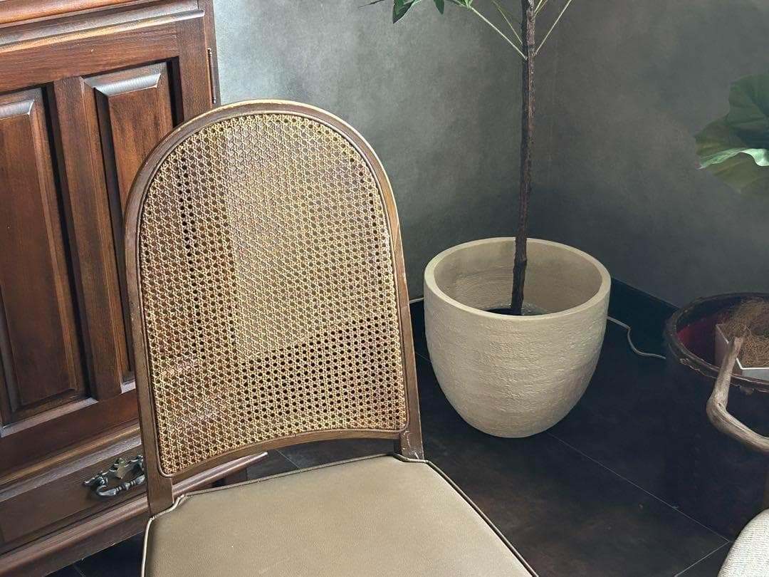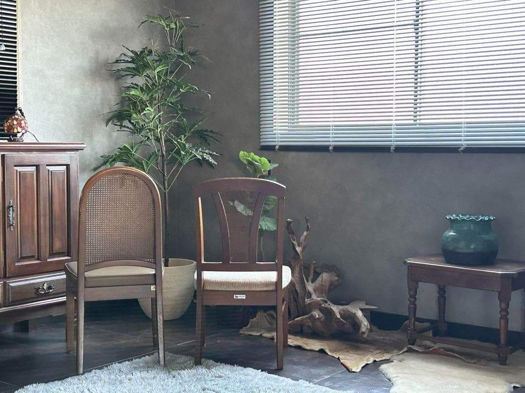 背もたれ部分のラタンが程よく抜け感を演出し、通気性も確保。