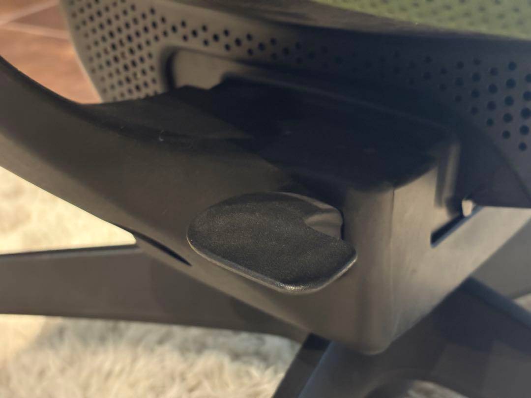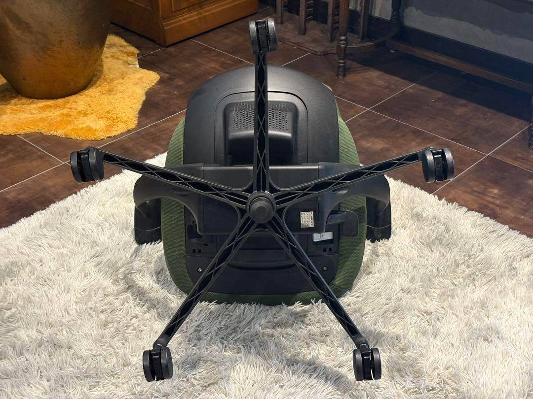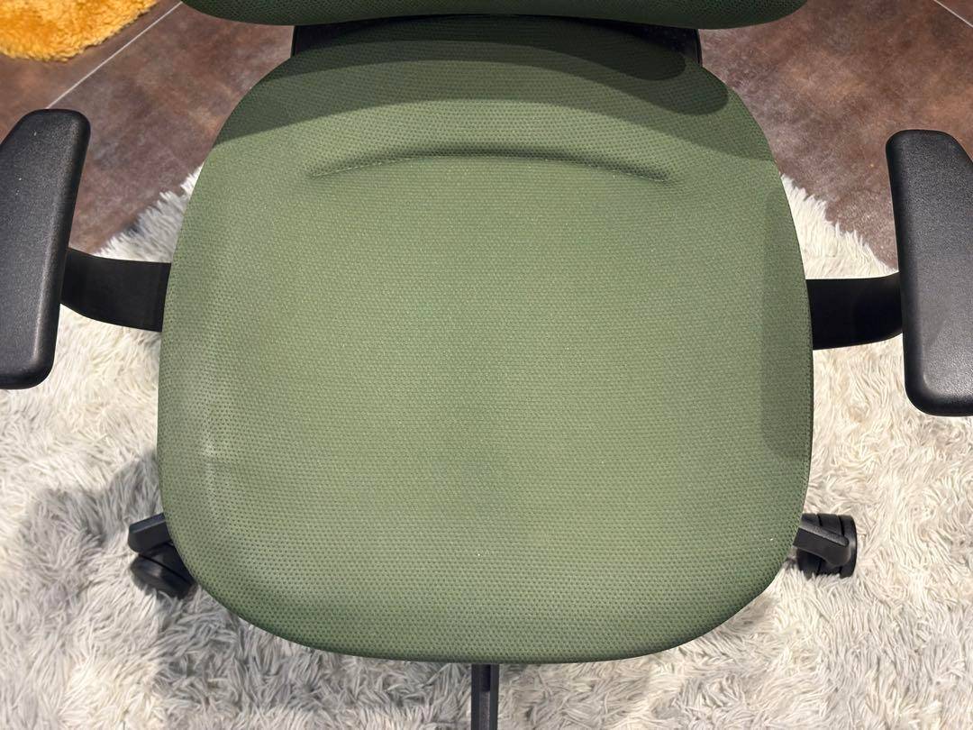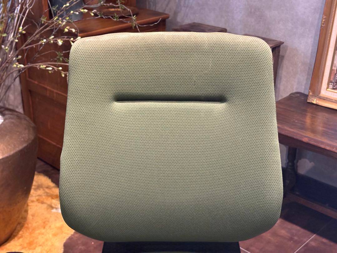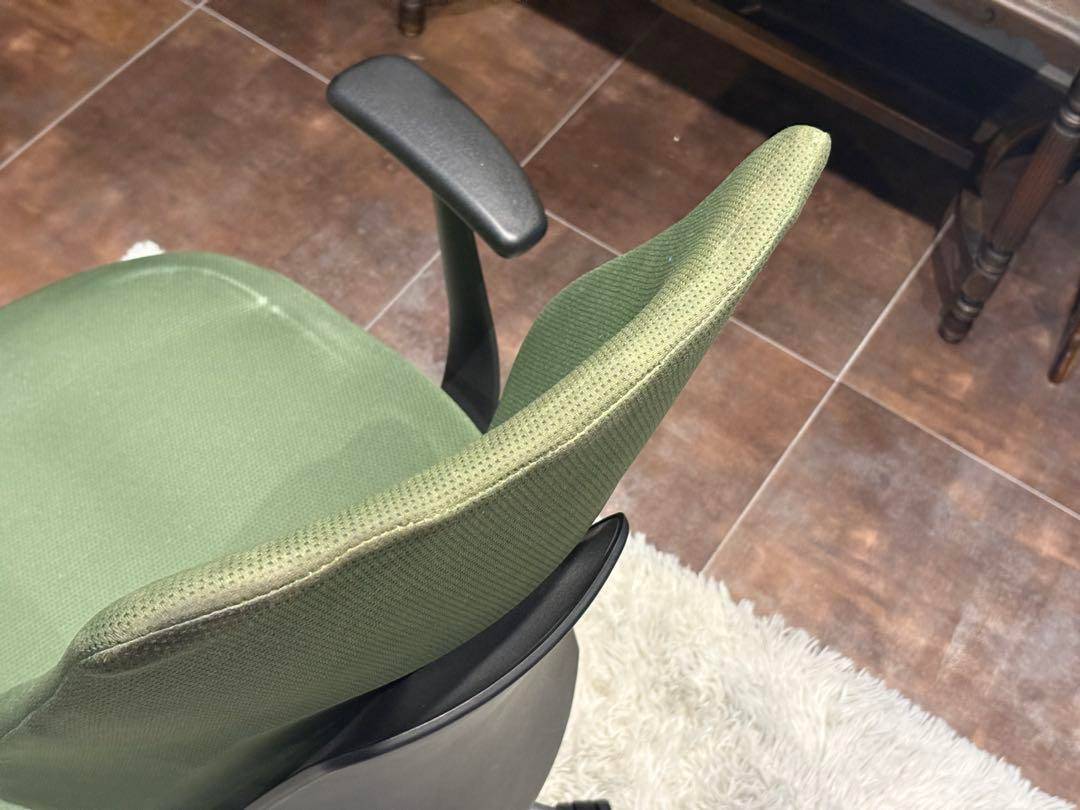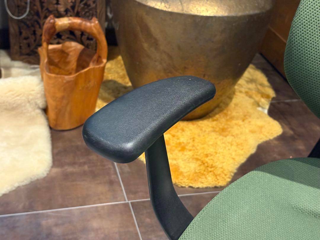 シンプルながら機能性に優れたオフィスチェアで、背もたれと座面にはグリーンのファブリックを使用。