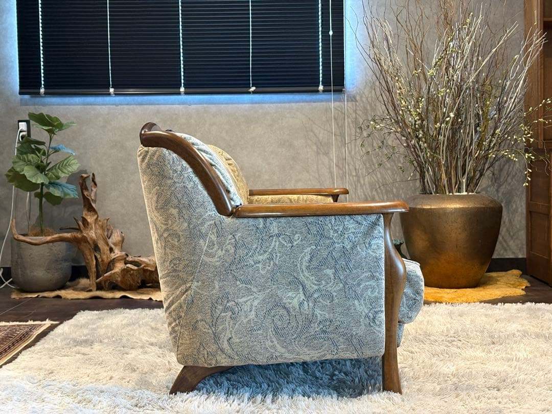 柔らかな曲線を描く背もたれとアームの木フレームが、