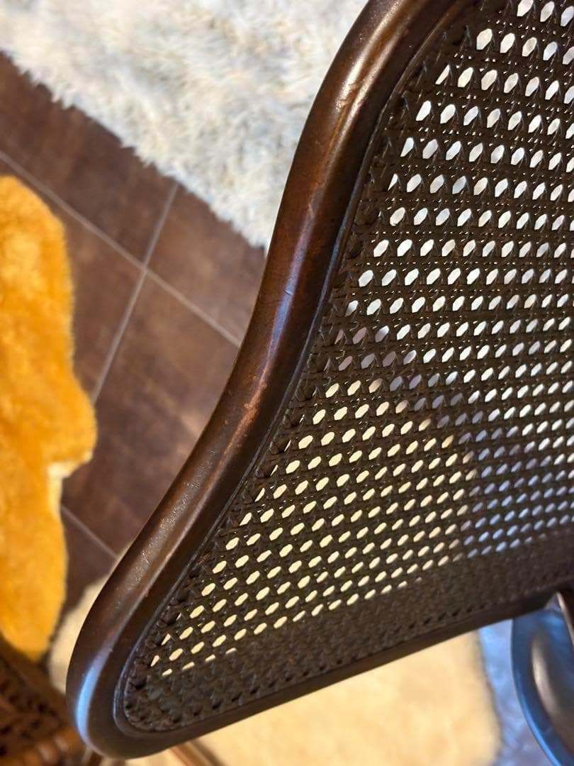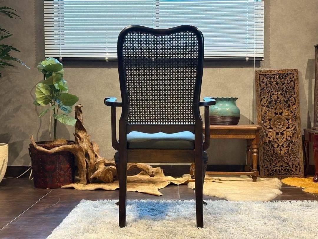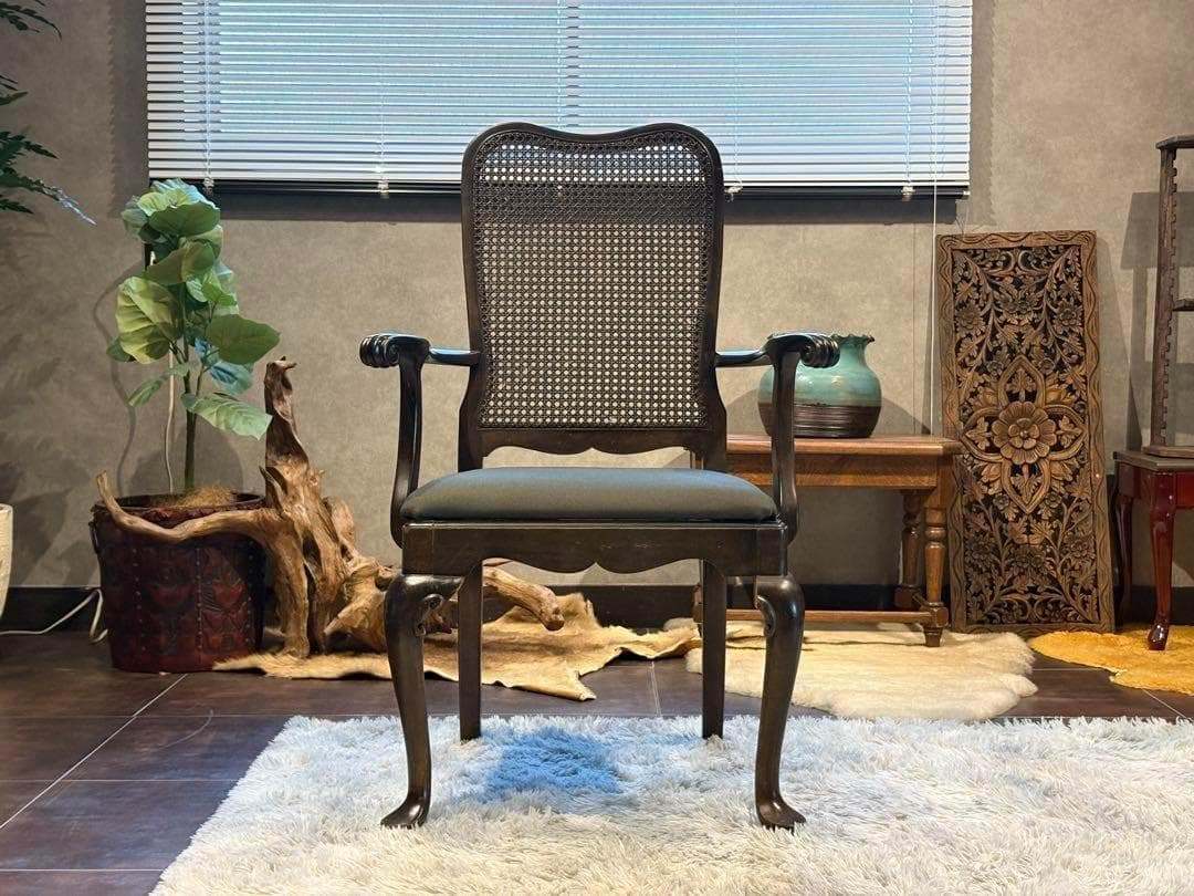 クラシカルな曲線美と籐張りの背もたれが印象的で、洋風アンティークやコロニアルスタイルの空間によく馴染みます。
