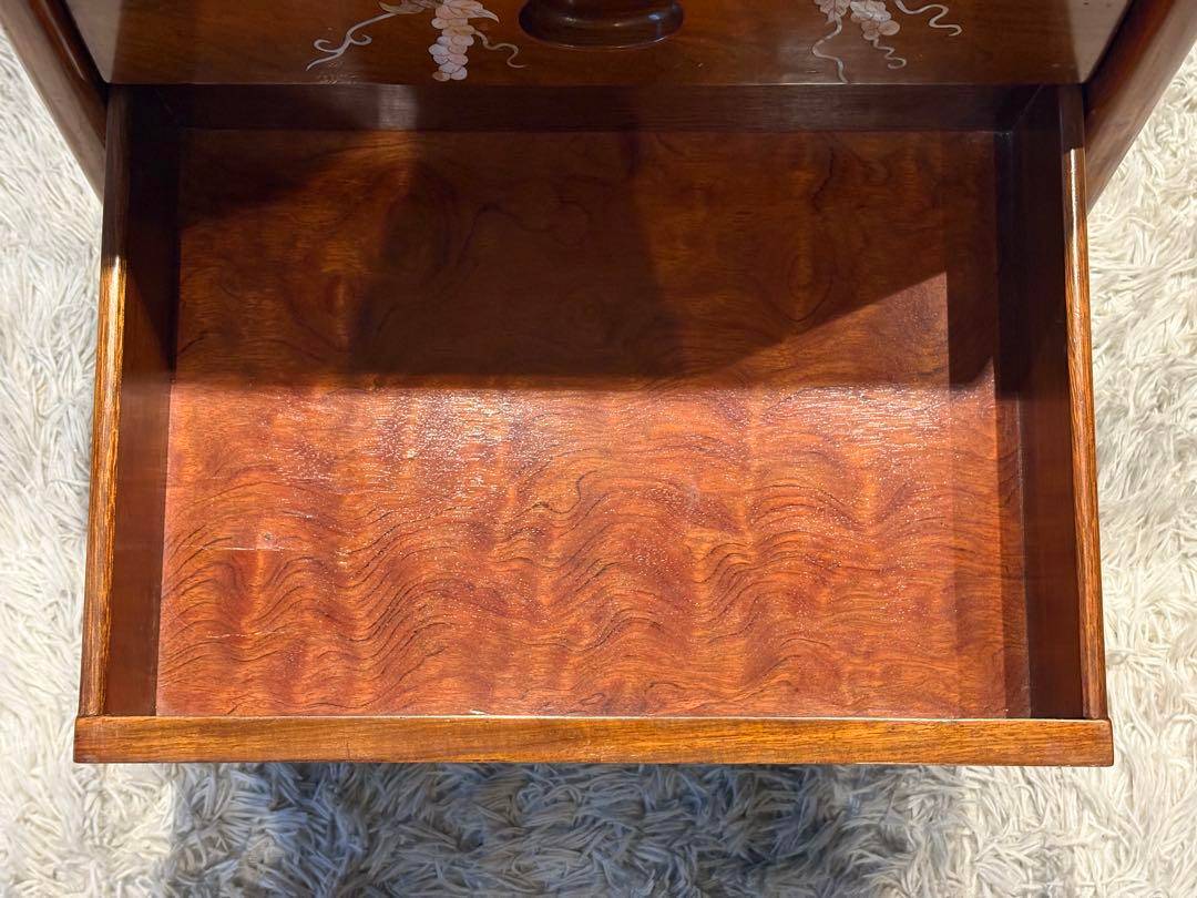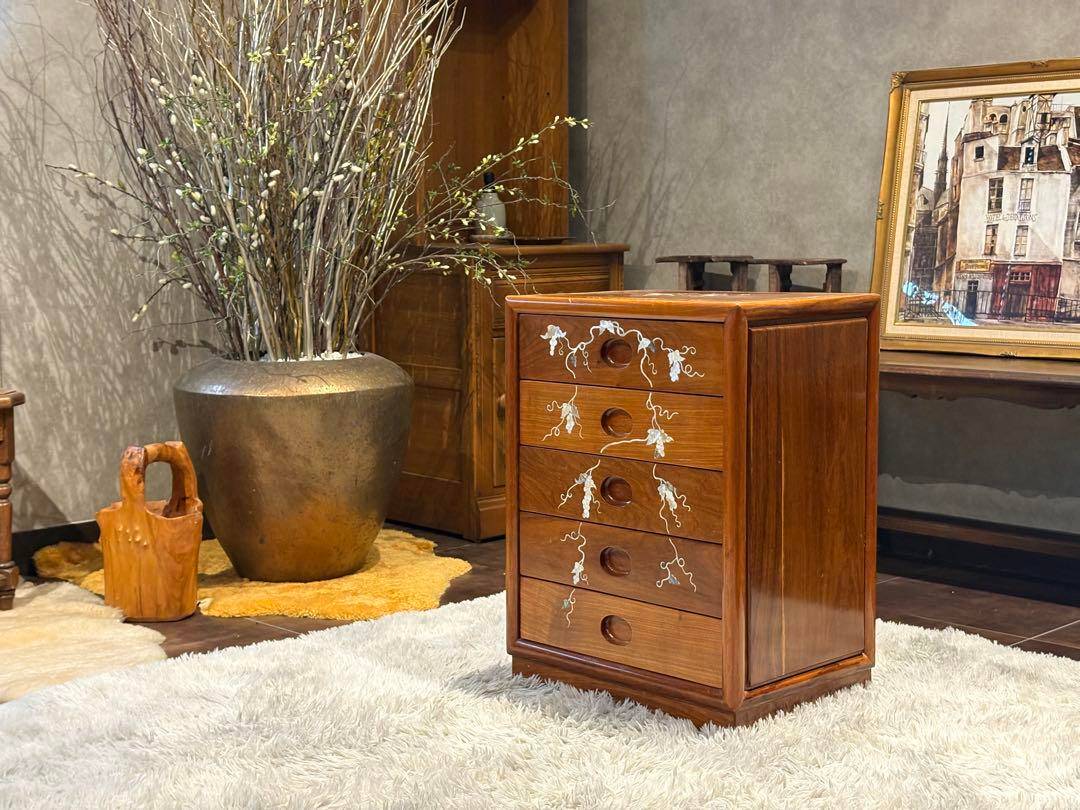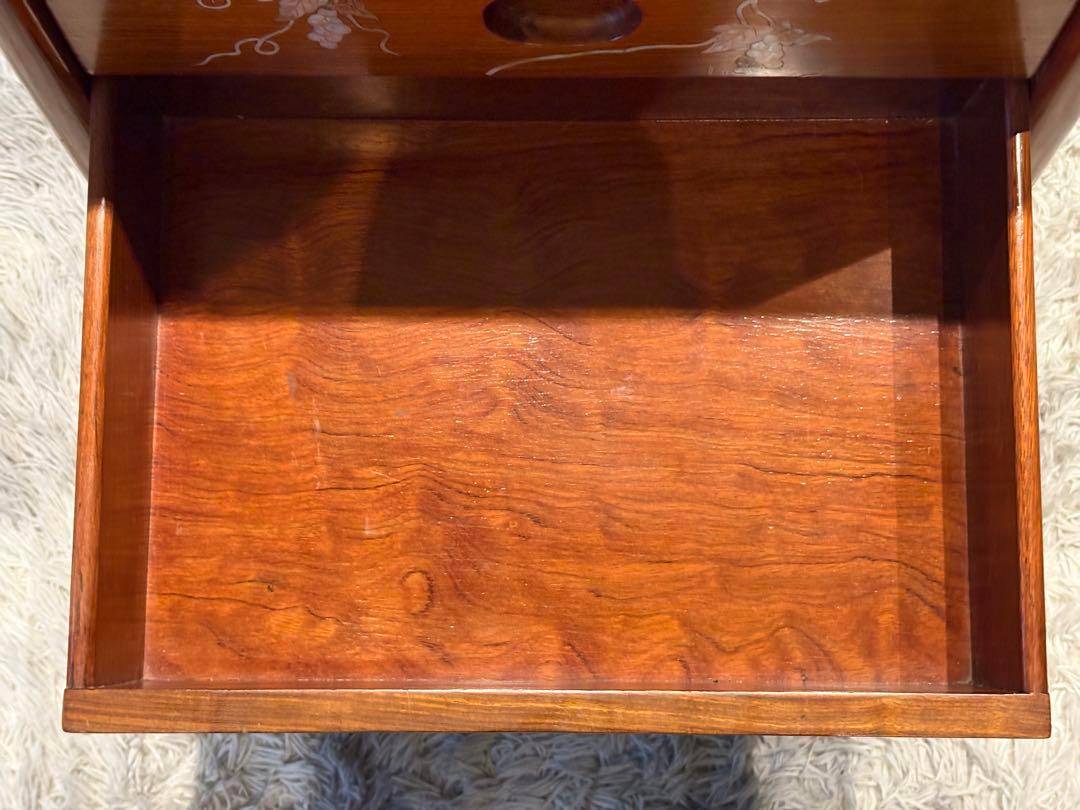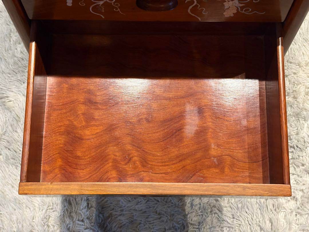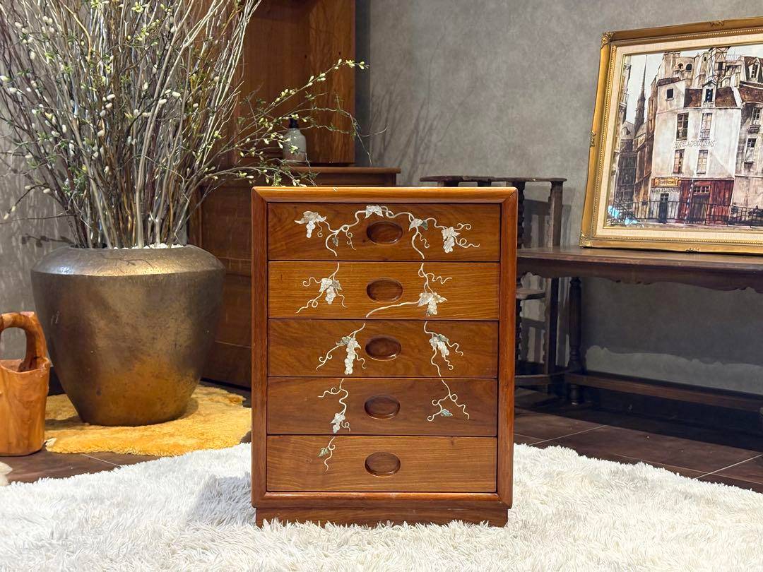 こちらは花梨(カリン)材を使用した、螺鈿細工入りの5段チェストです。