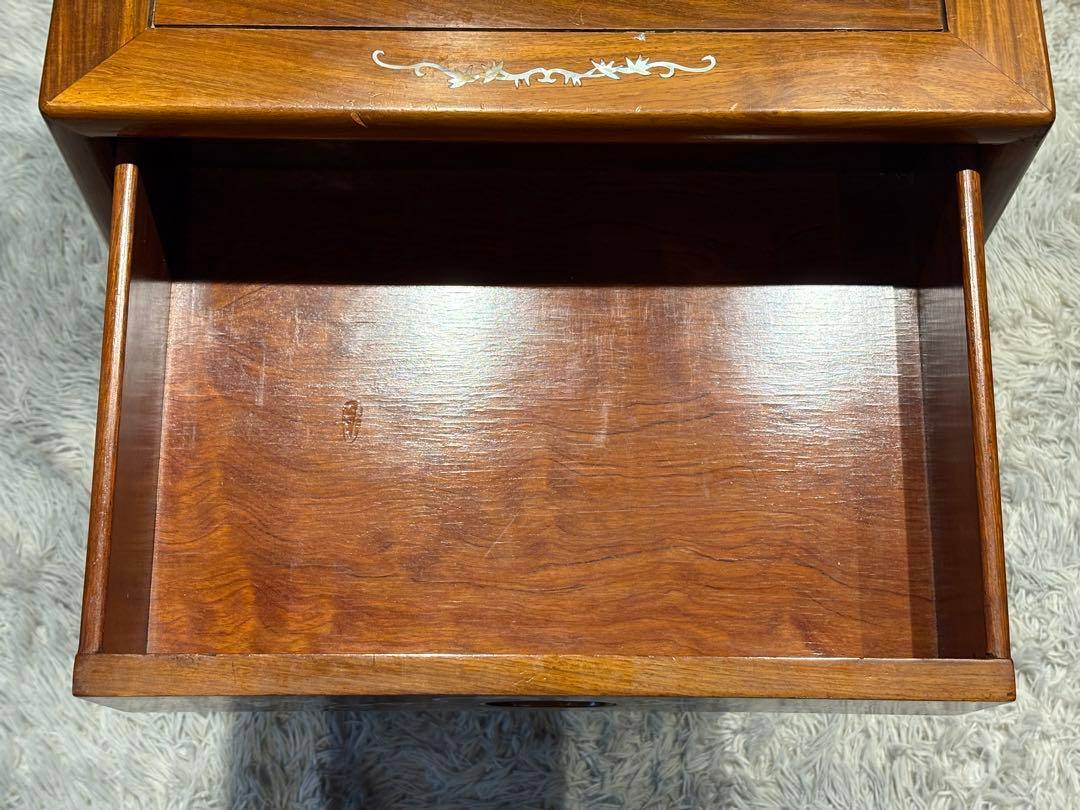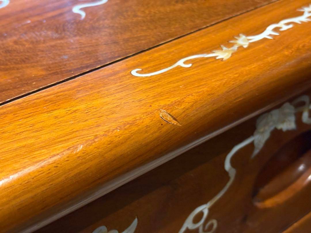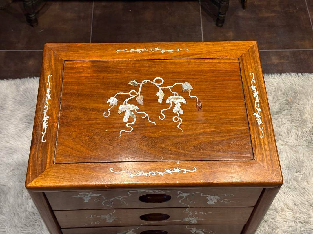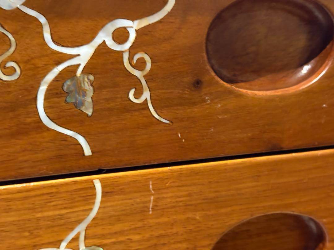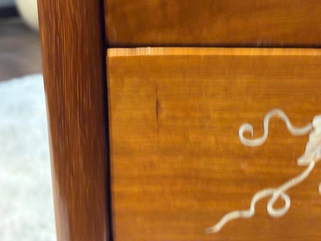 こちらは花梨(カリン)材を使用した、螺鈿細工入りの5段チェストです。