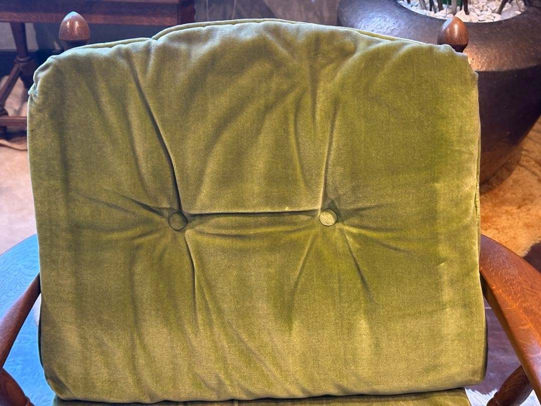 クラシックなフレームデザインに、深みのあるグリーンのファブリックが映える一脚。