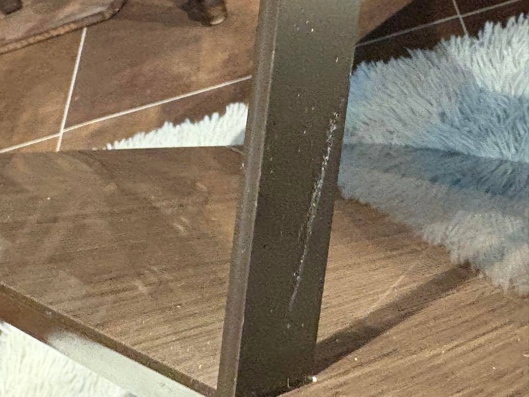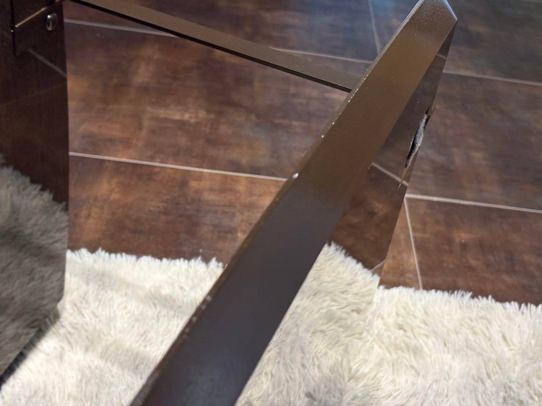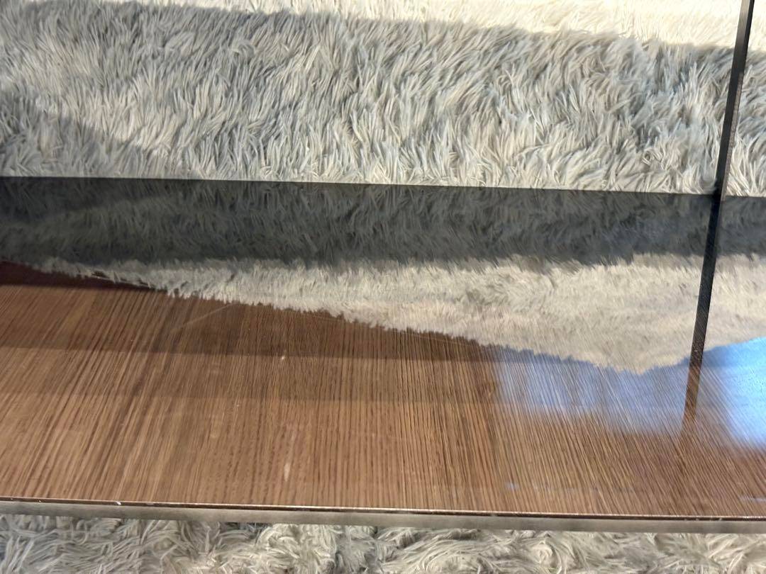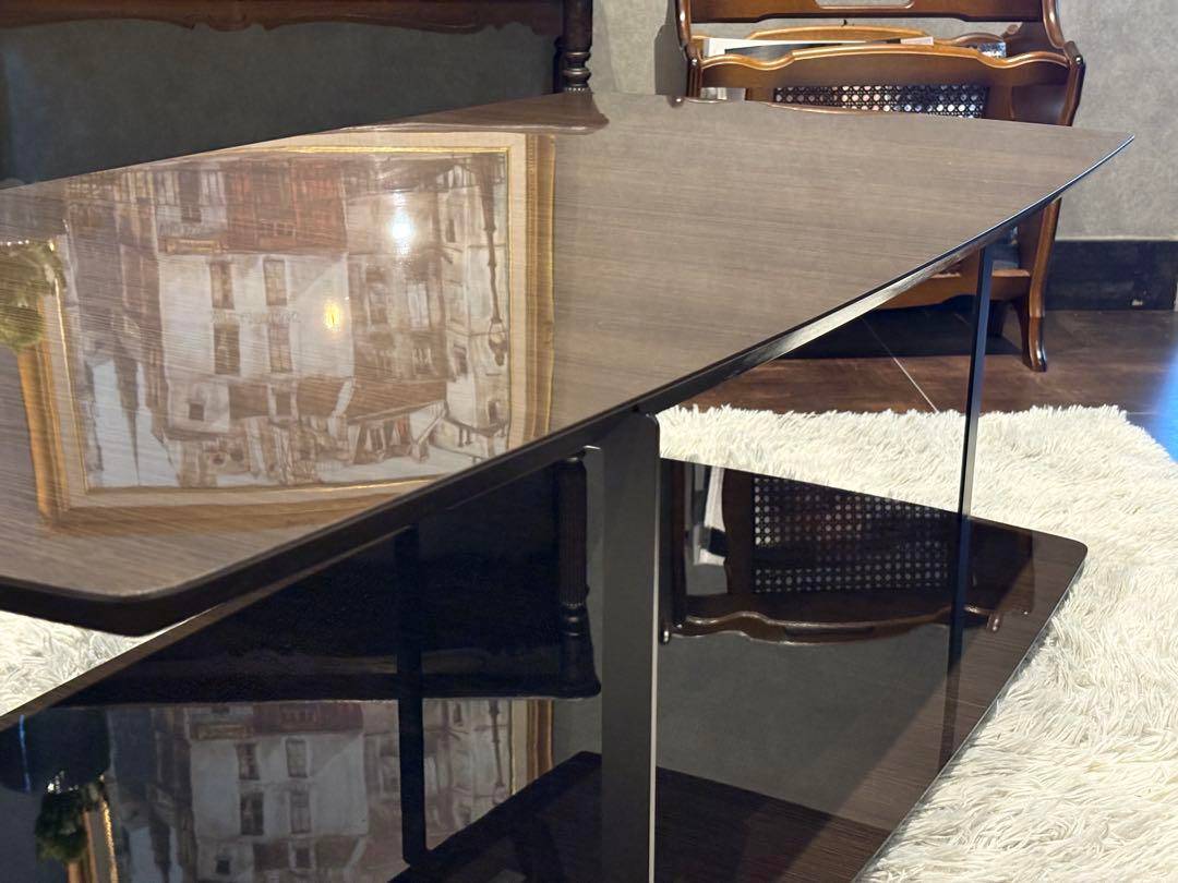 ガラスのような艶やかな天板と、直線的なスチール脚の組み合わせが、空間に洗練された印象を与えます。