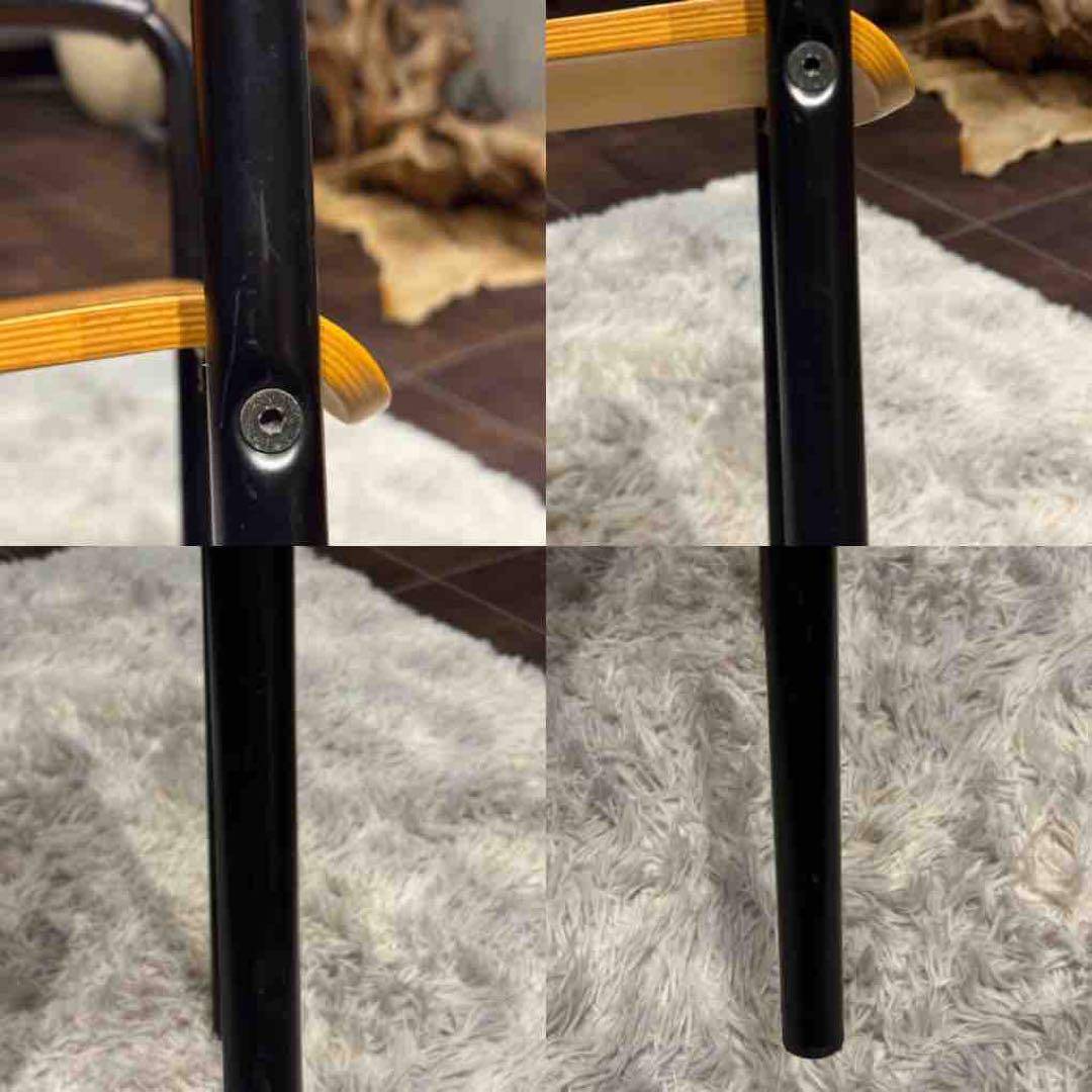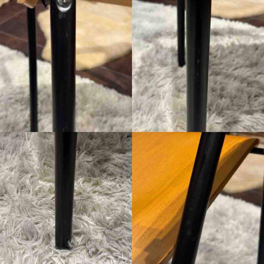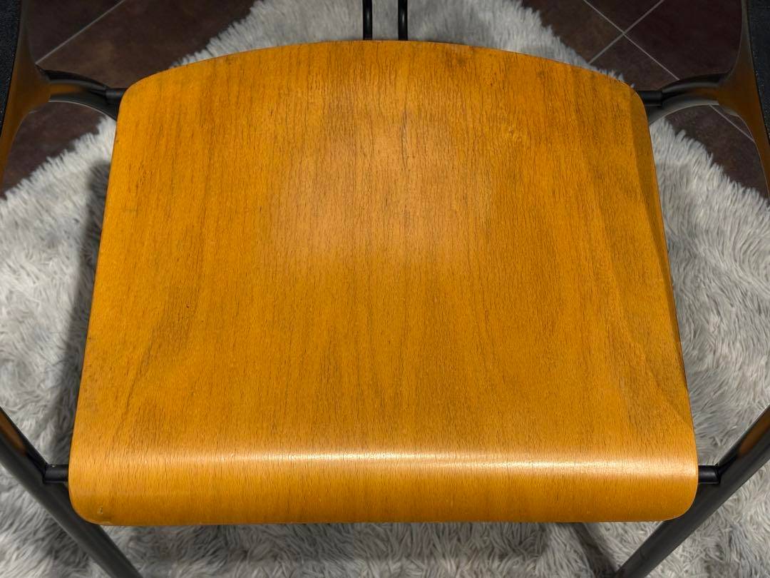 木製の座面と背もたれに、ブラックスチールの脚を組み合わせたデザインは、無骨さと温かみを兼ね備えています。