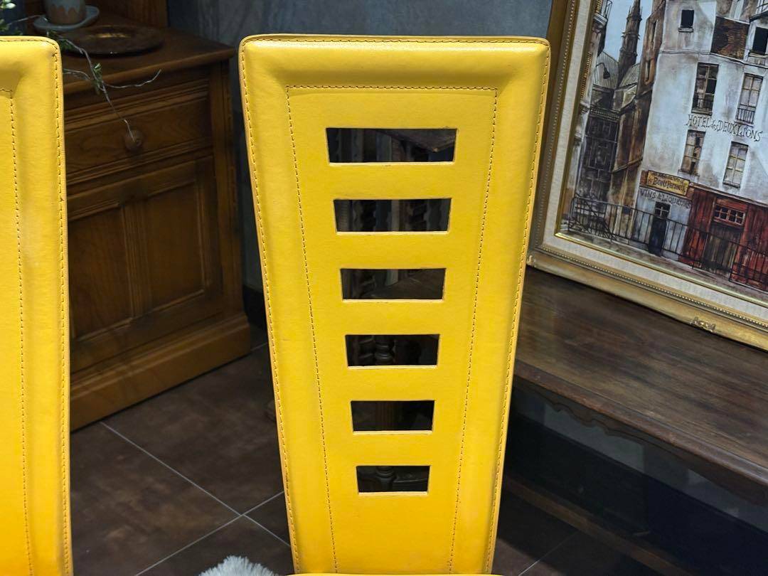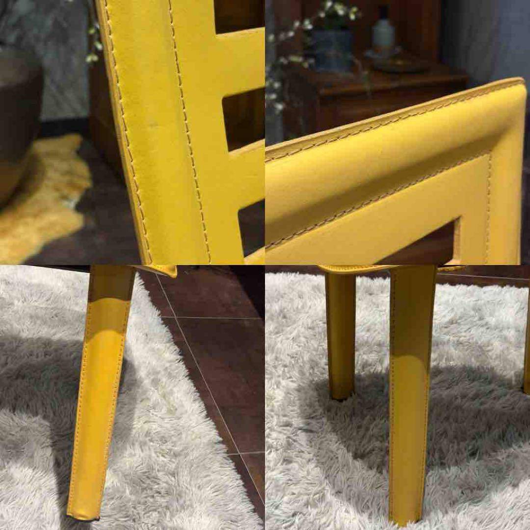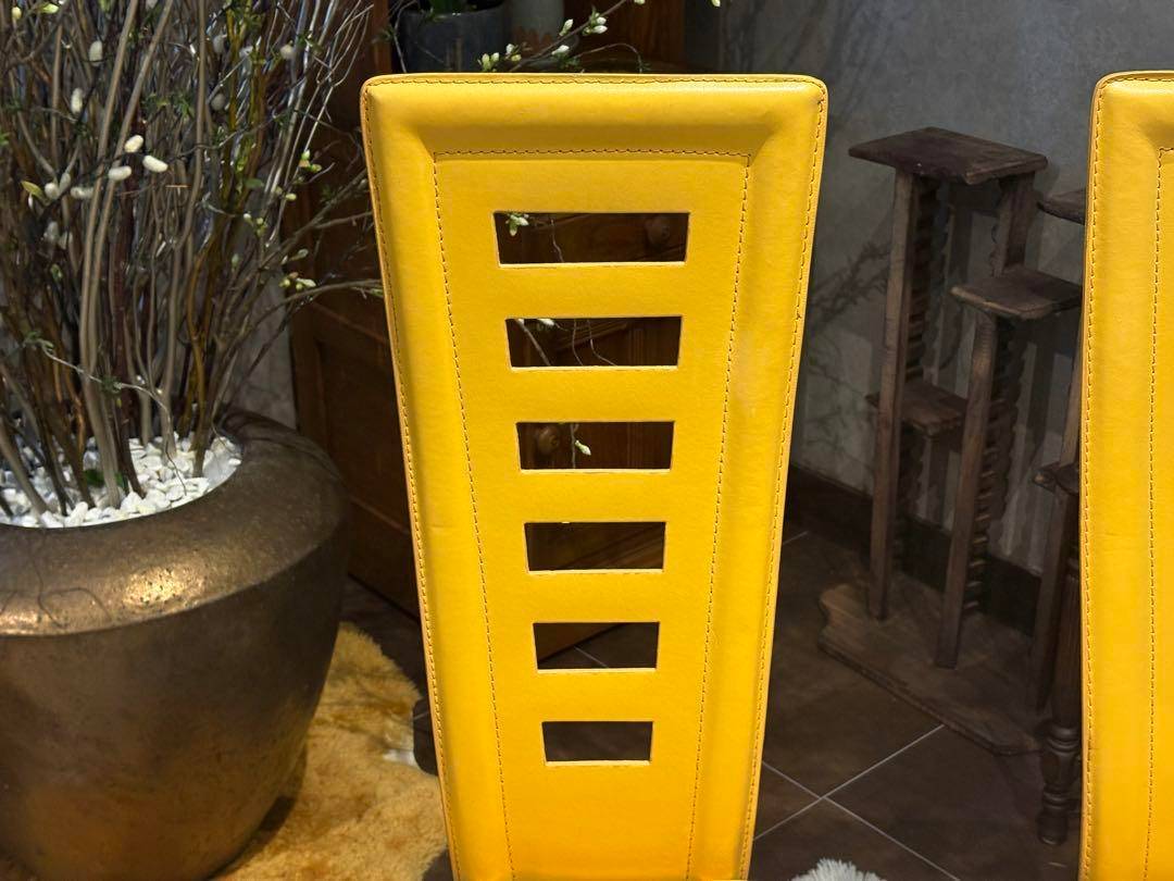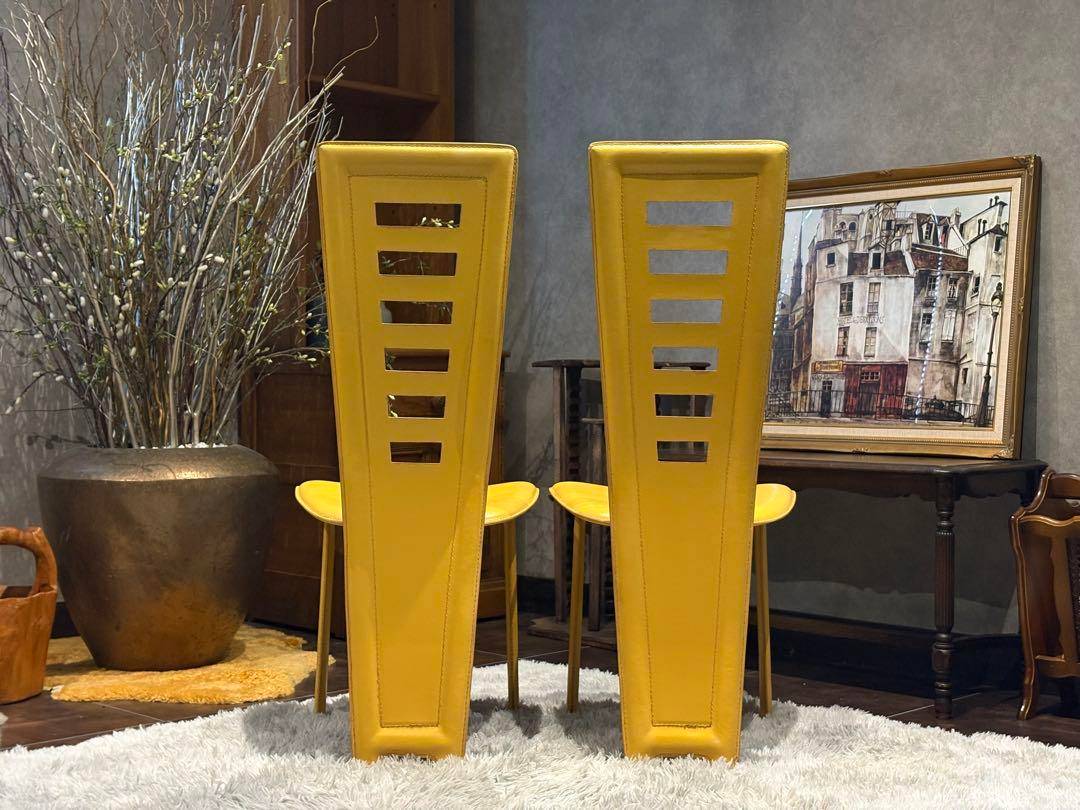 鮮やかなイエローの張地と個性的な背もたれデザインが特徴的で、空間にモダンで洗練されたアクセントを加えてくれます。