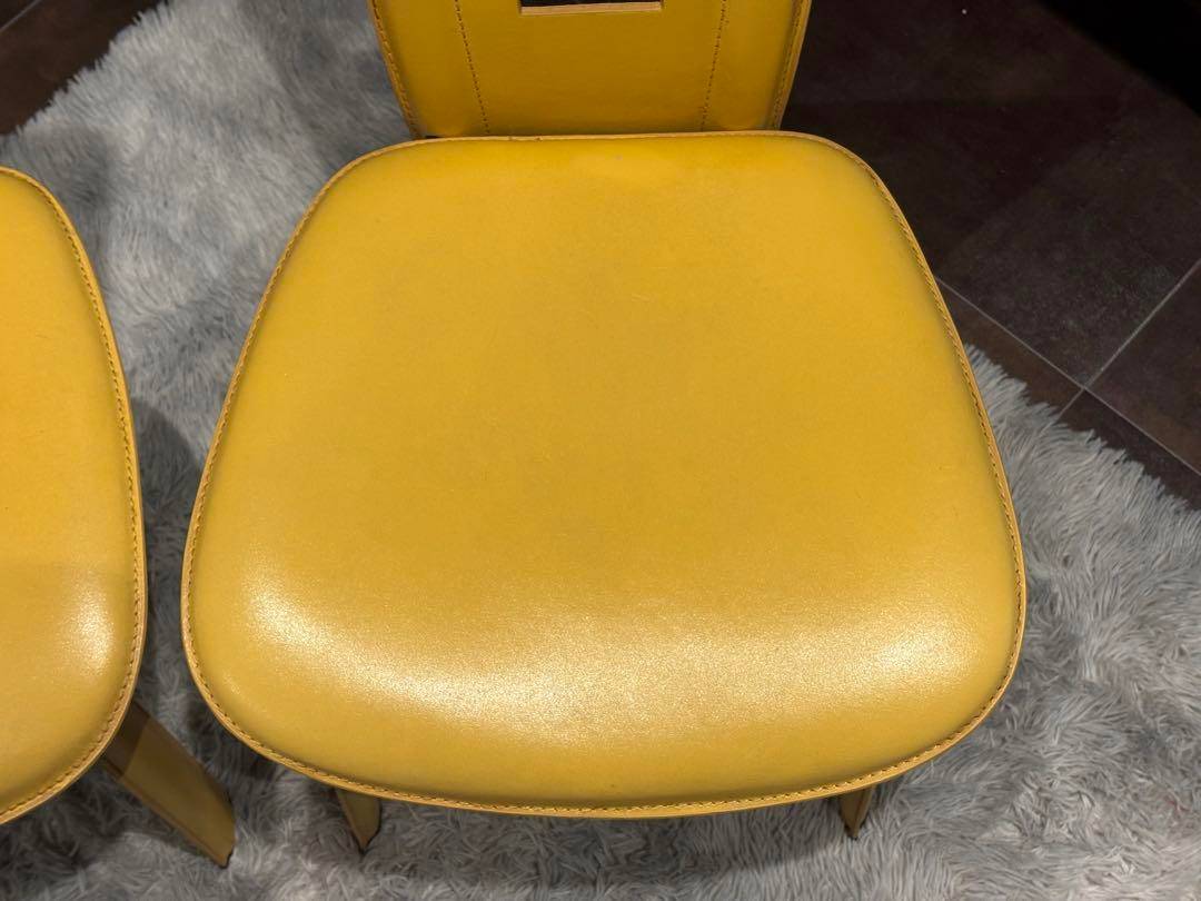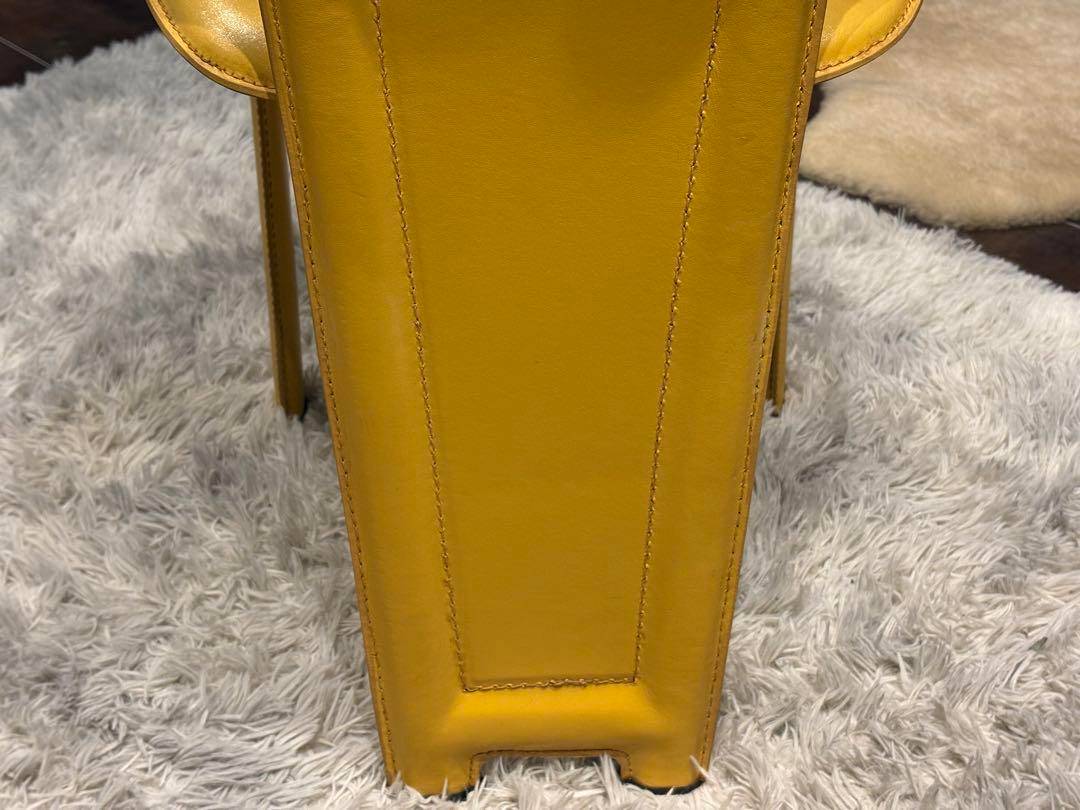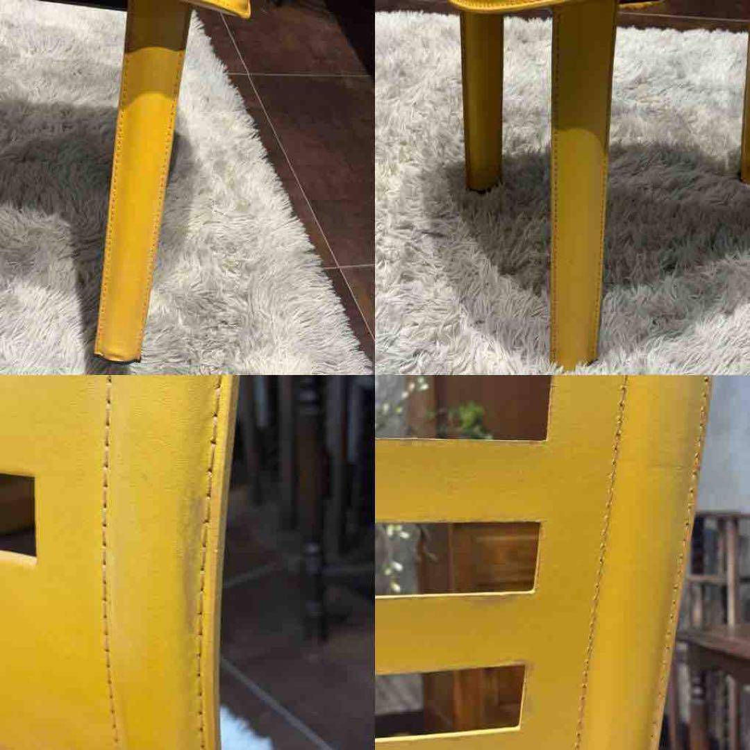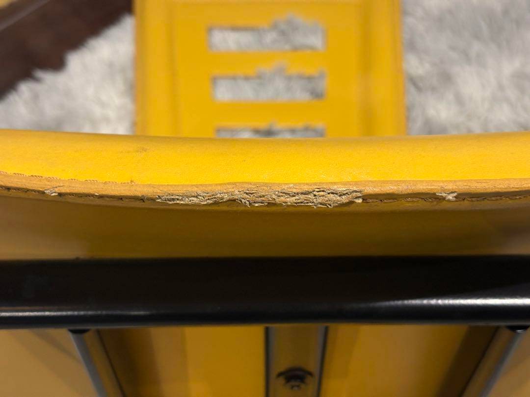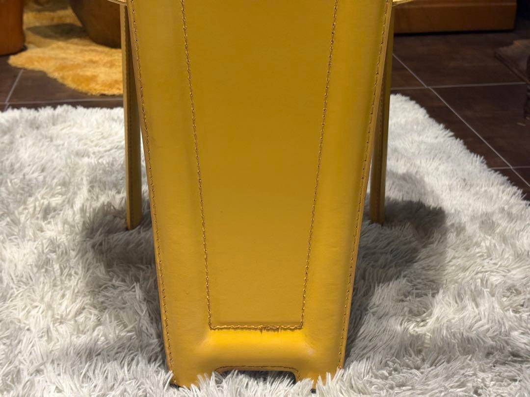 鮮やかなイエローの張地と個性的な背もたれデザインが特徴的で、空間にモダンで洗練されたアクセントを加えてくれます。