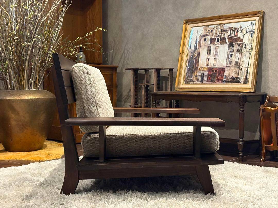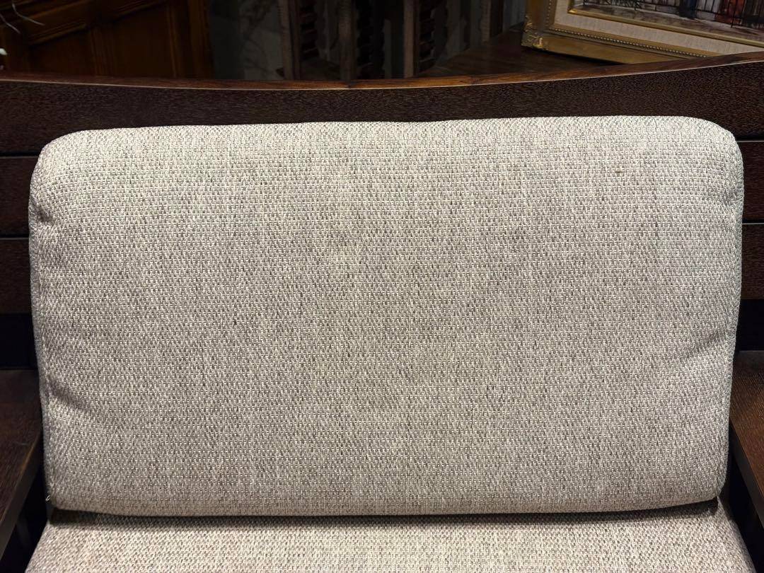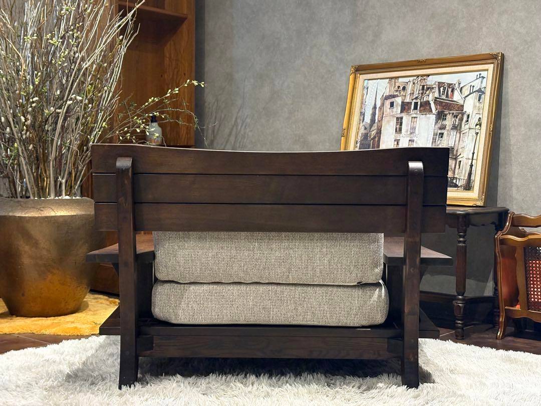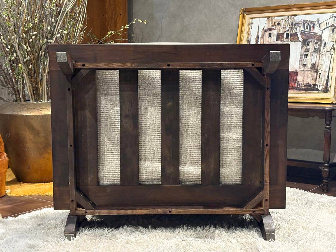 重厚感のある木製フレームと、落ち着いたベージュ系ファブリックの組み合わせが魅力。