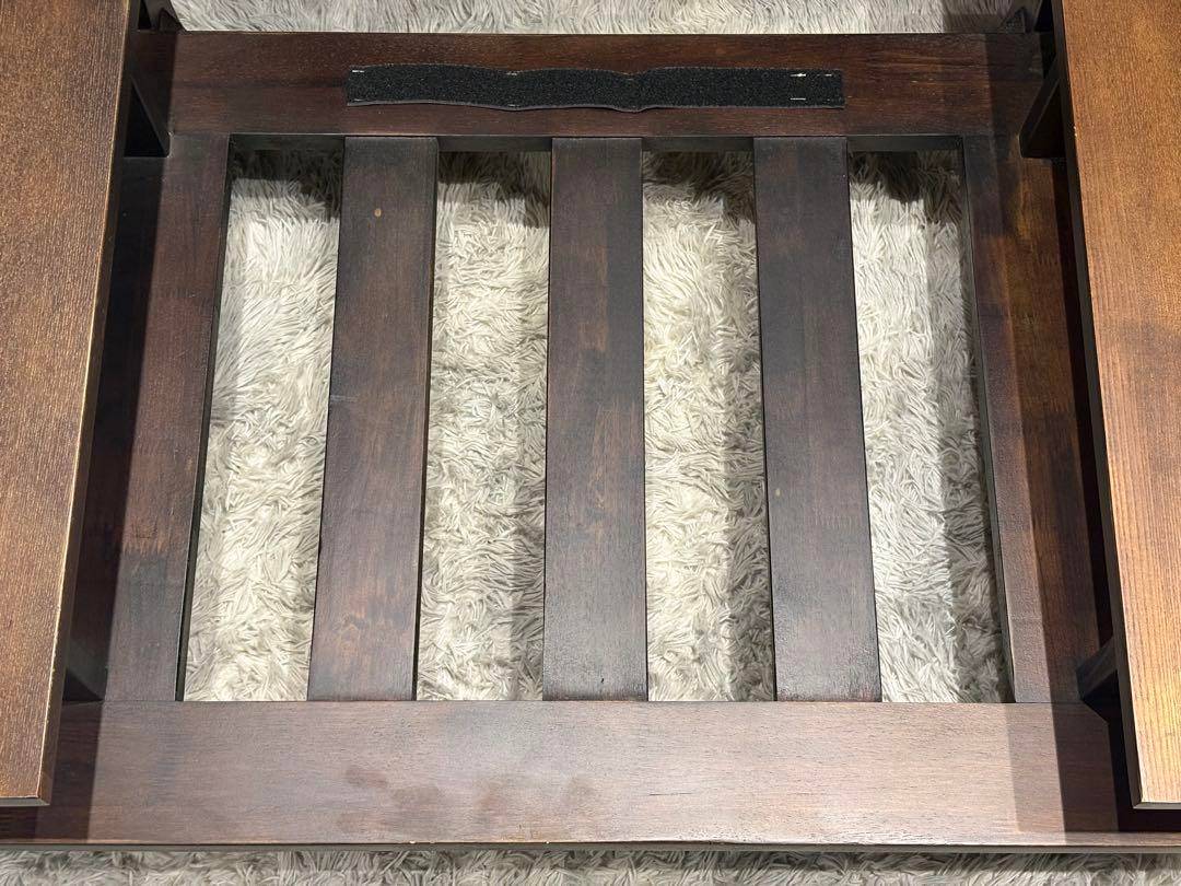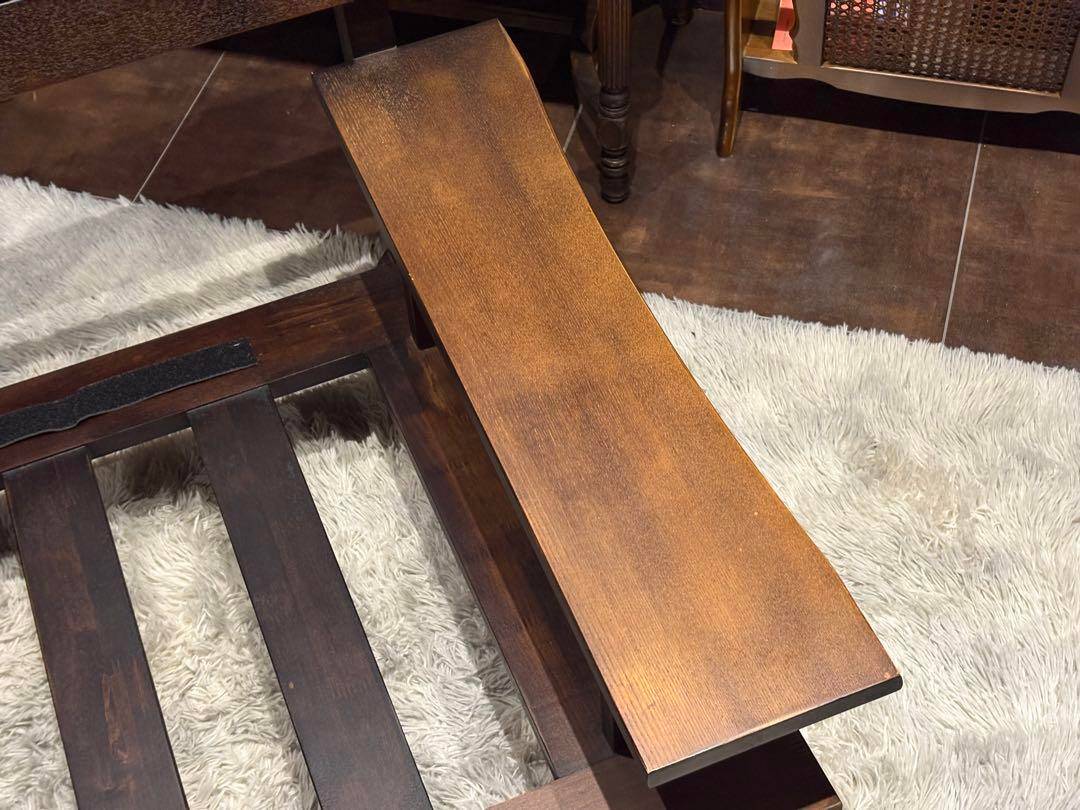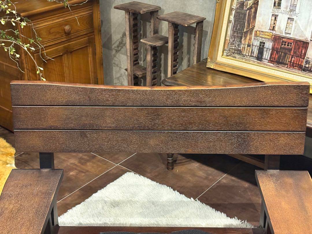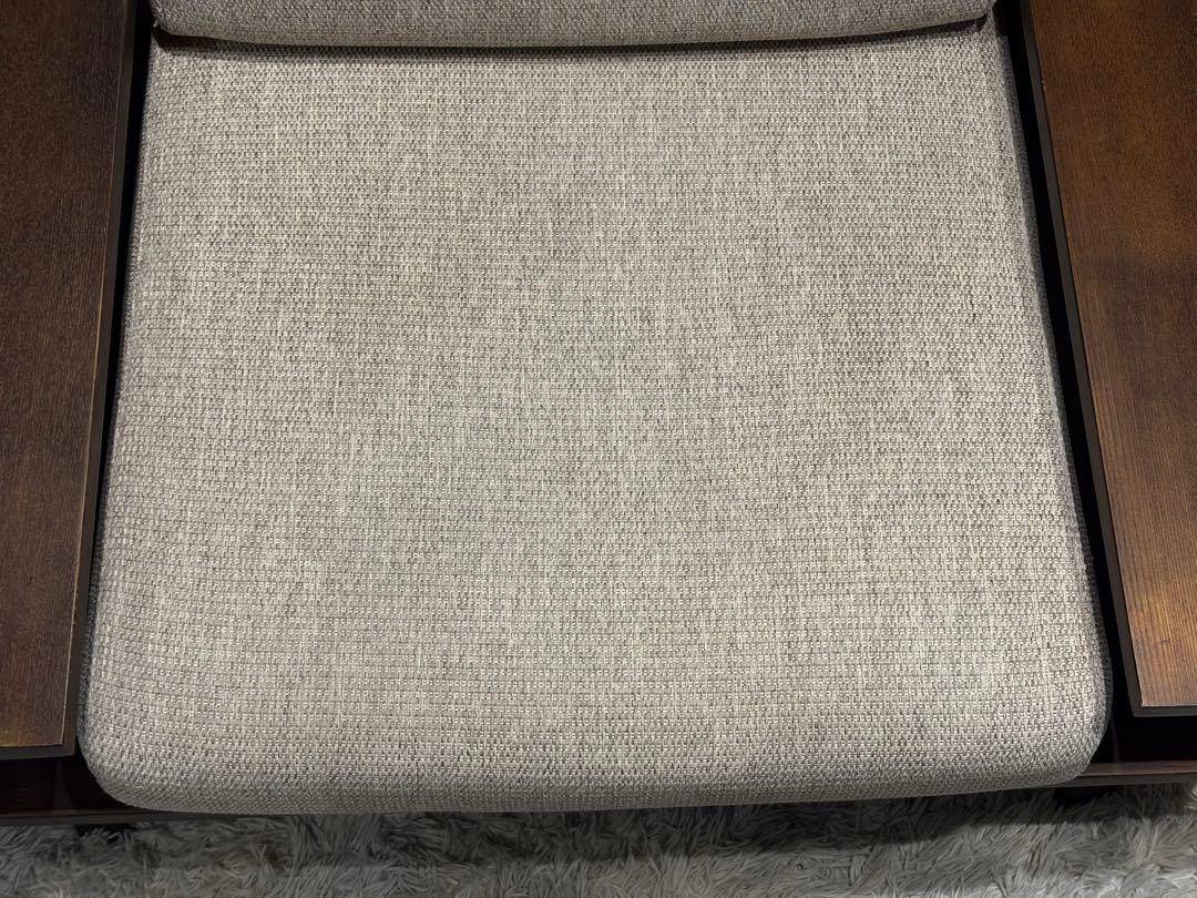 重厚感のある木製フレームと、落ち着いたベージュ系ファブリックの組み合わせが魅力。