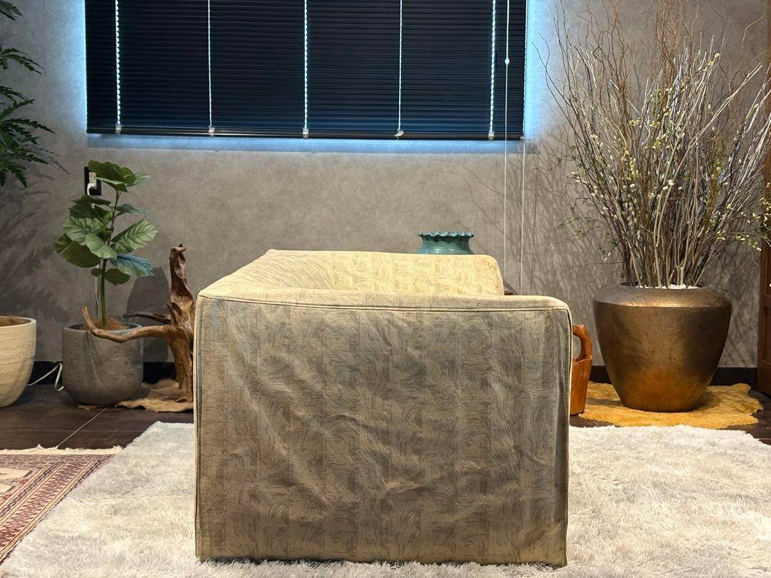 淡いトーンのファブリックが空間に柔らかさを加え、