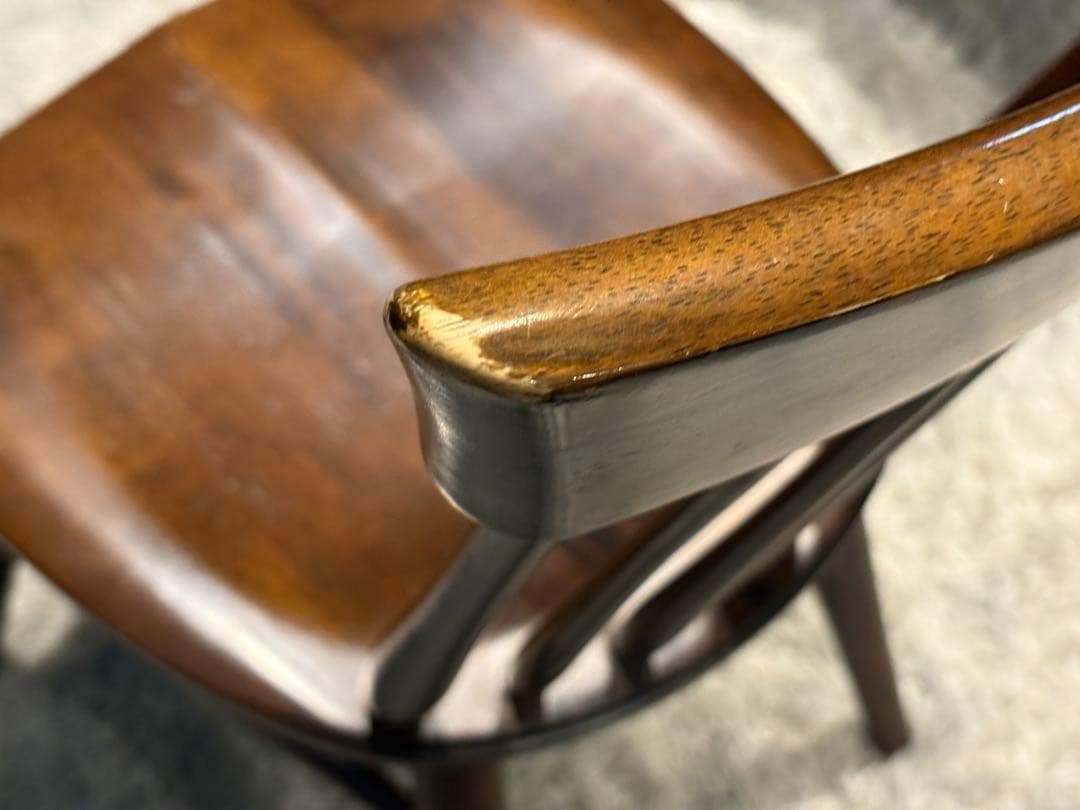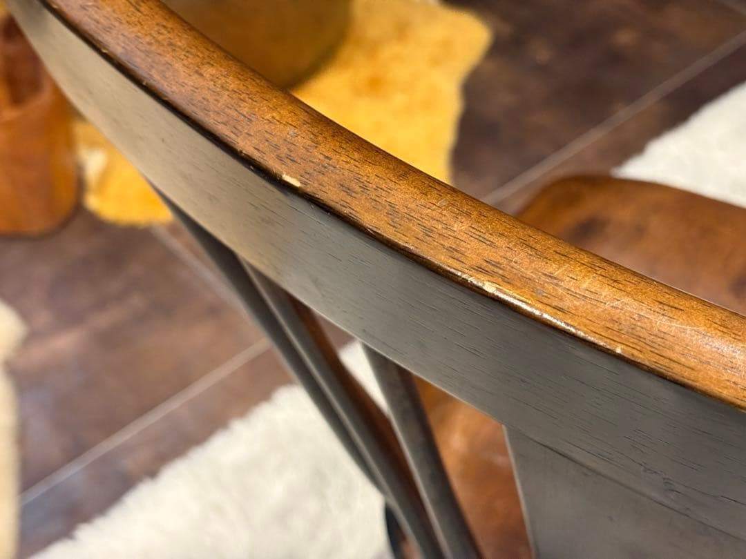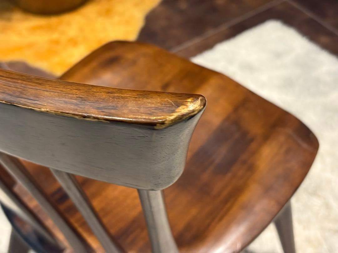 シンプルでありながら存在感のあるスポークデザインが特徴で、無垢材の質感とクラフトマンシップがしっかりと感じられる一脚。