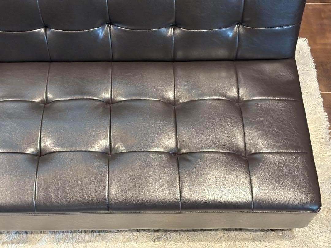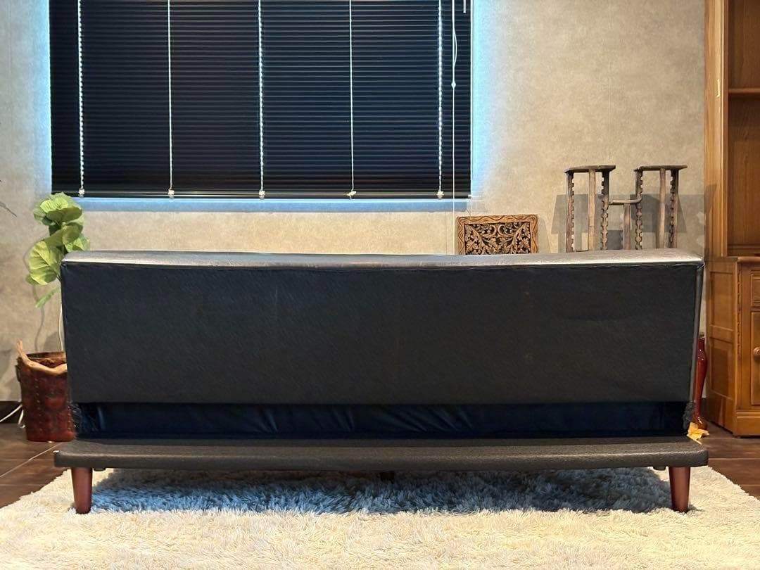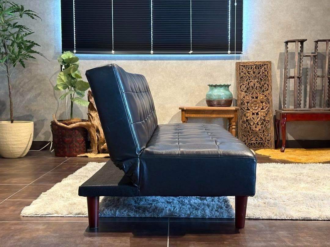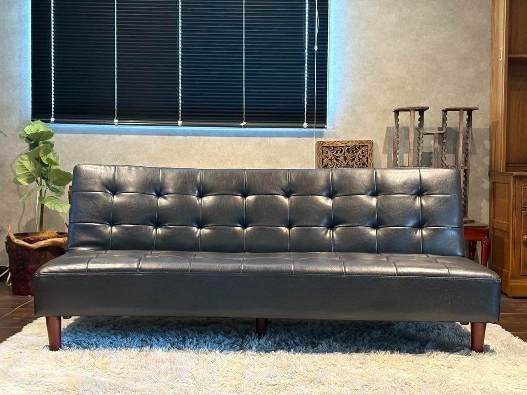 3人掛けソファ ソファベッド レザーソファ ブラックソファ ボタンダウン ミッドセンチュリー モダンソファ カリモク風 黒ソファ ビンテージソファ ヴィンテージ アンティーク 木脚ソファ 合皮ソファ レトロ家具 リビング家具 高級感 モノトーン家具 インテリアソファ 折りたたみ 3人用 2人用 3Pソファ 2Pソファ