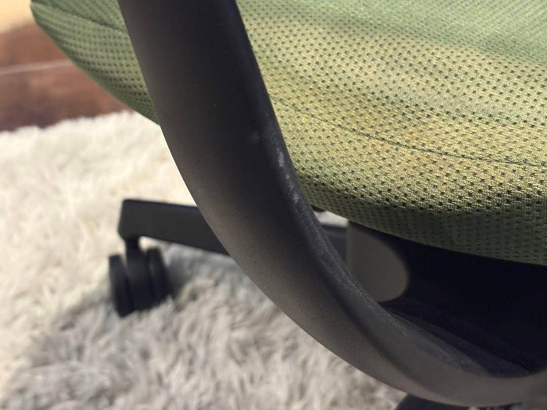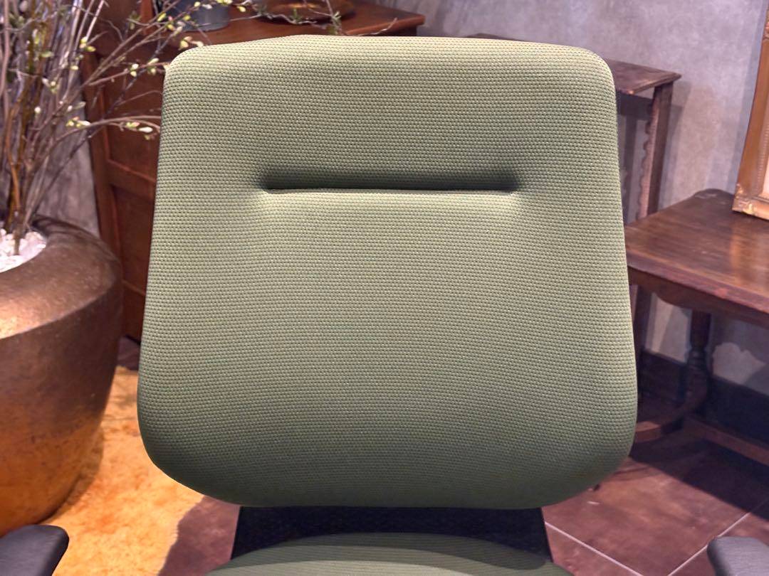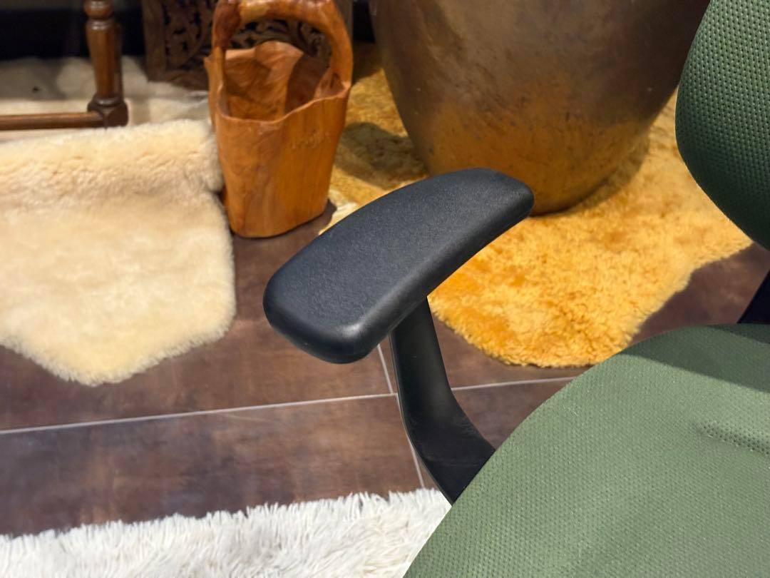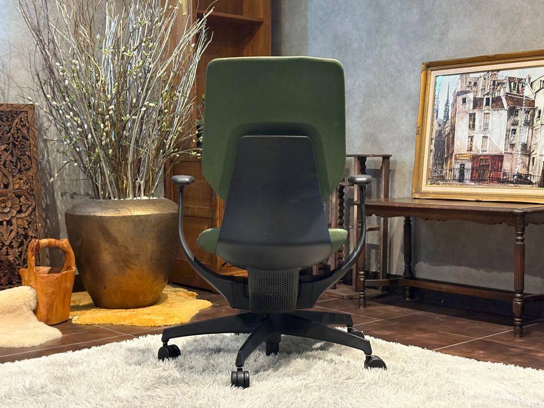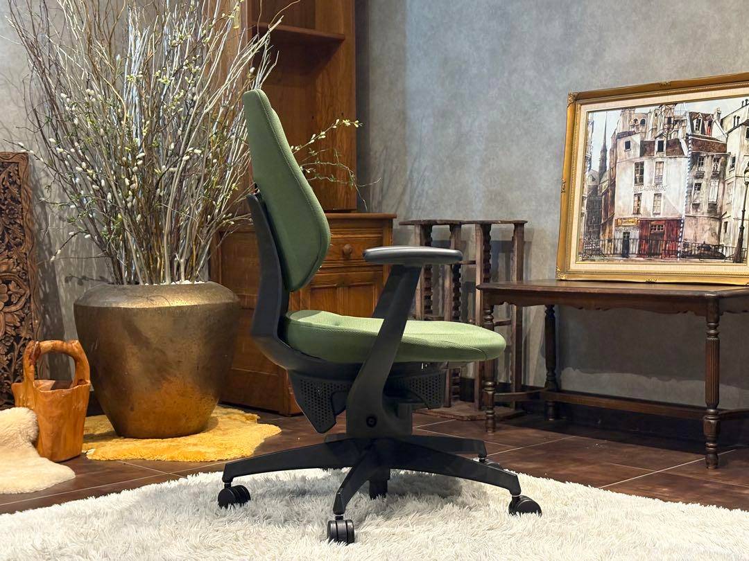 シンプルながら機能性に優れたオフィスチェアで、背もたれと座面にはグリーンのファブリックを使用。