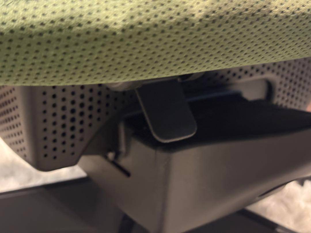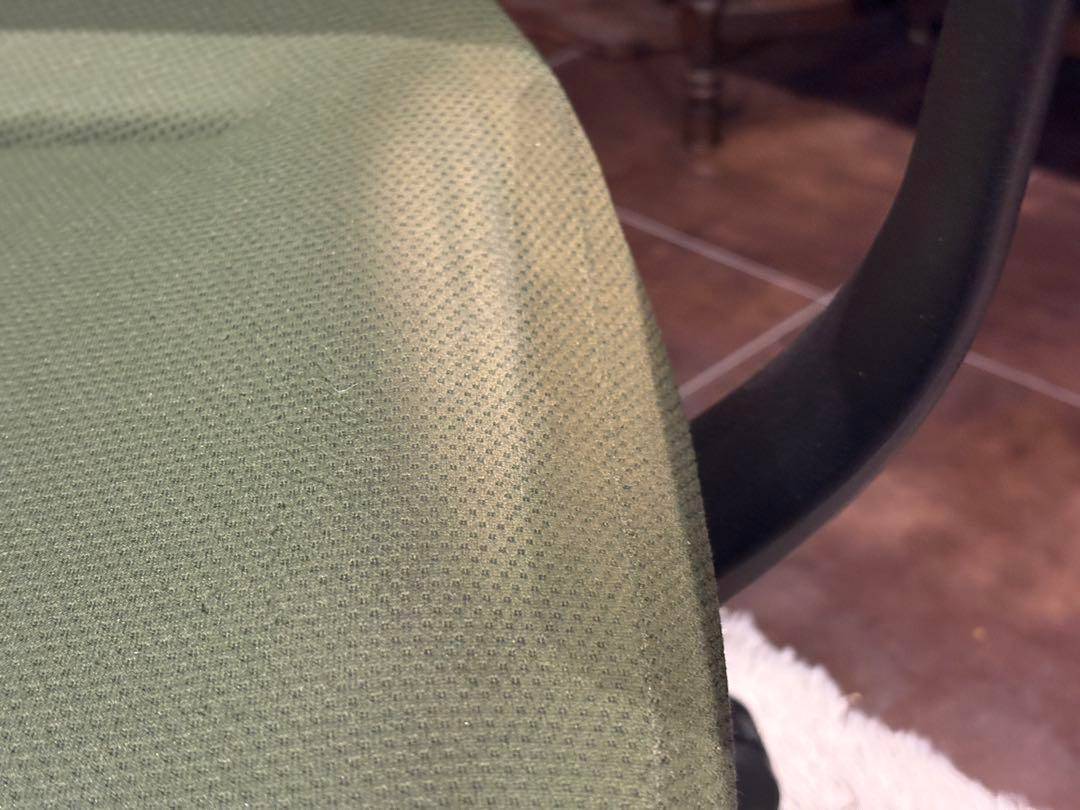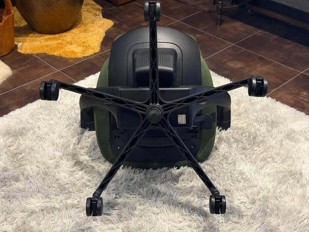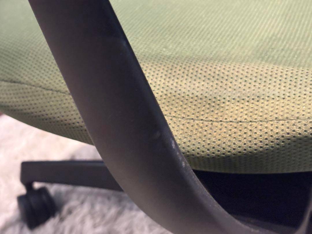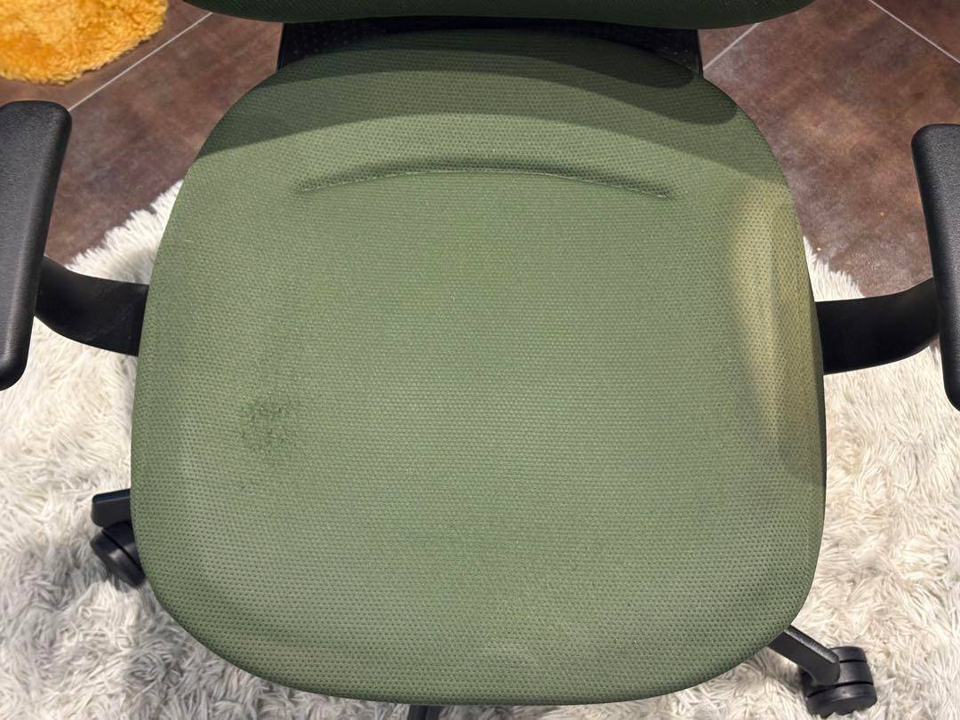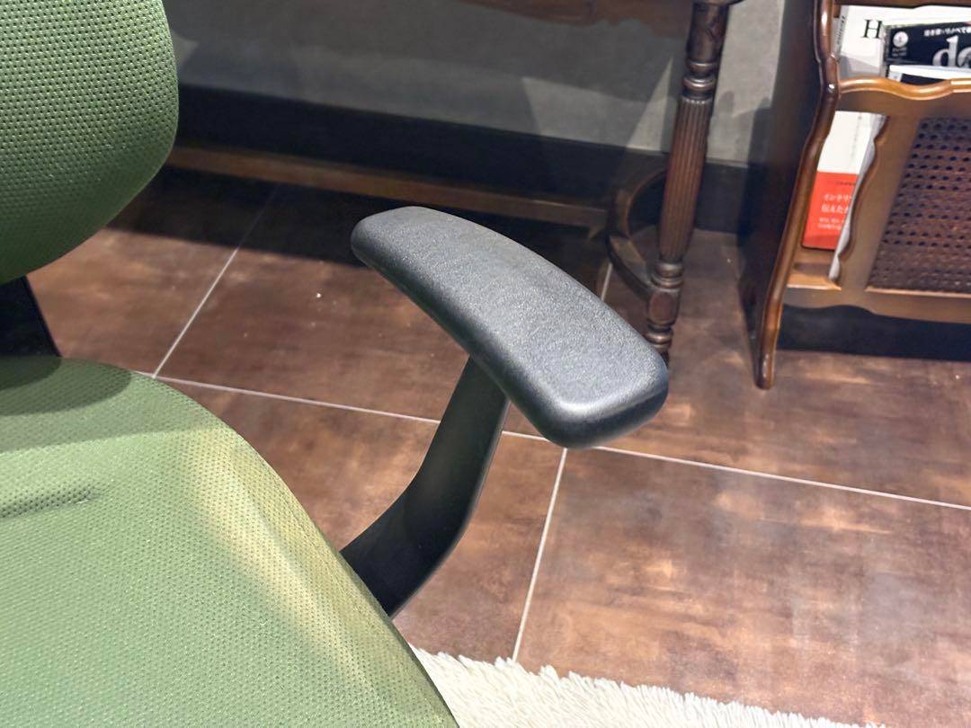 シンプルながら機能性に優れたオフィスチェアで、背もたれと座面にはグリーンのファブリックを使用。