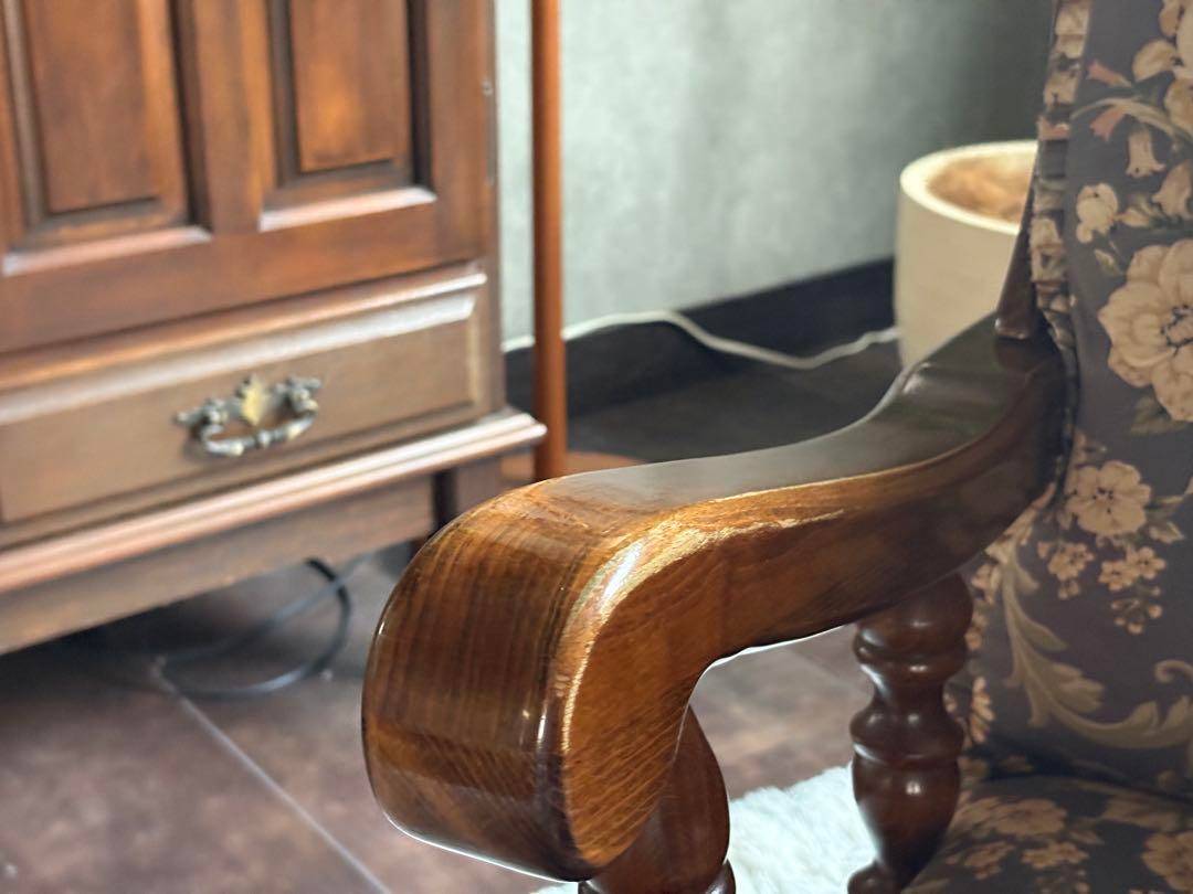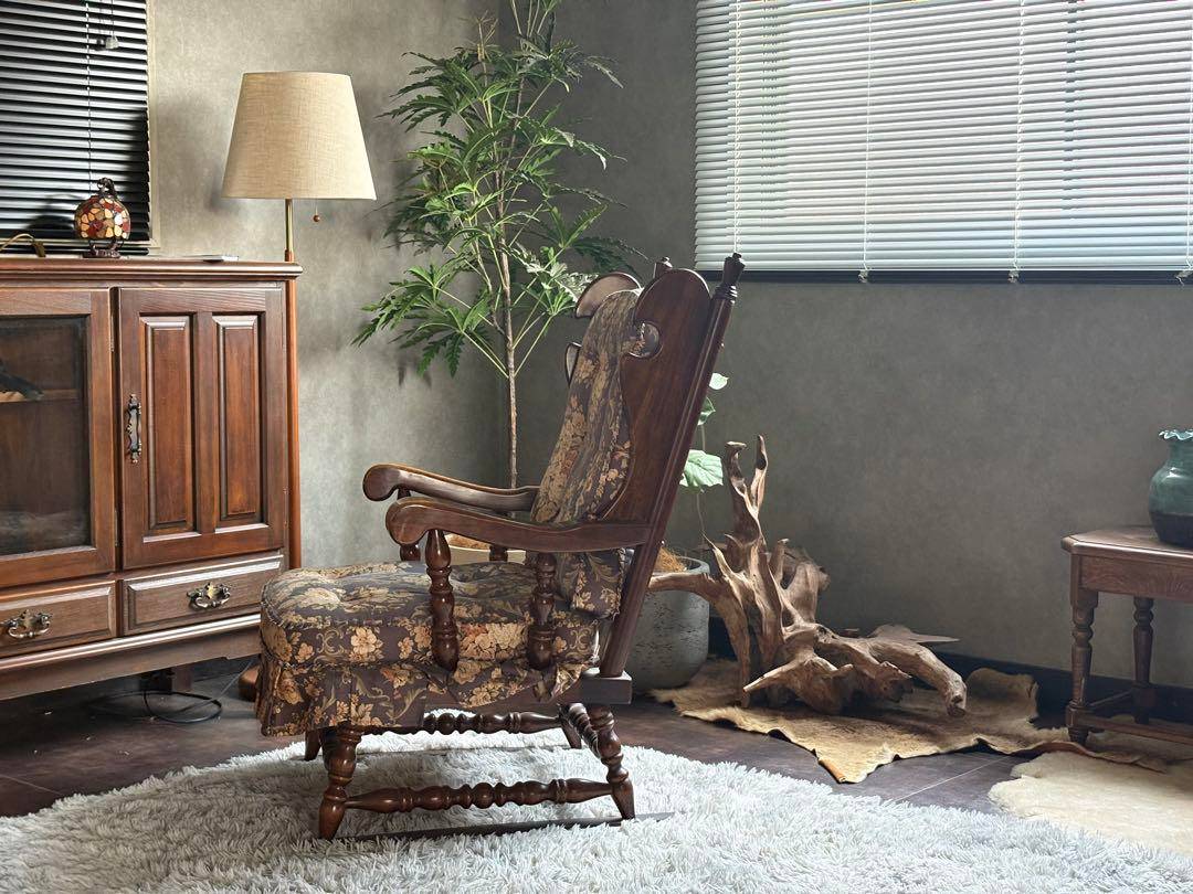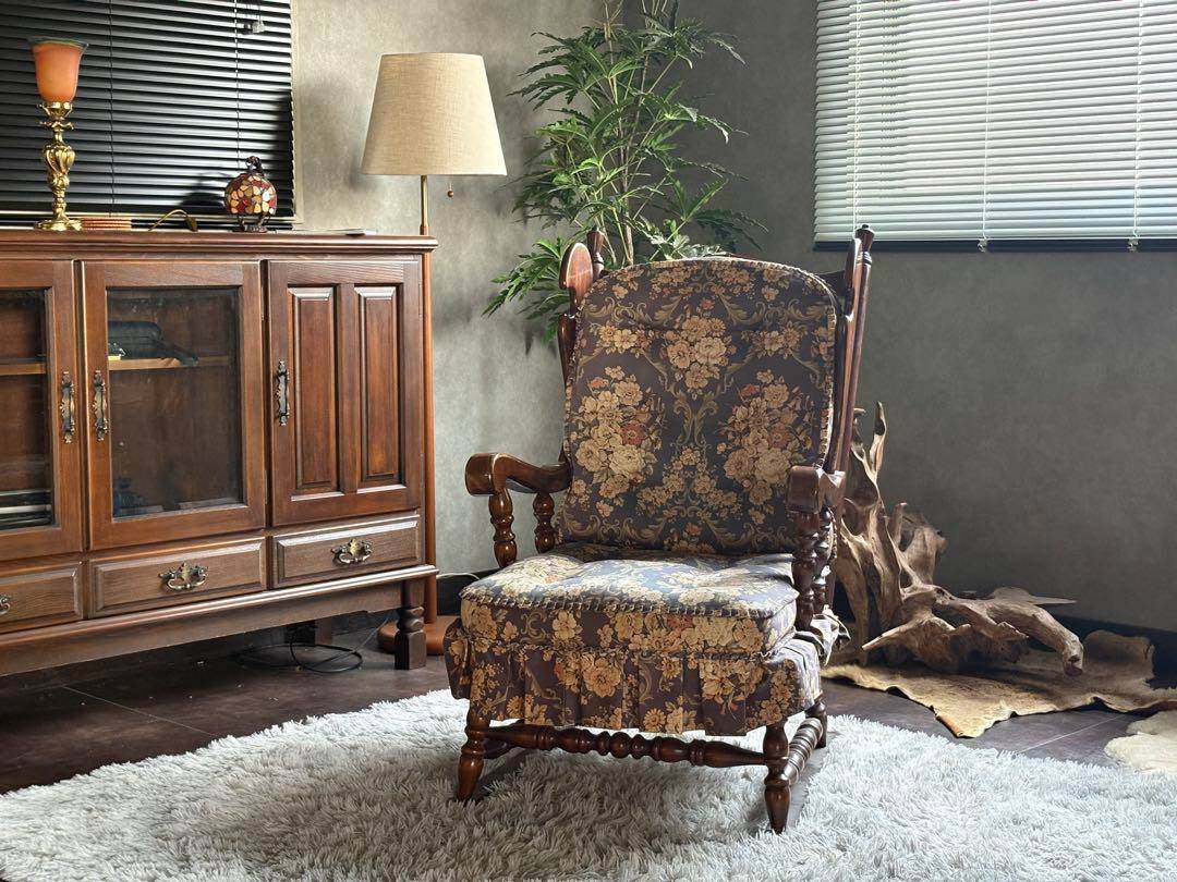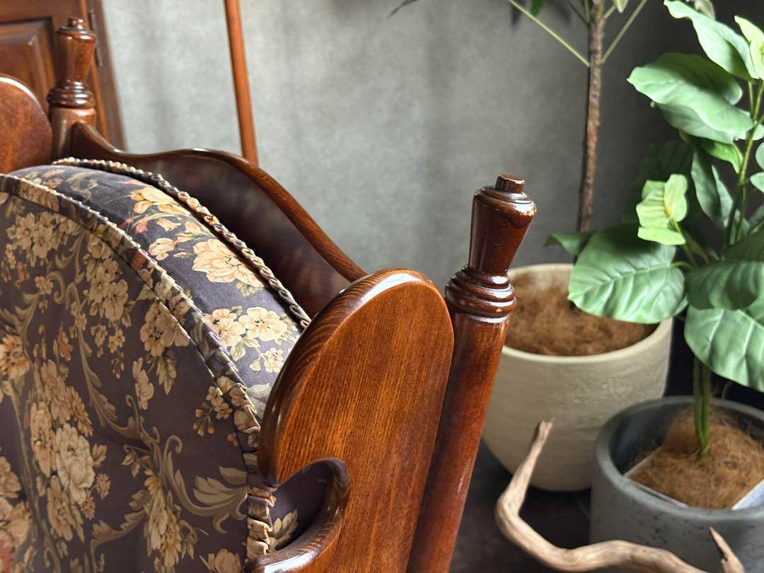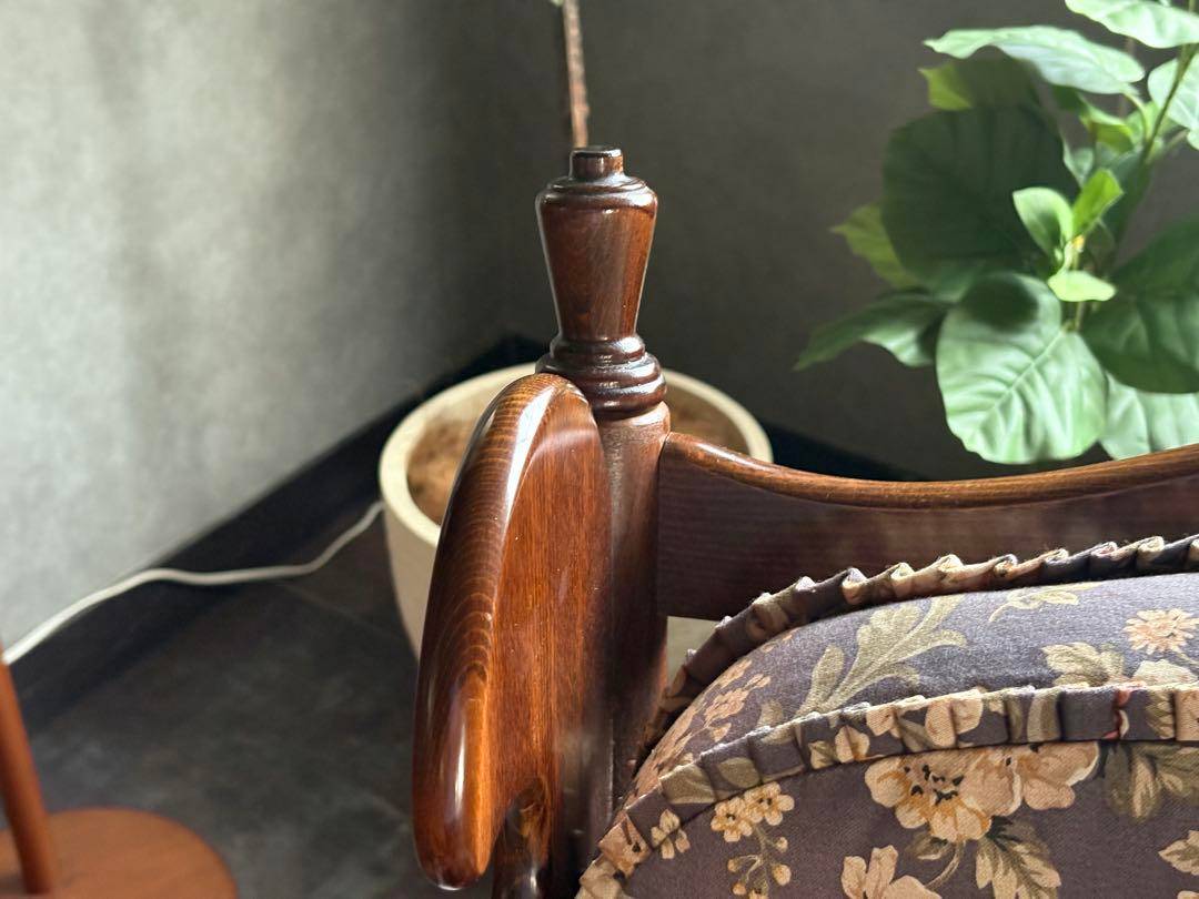 無垢材を贅沢に使用したしっかりとしたフレームに、クラシカルな花柄ファブリックが組み合わさったヴィンテージならではの一脚です。