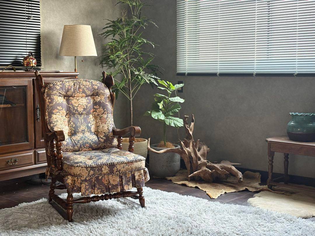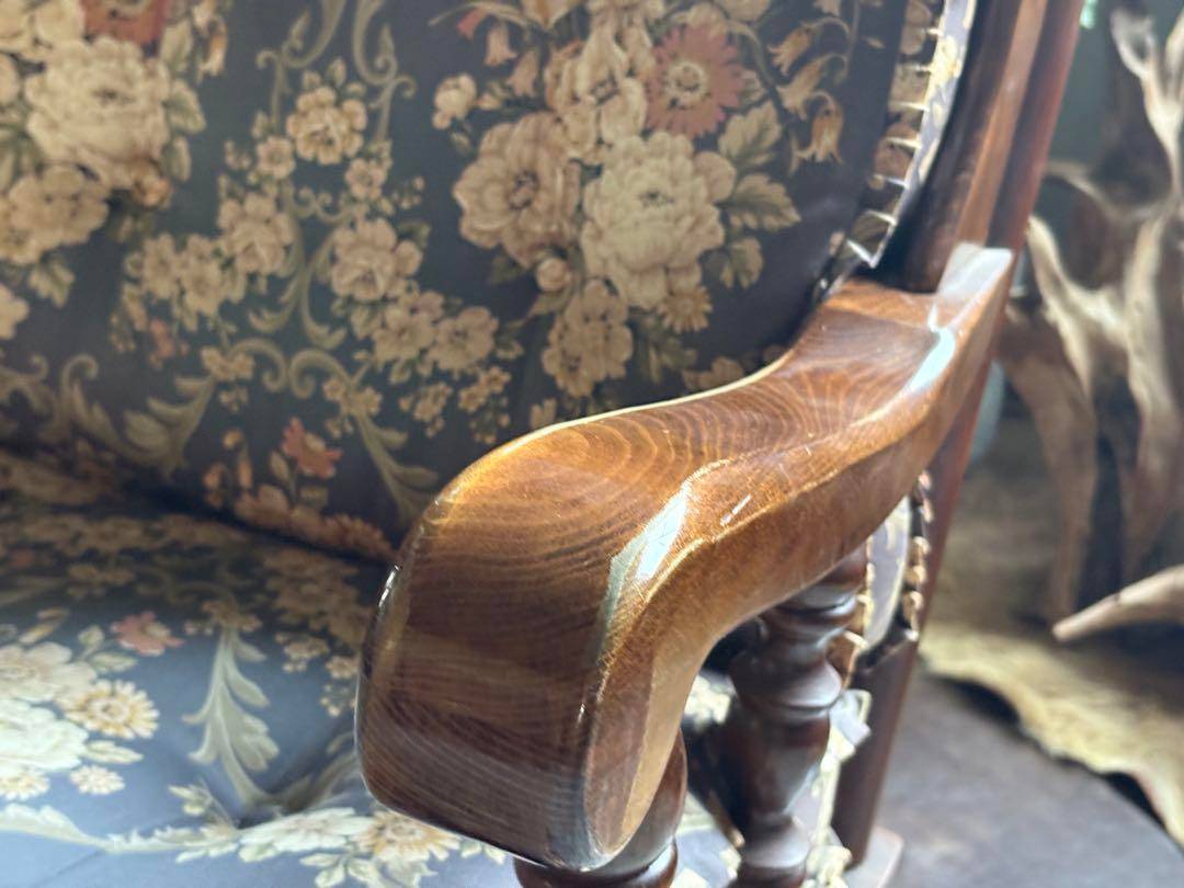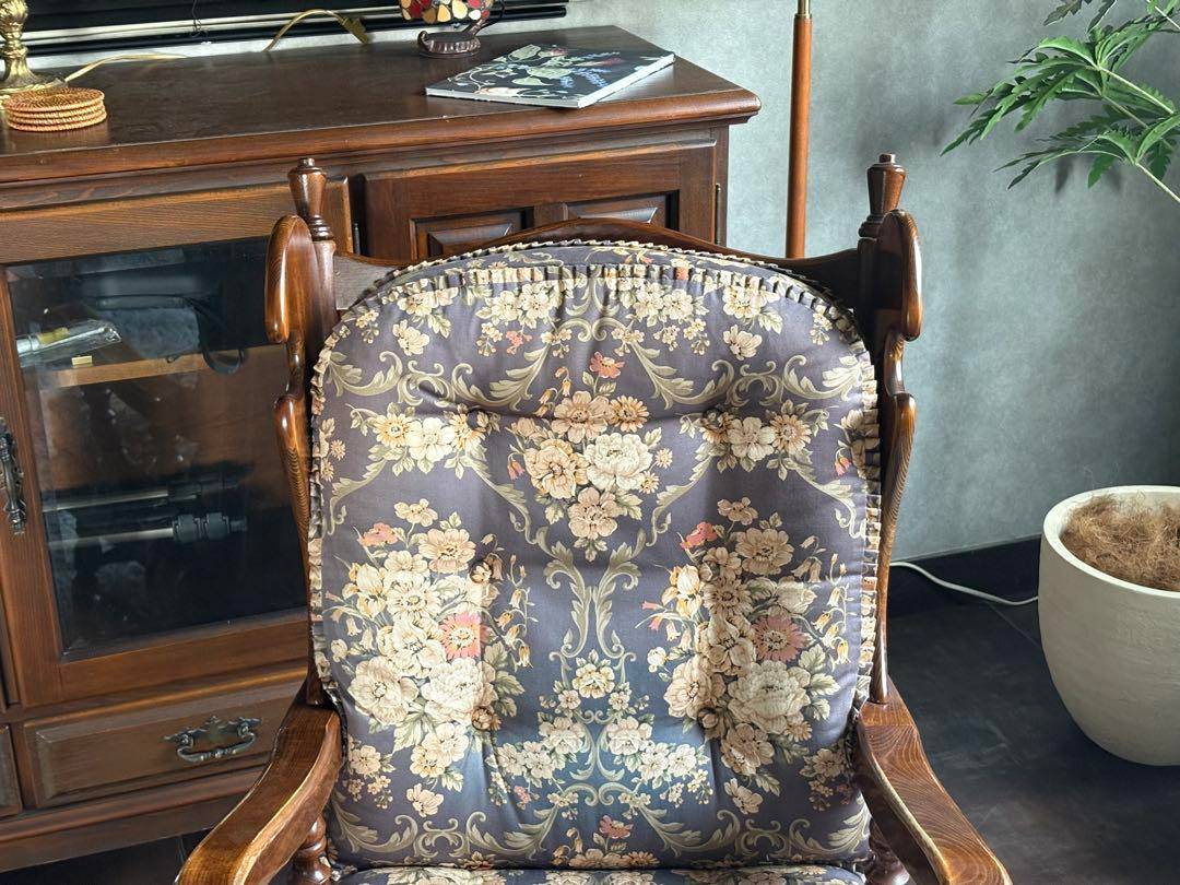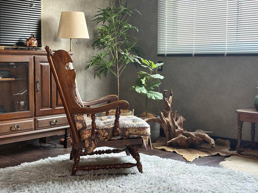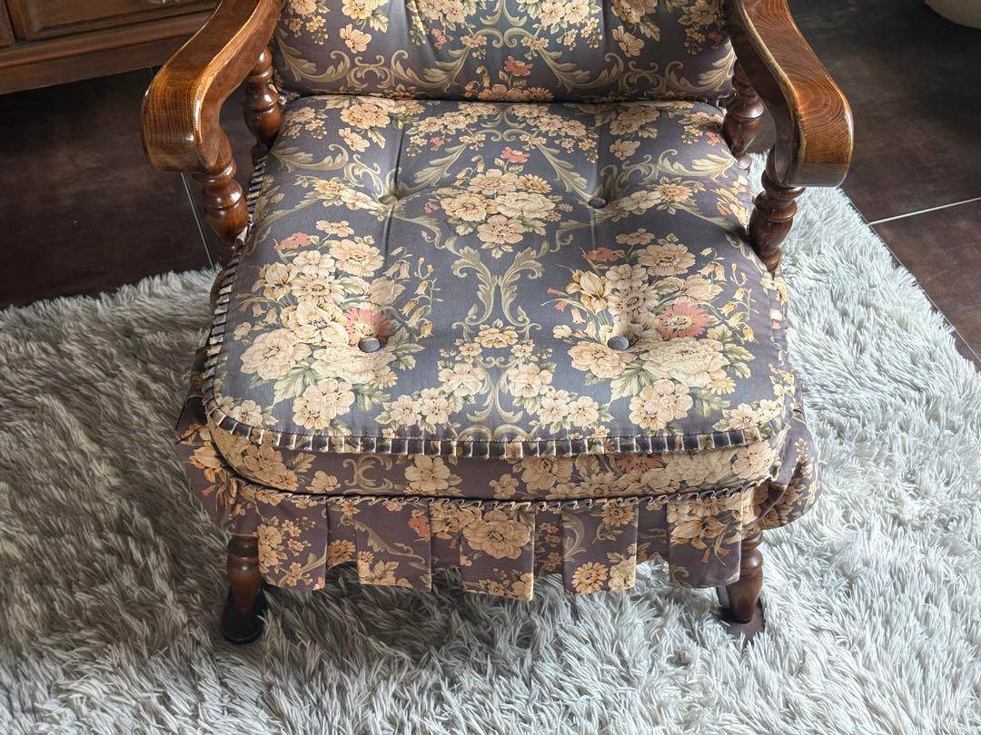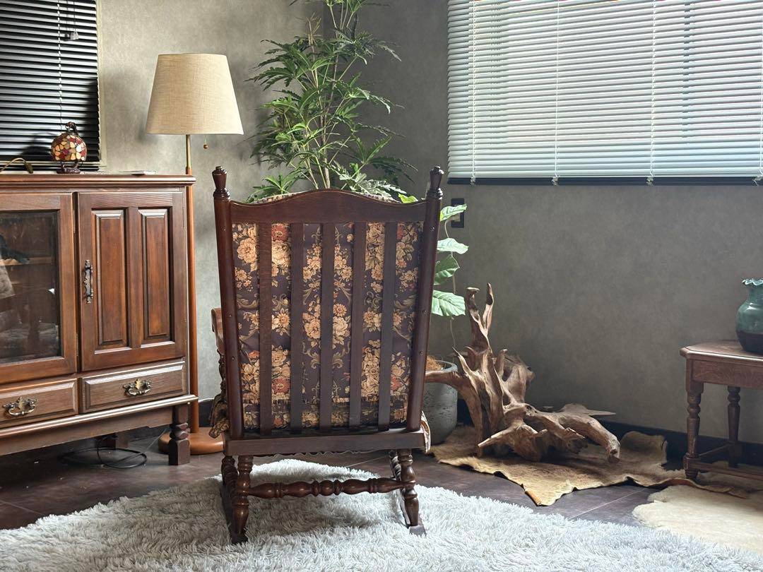 無垢材を贅沢に使用したしっかりとしたフレームに、クラシカルな花柄ファブリックが組み合わさったヴィンテージならではの一脚です。
