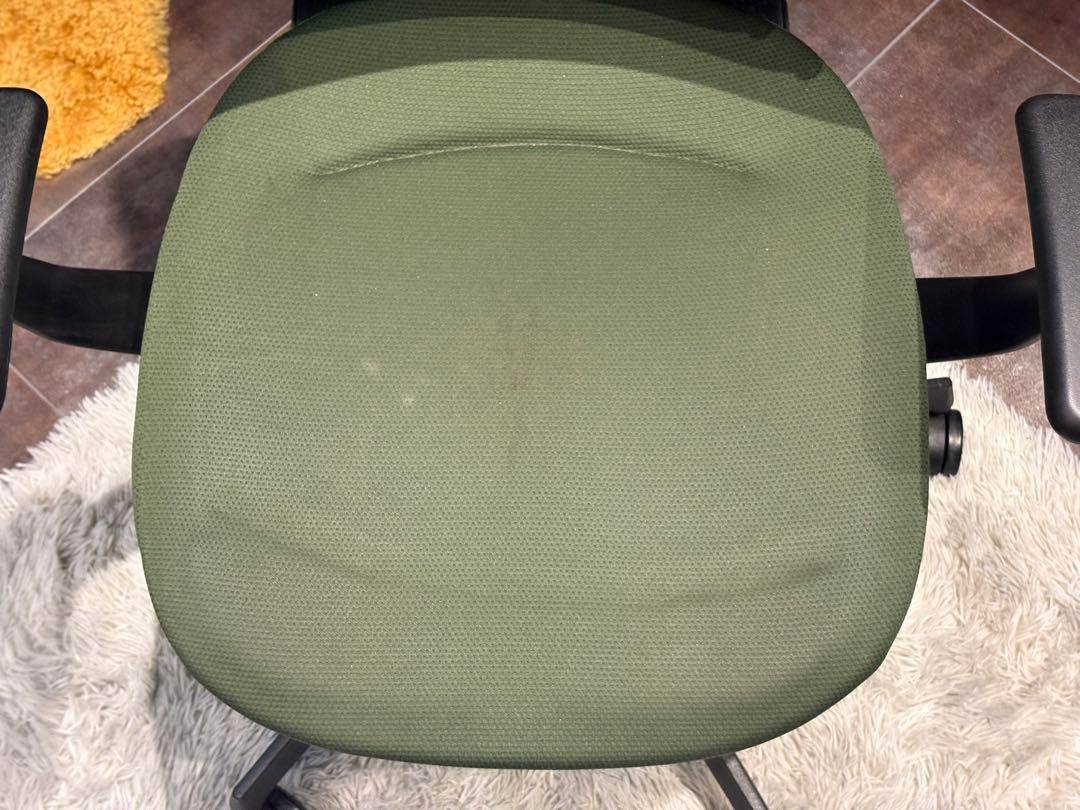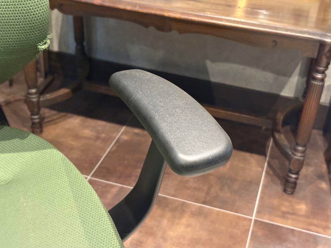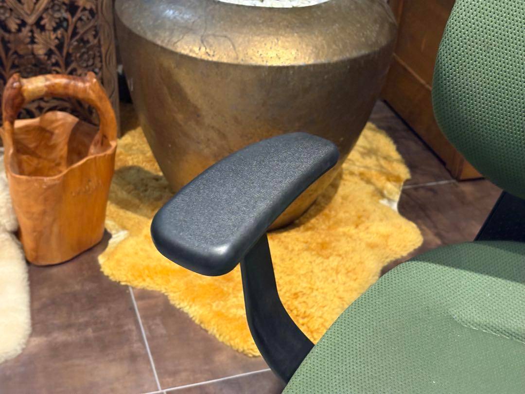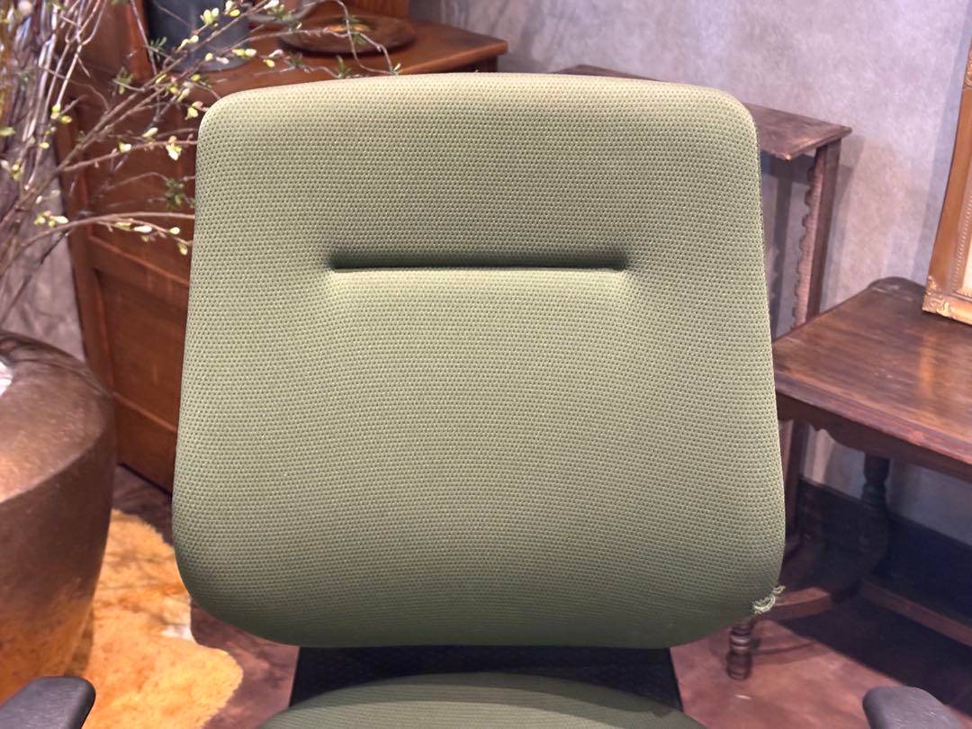 シンプルながら機能性に優れたオフィスチェアで、背もたれと座面にはグリーンのファブリックを使用。