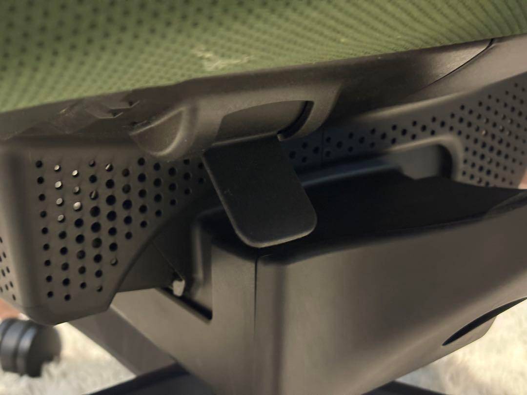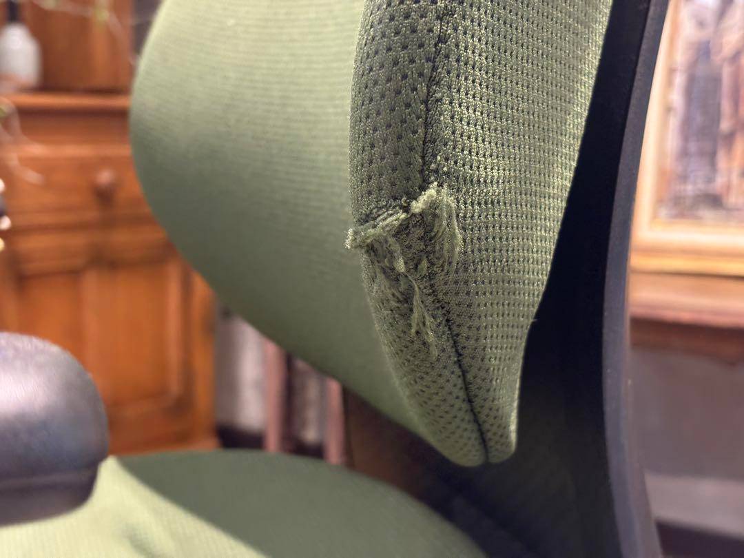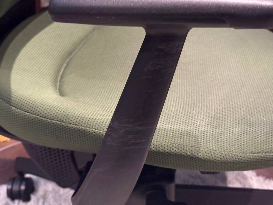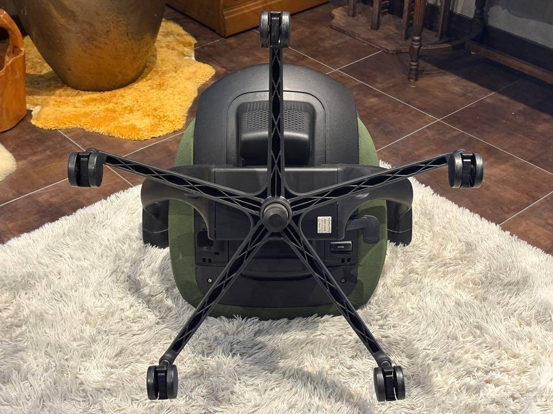 シンプルながら機能性に優れたオフィスチェアで、背もたれと座面にはグリーンのファブリックを使用。