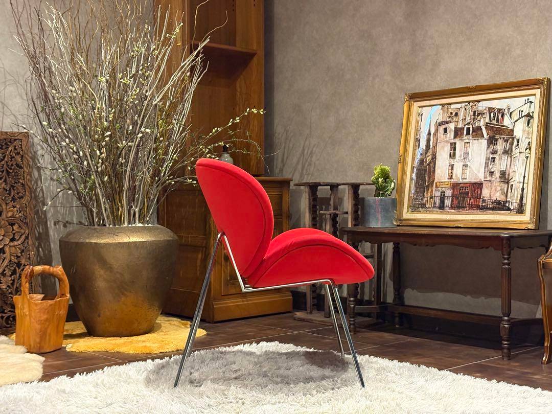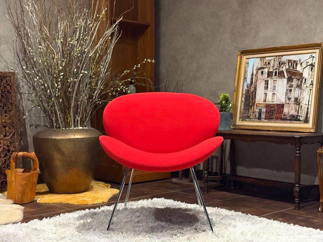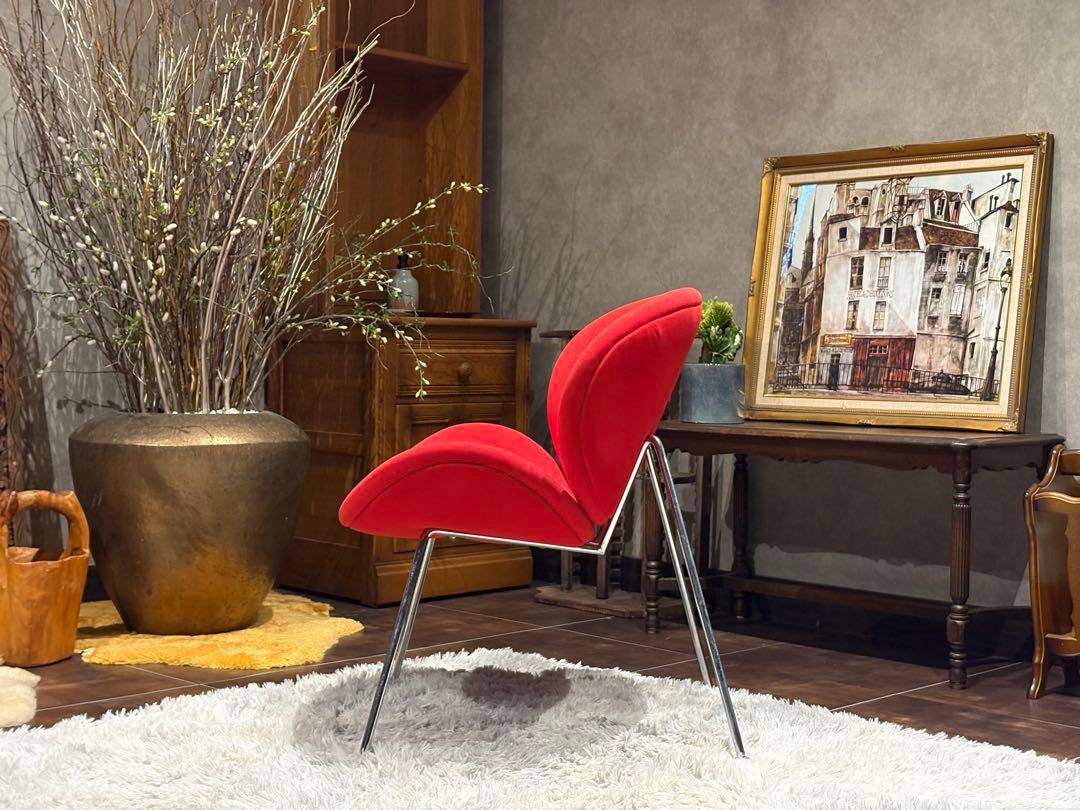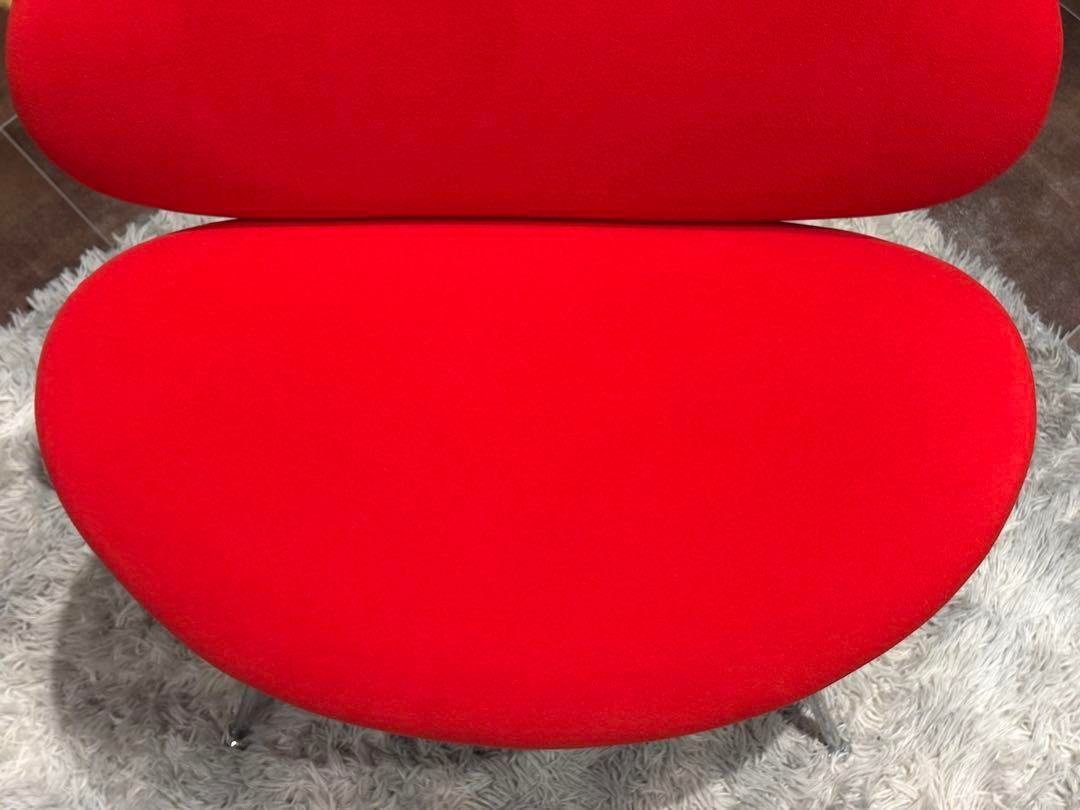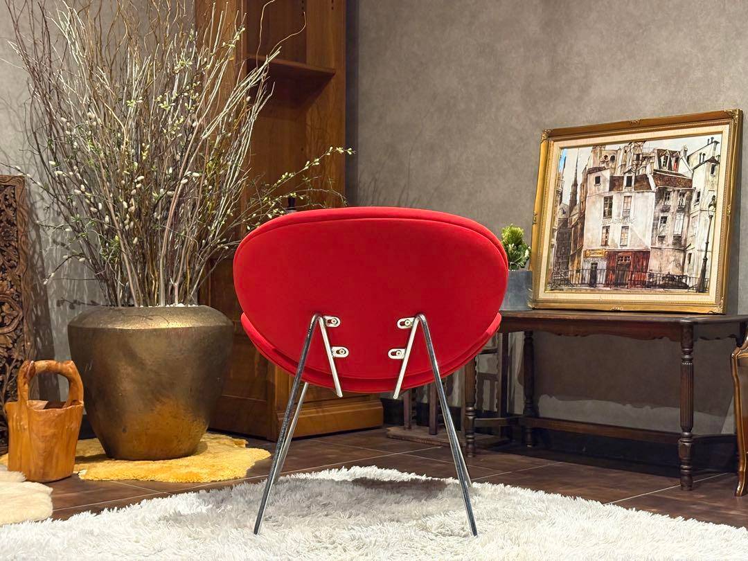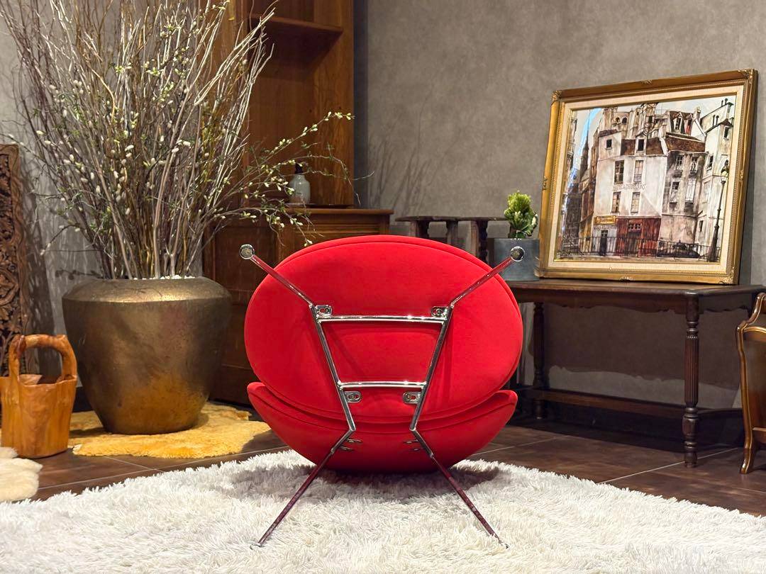 鮮やかなレッドのファブリックと、クロームの脚部が洗練されたモダンな雰囲気を演出。