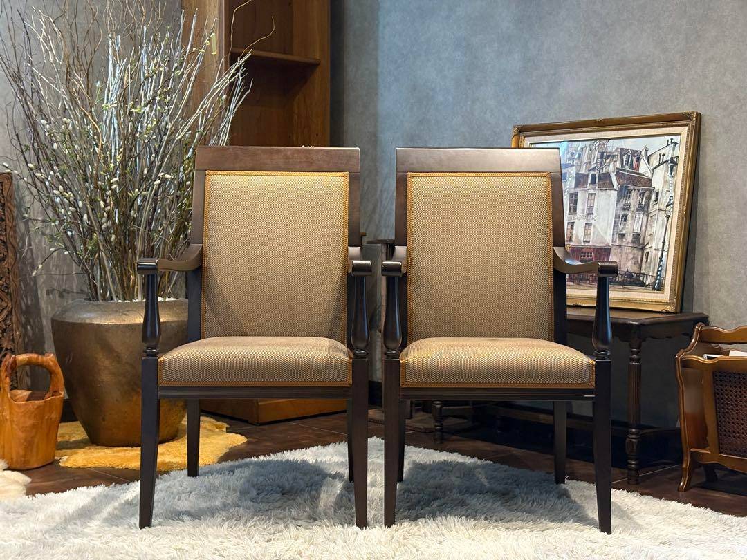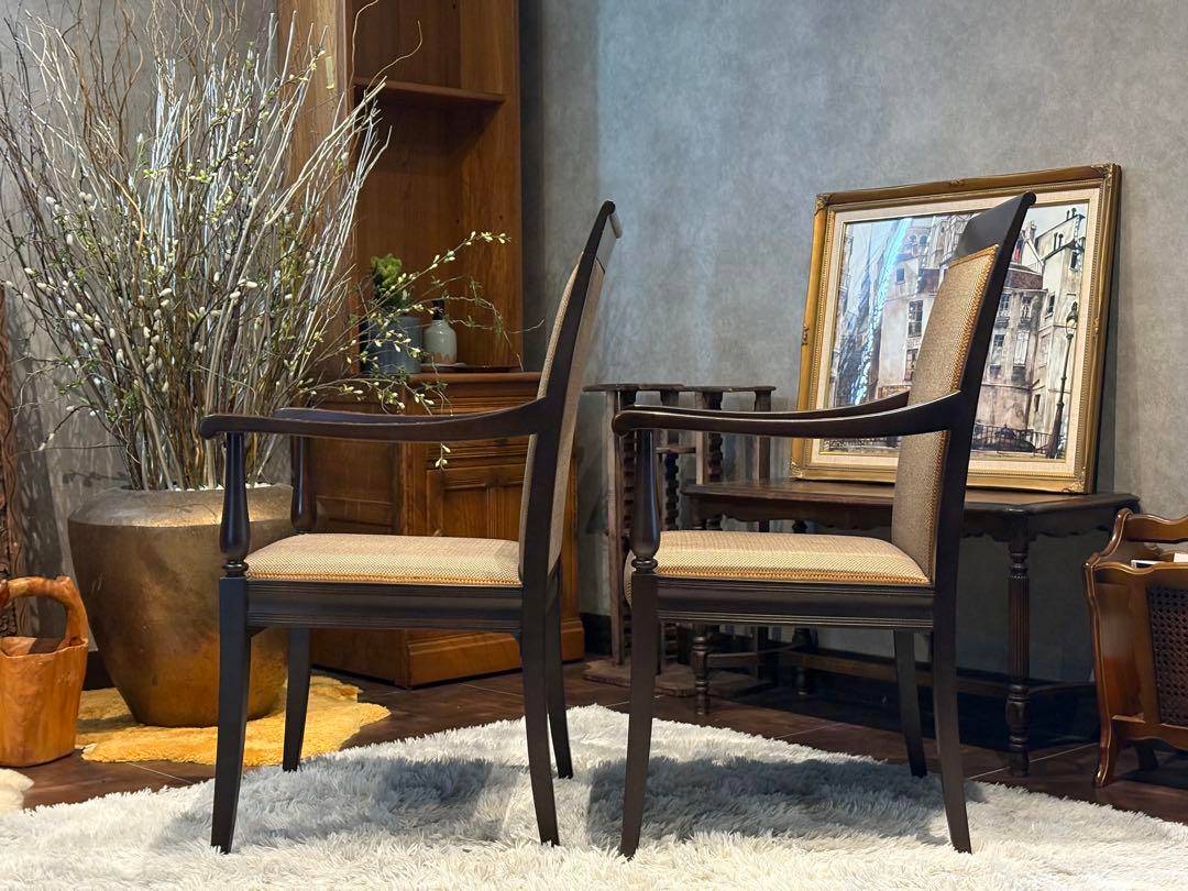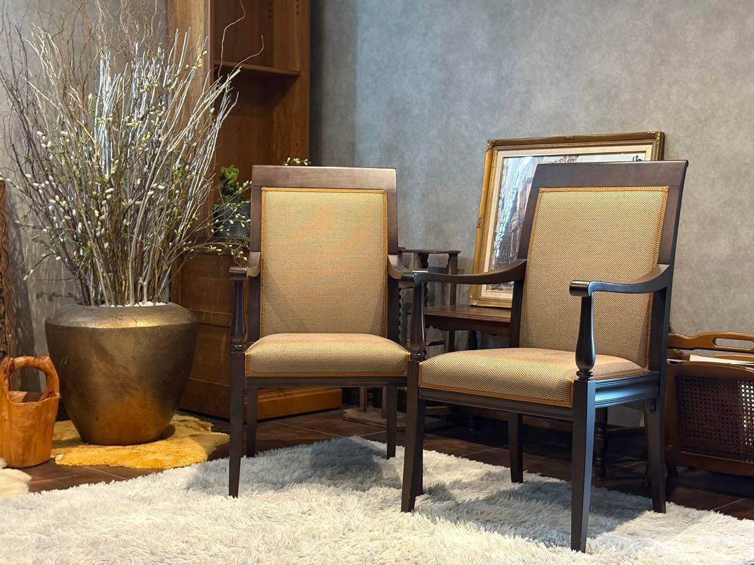 ゆったりとした背もたれと肘掛けが快適な座り心地を生み、ダイニングや応接スペースに品格を添えてくれる一脚です。