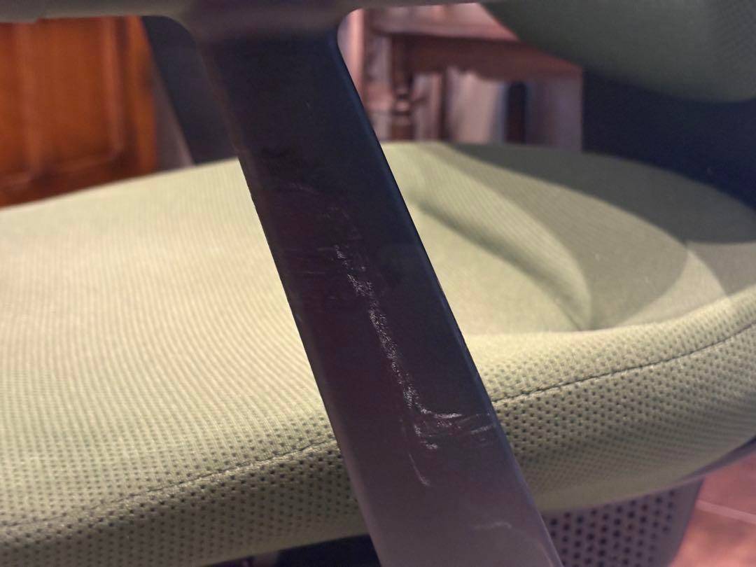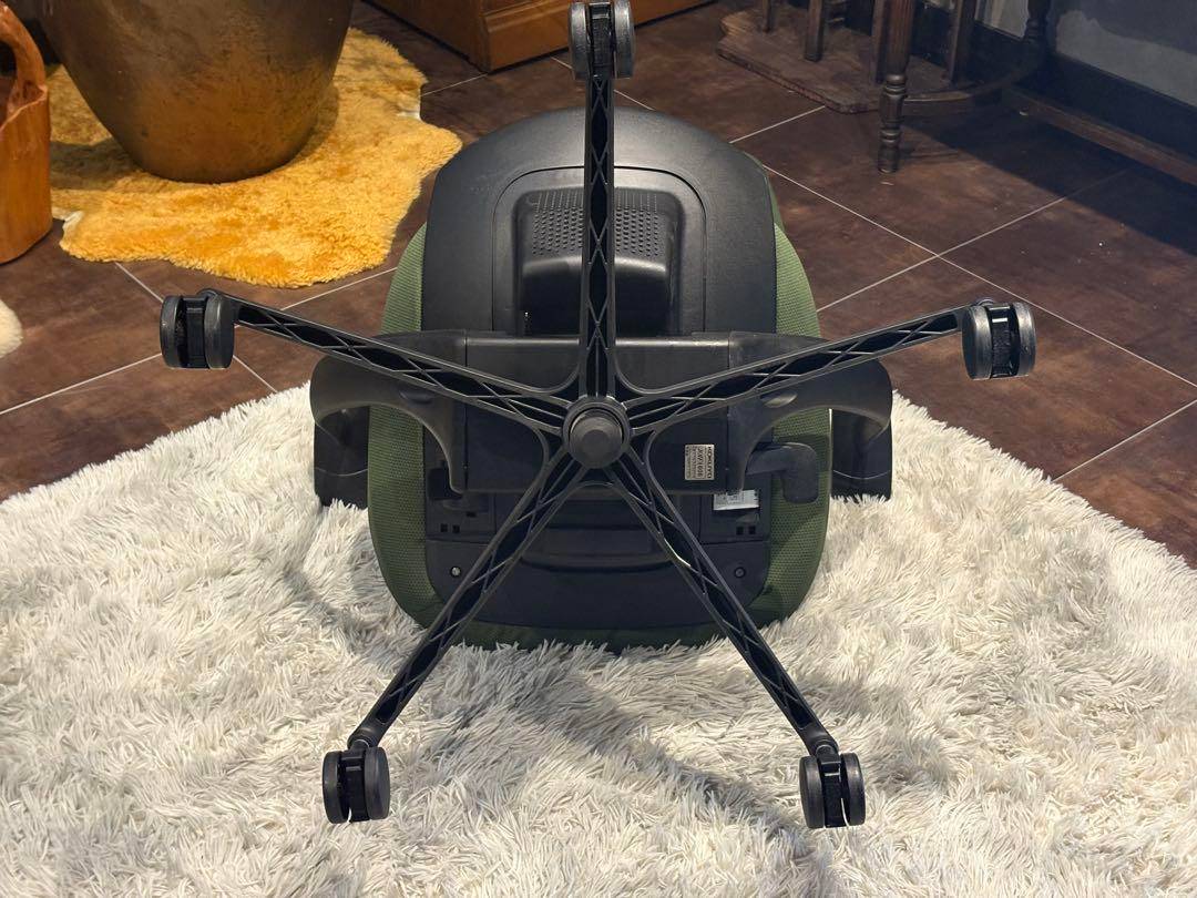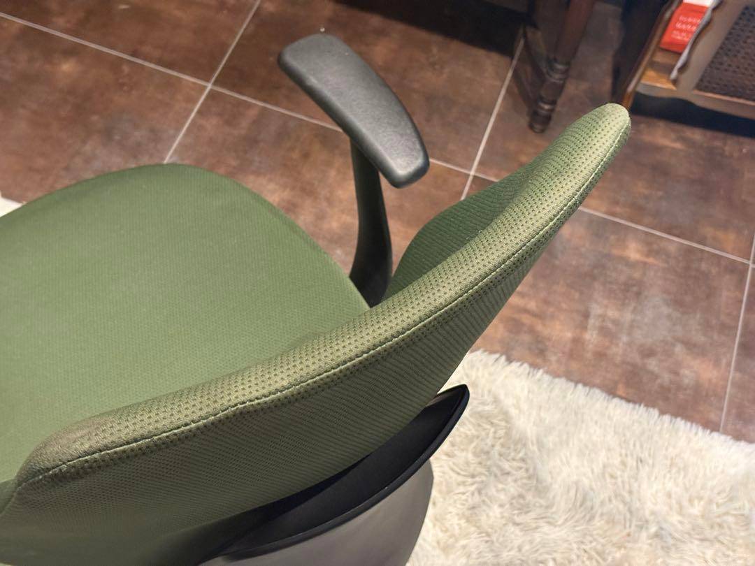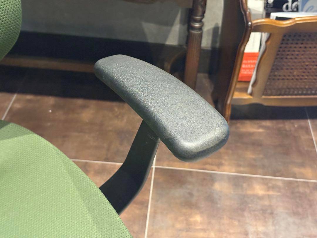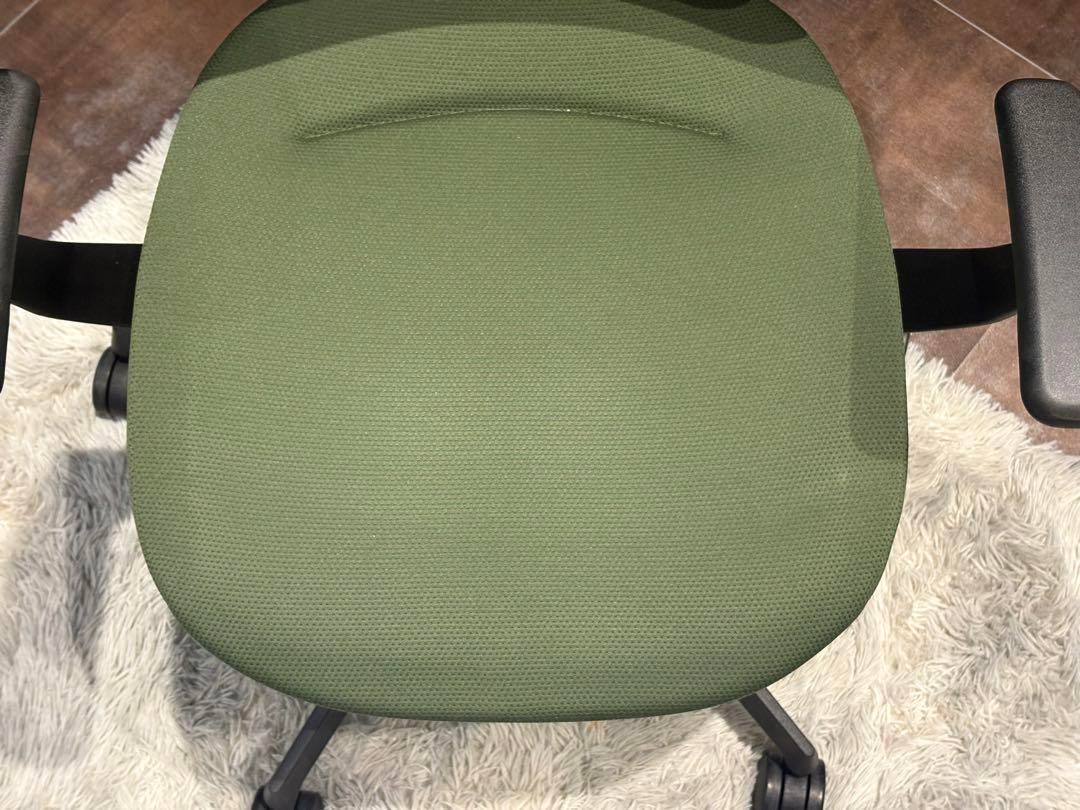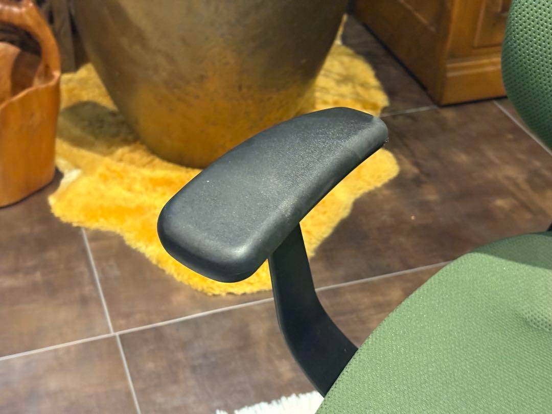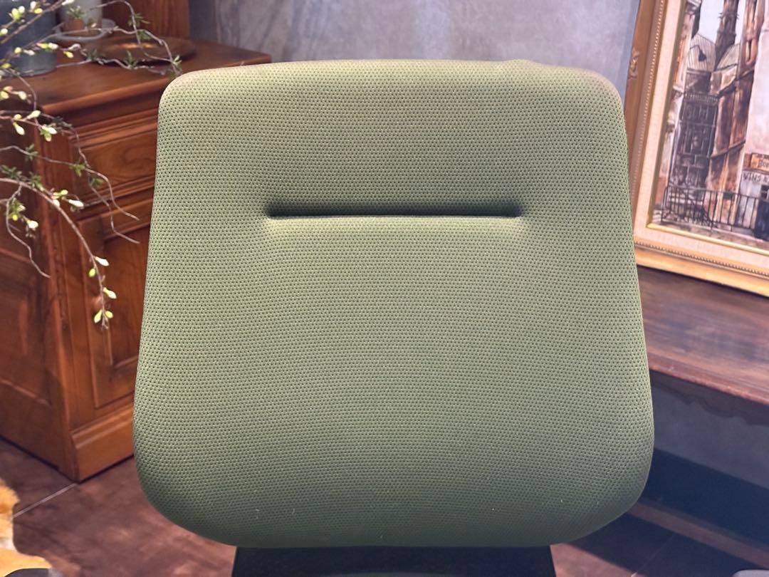 シンプルながら機能性に優れたオフィスチェアで、背もたれと座面にはグリーンのファブリックを使用。