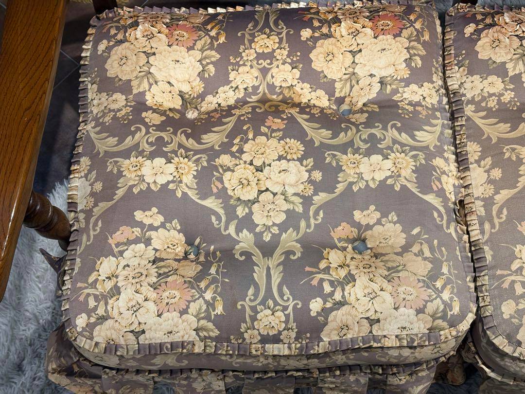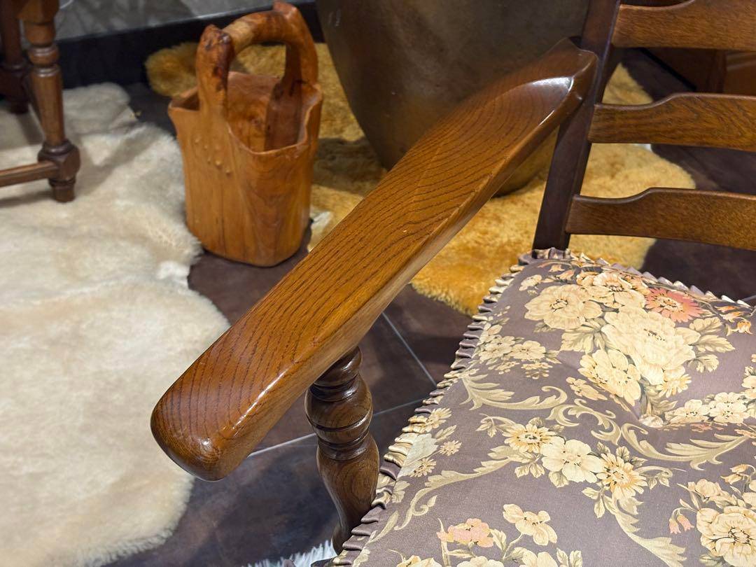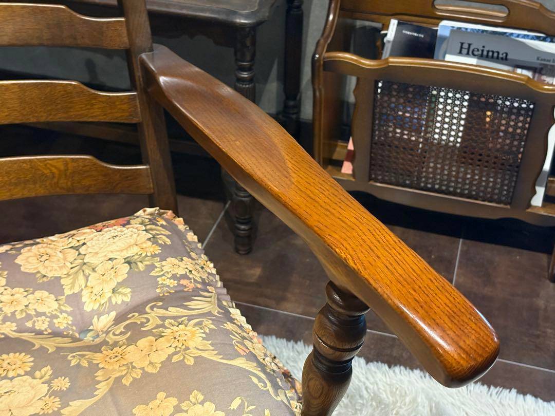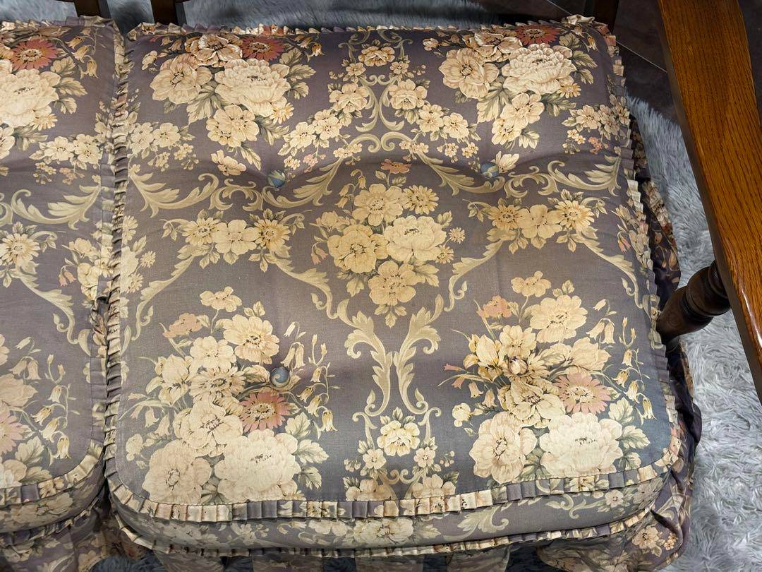 クラシカルなデザインのアーム付きで、背面の格子デザインと、上品なフローラル柄のクッションが特徴です。