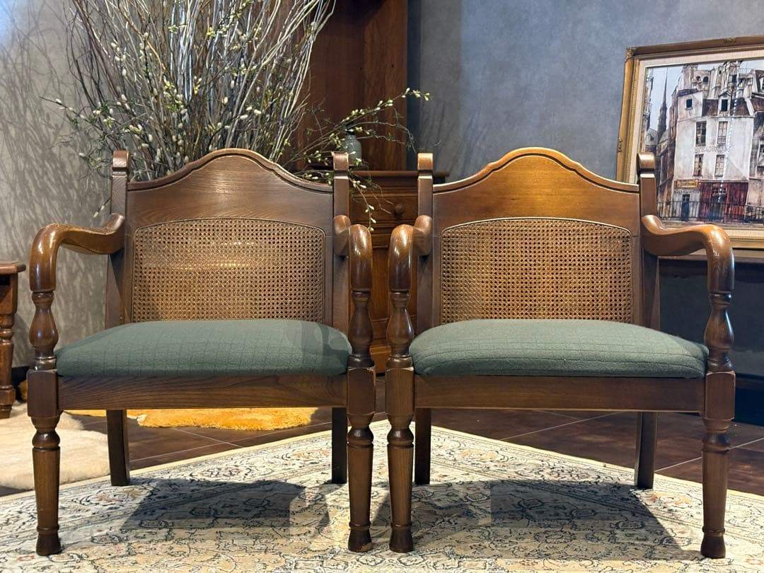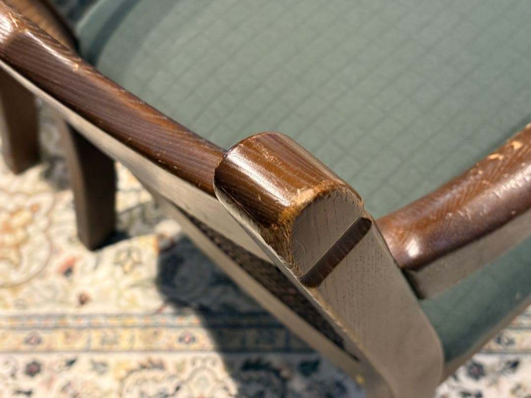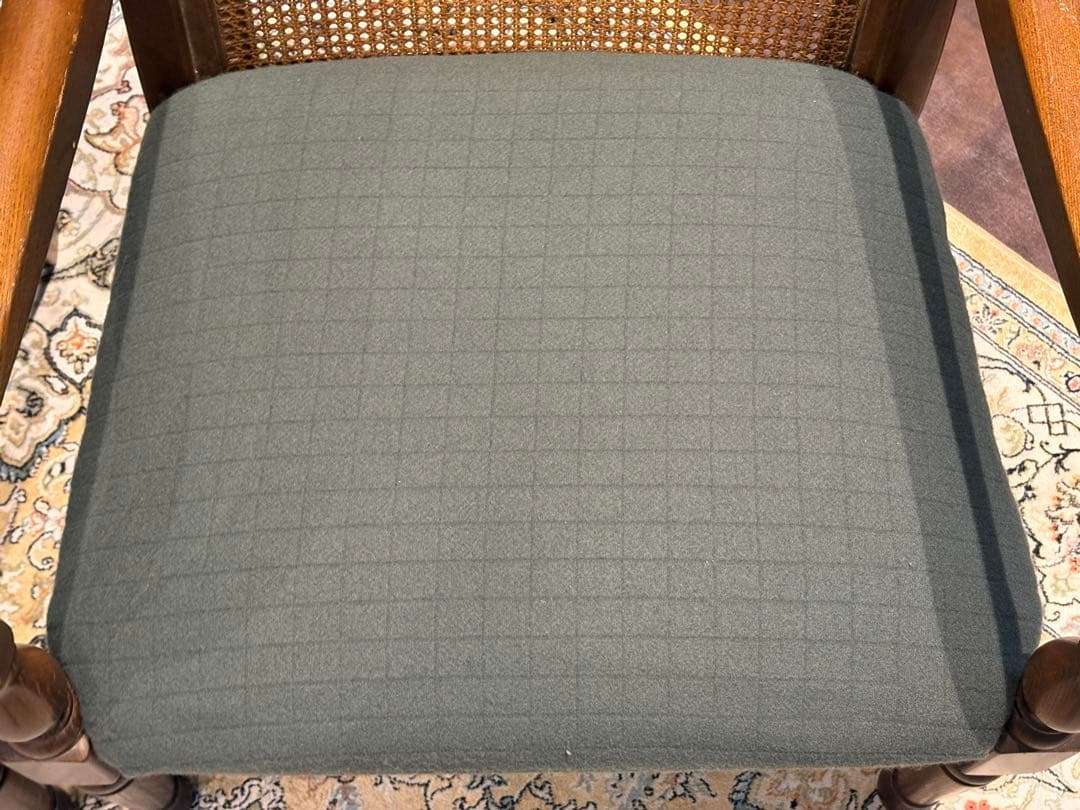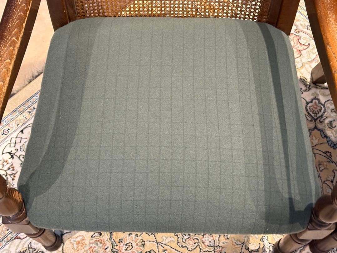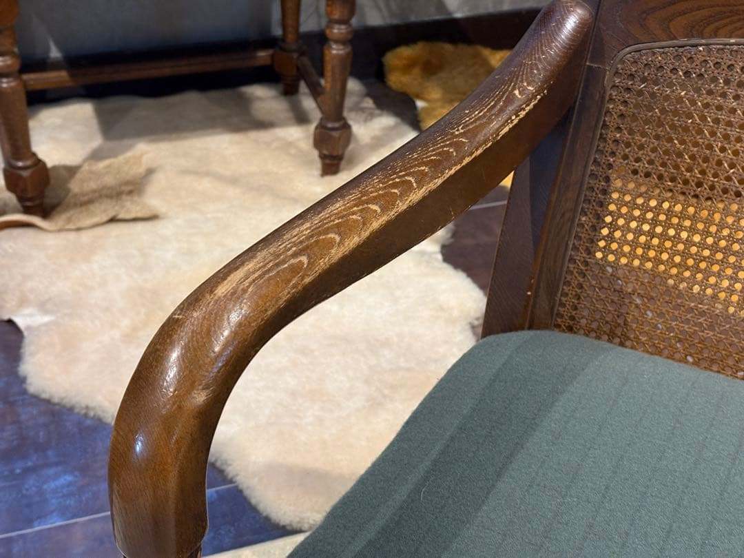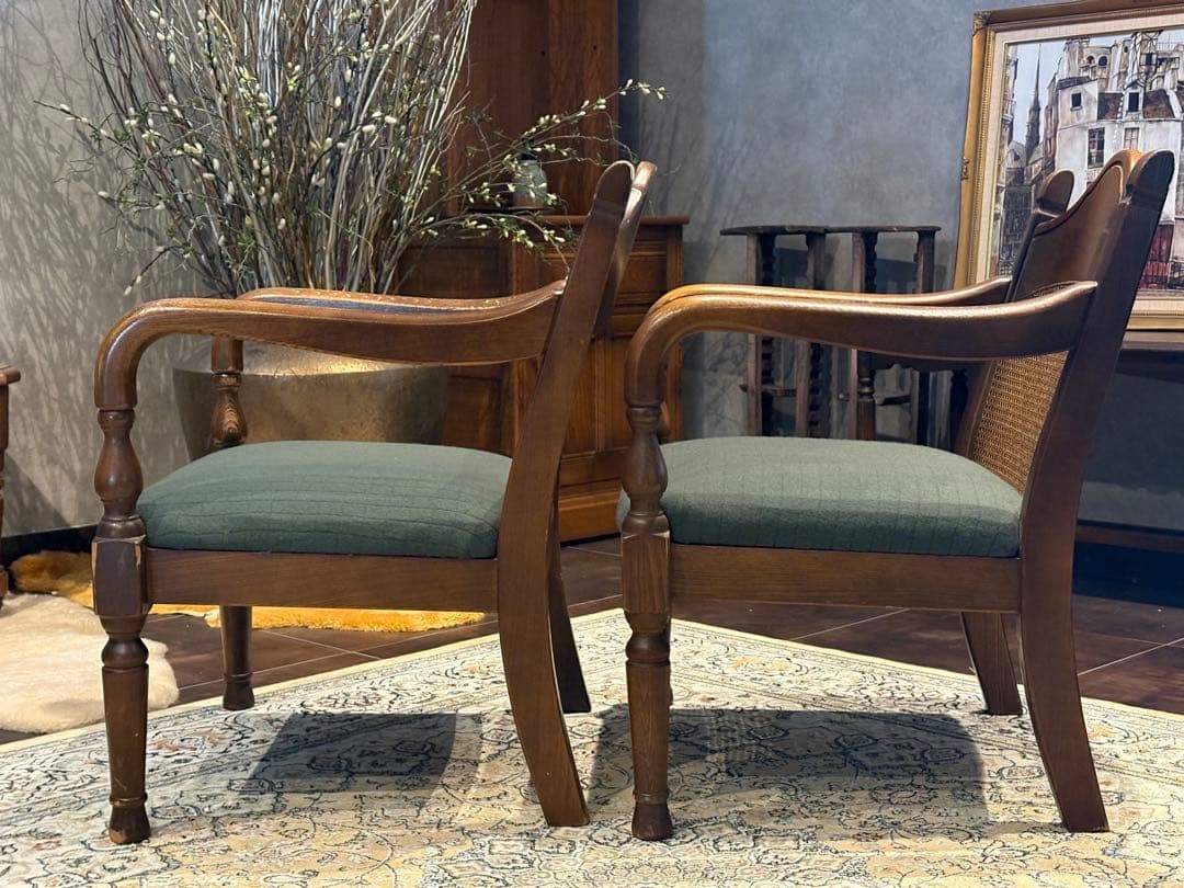座面は尾州生地でリメイクされており、落ち着いたグリーン系ファブリックがクラシックな木部と美しく調和しています。