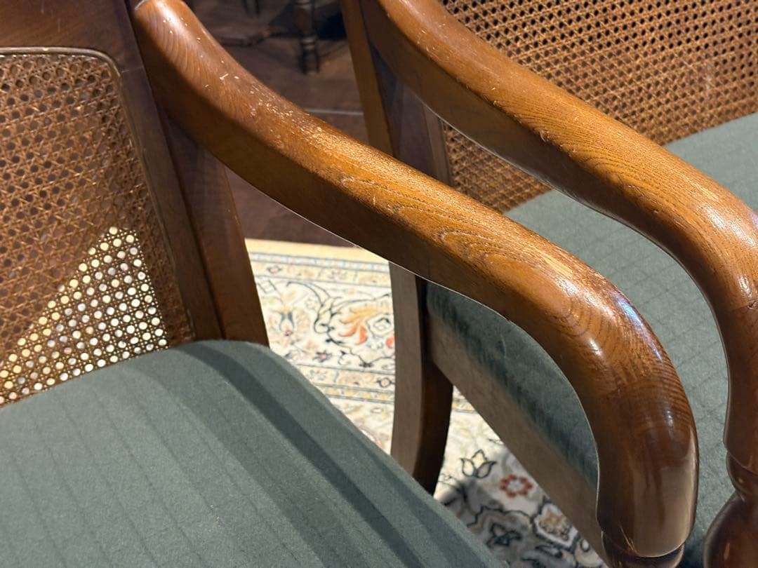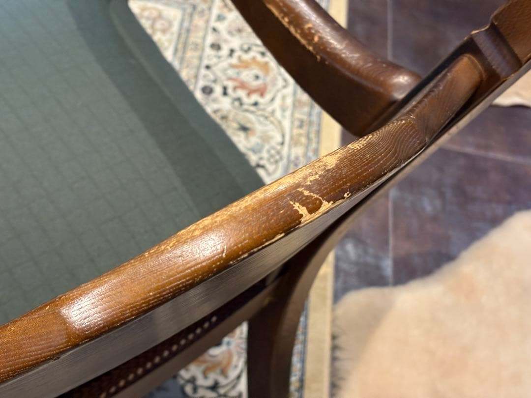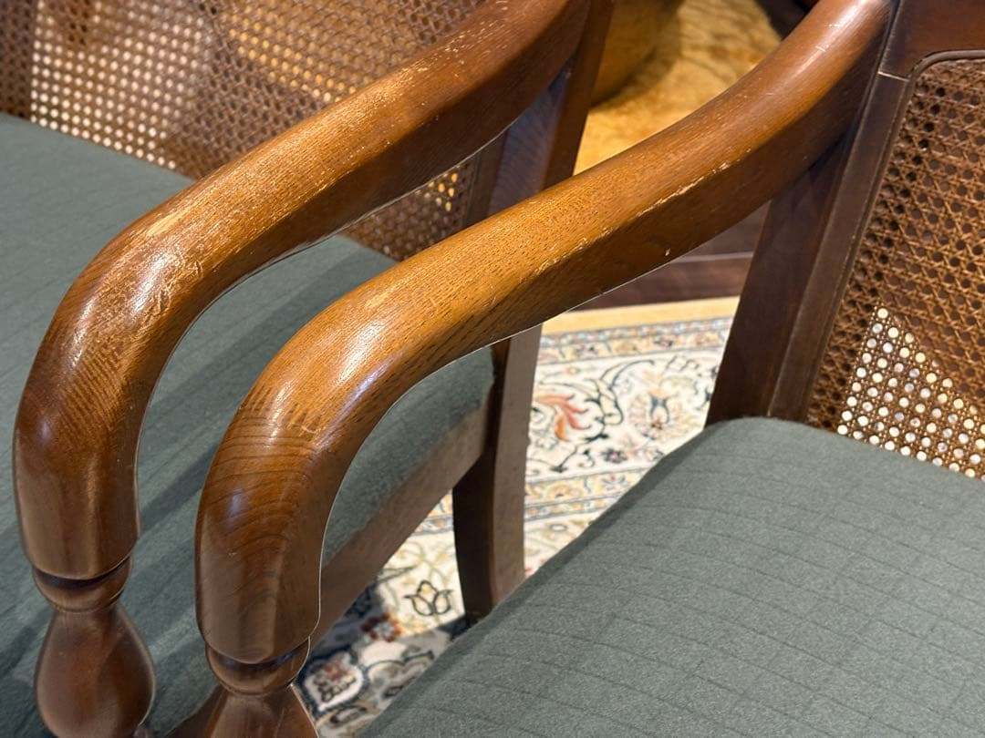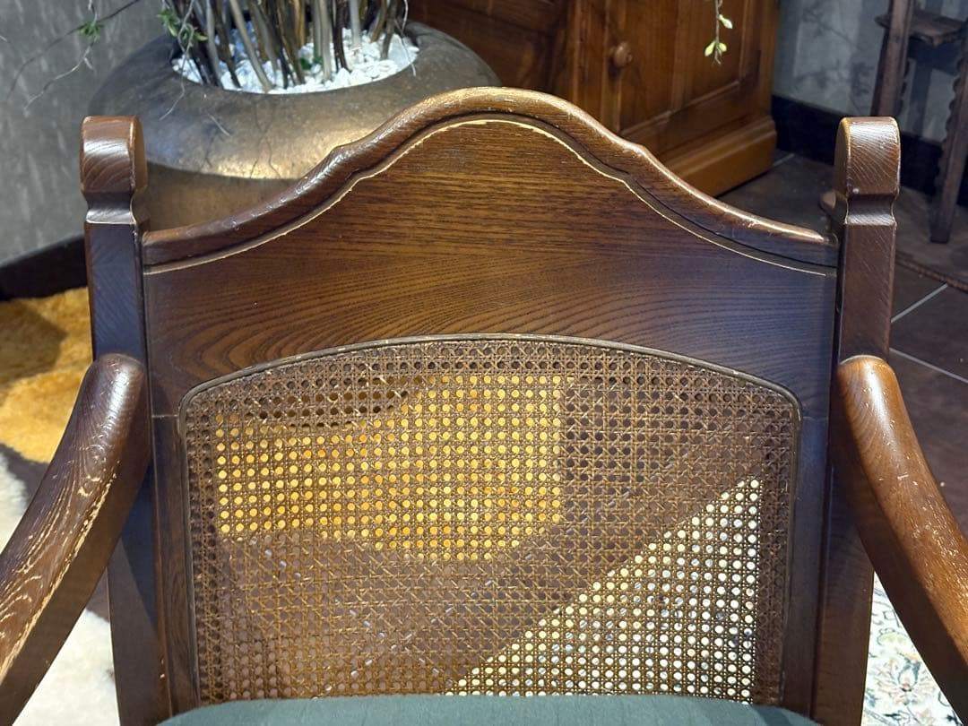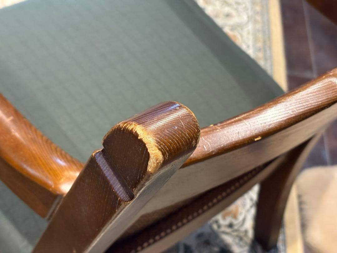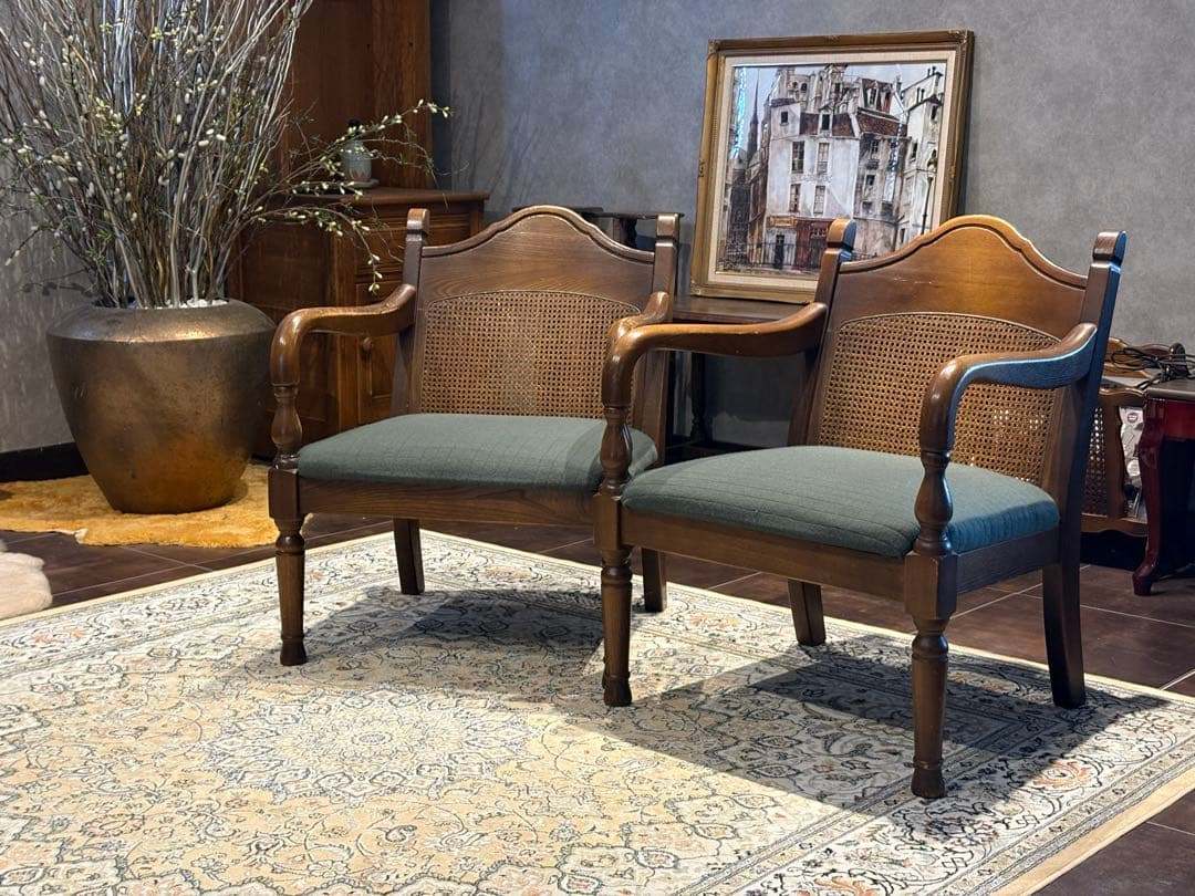 座面は尾州生地でリメイクされており、落ち着いたグリーン系ファブリックがクラシックな木部と美しく調和しています。