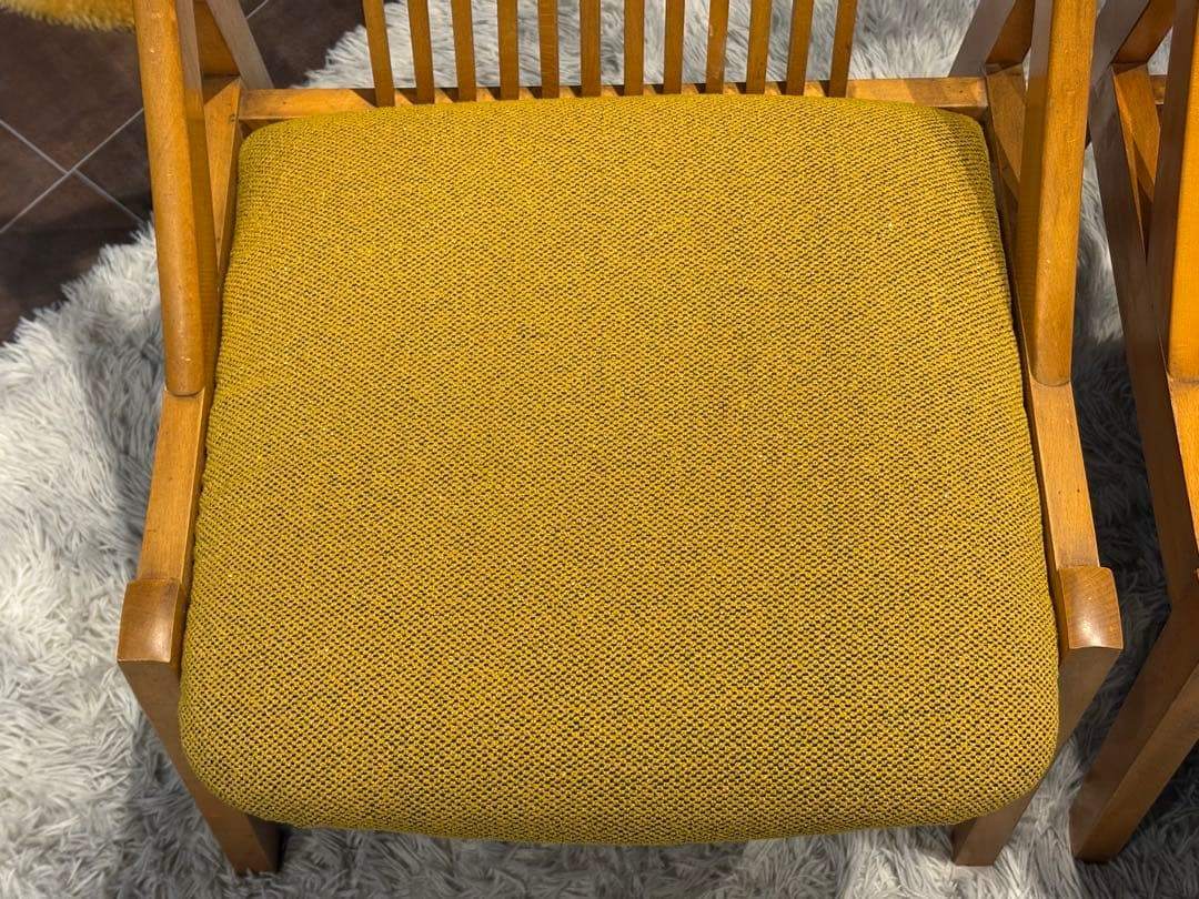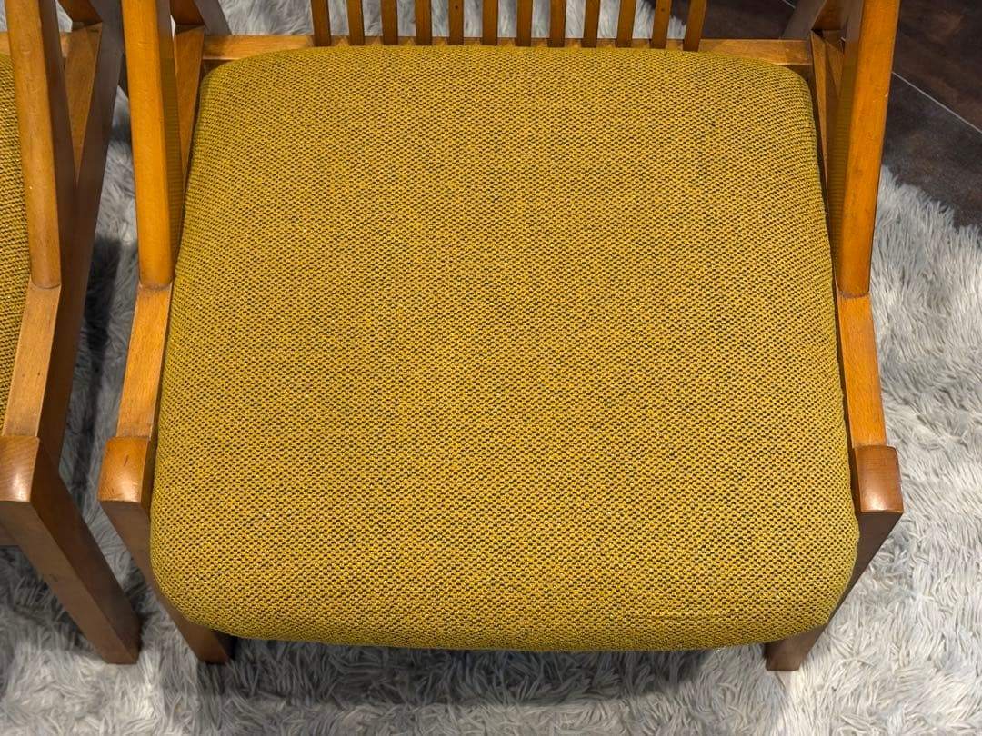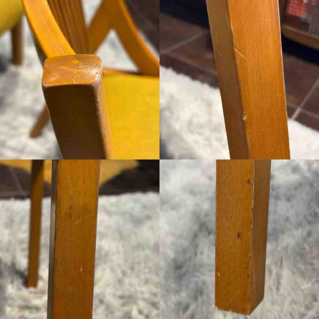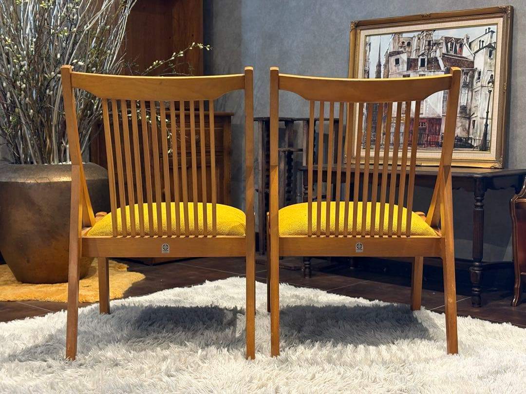 座面は尾州生地でリメイクされ、鮮やかなイエローのファブリックが空間に華やかさを添えます。
