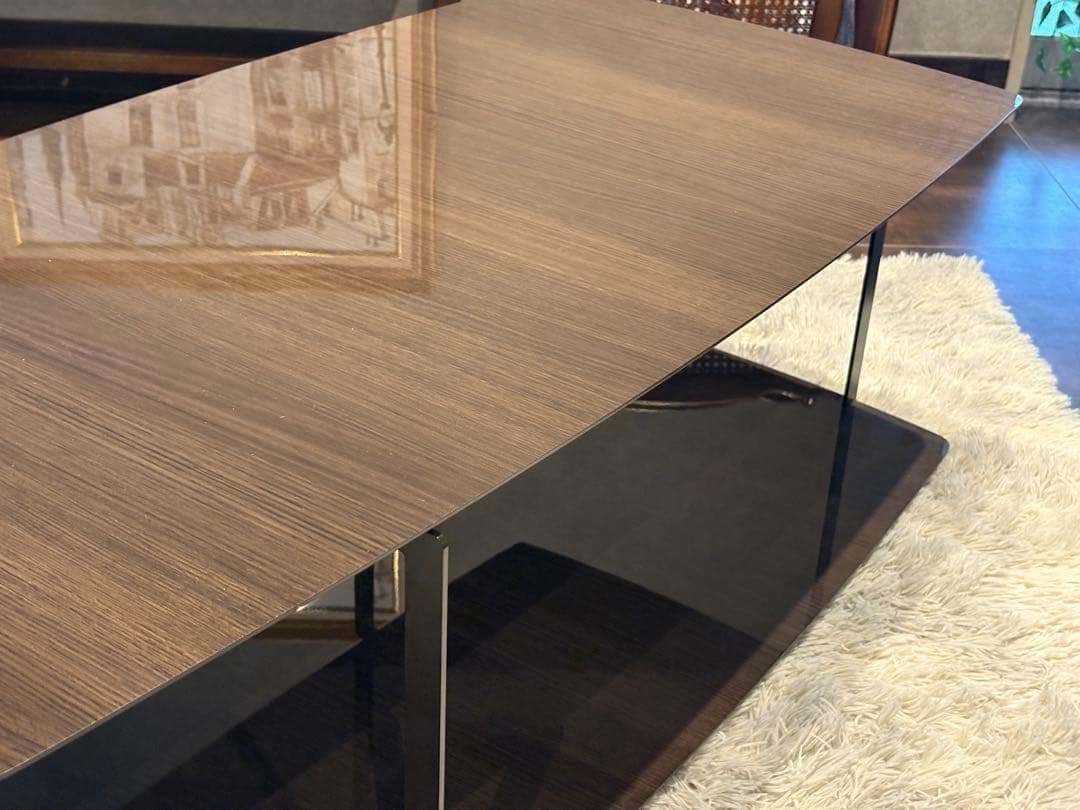 ガラスのような艶やかな天板と、直線的なスチール脚の組み合わせが、空間に洗練された印象を与えます。