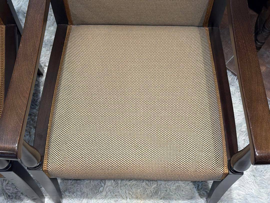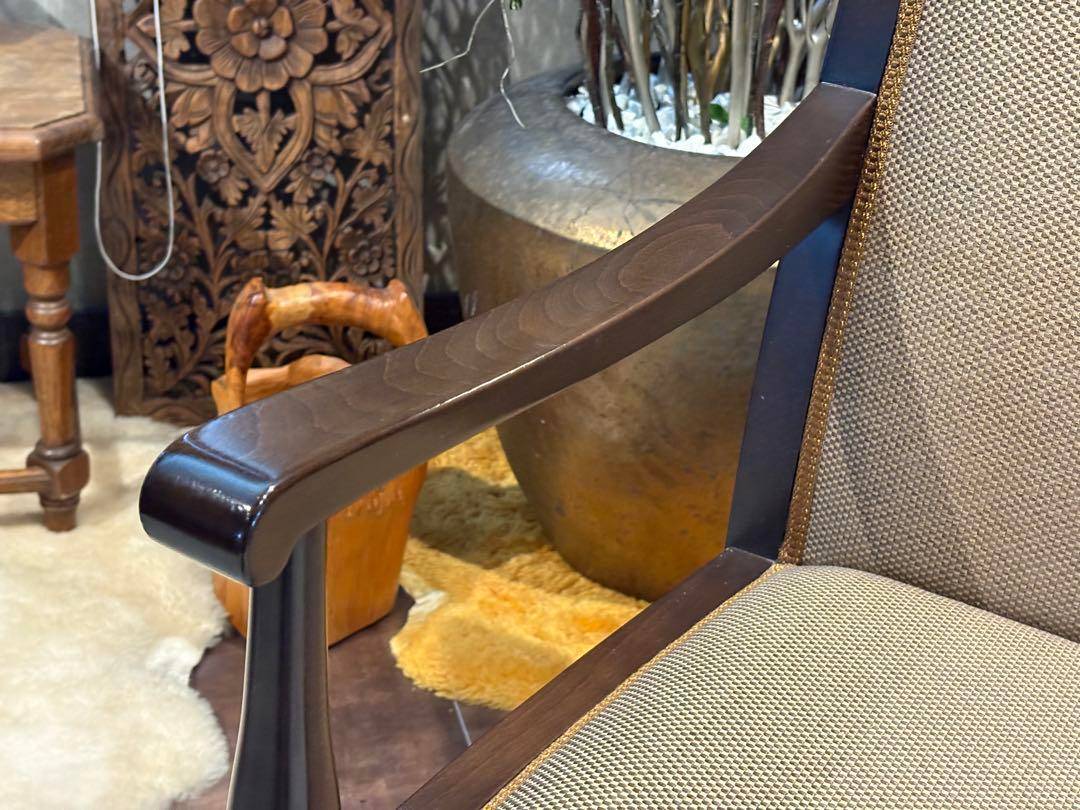 落ち着いた色調のファブリックと、端正なフレームラインが特徴的なヴィンテージのアームチェアです。