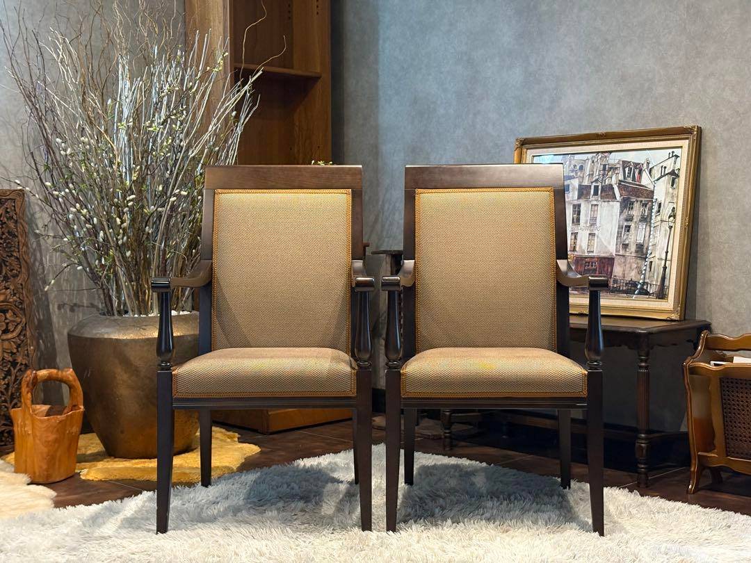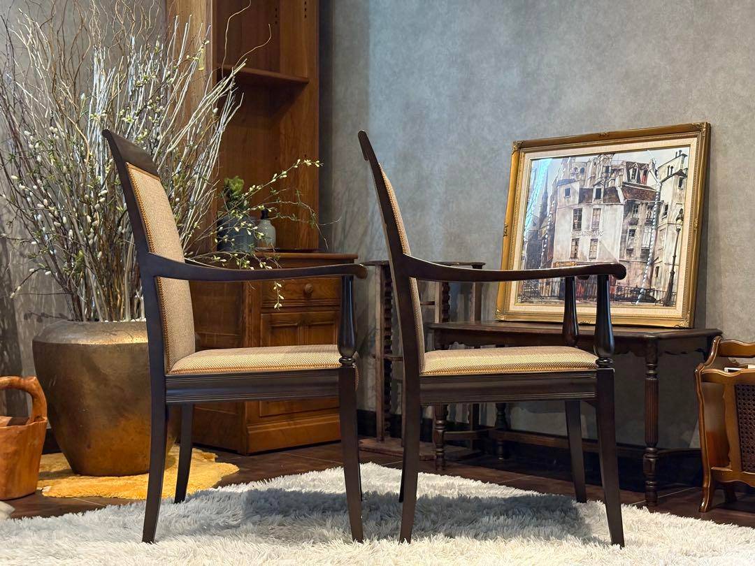 ゆったりとした背もたれと肘掛けが快適な座り心地を生み、ダイニングや応接スペースに品格を添えてくれる一脚です。